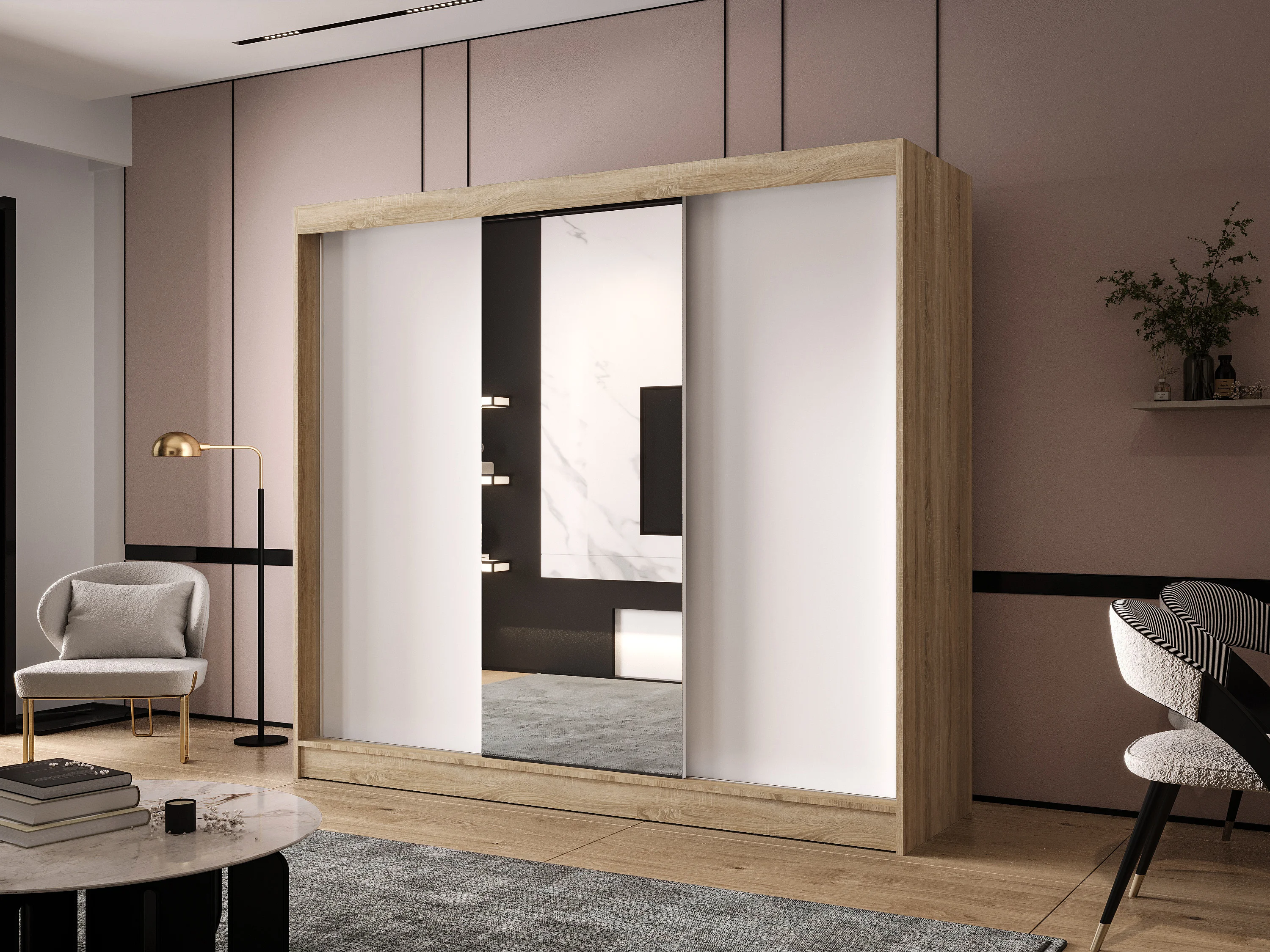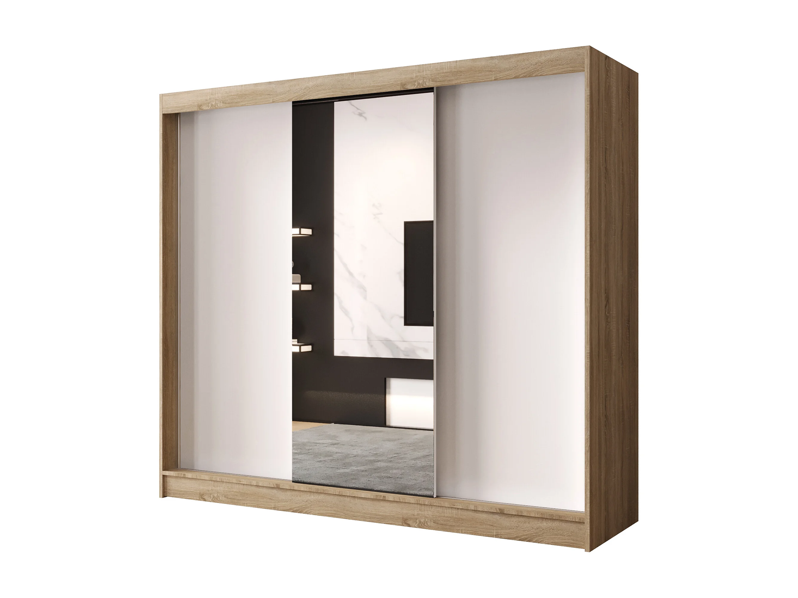 Dreitüriger Schiebeschrank mit Spiegel DALLAS DY1, Regalböden und Kleiderstange (Sonoma/Weiß)