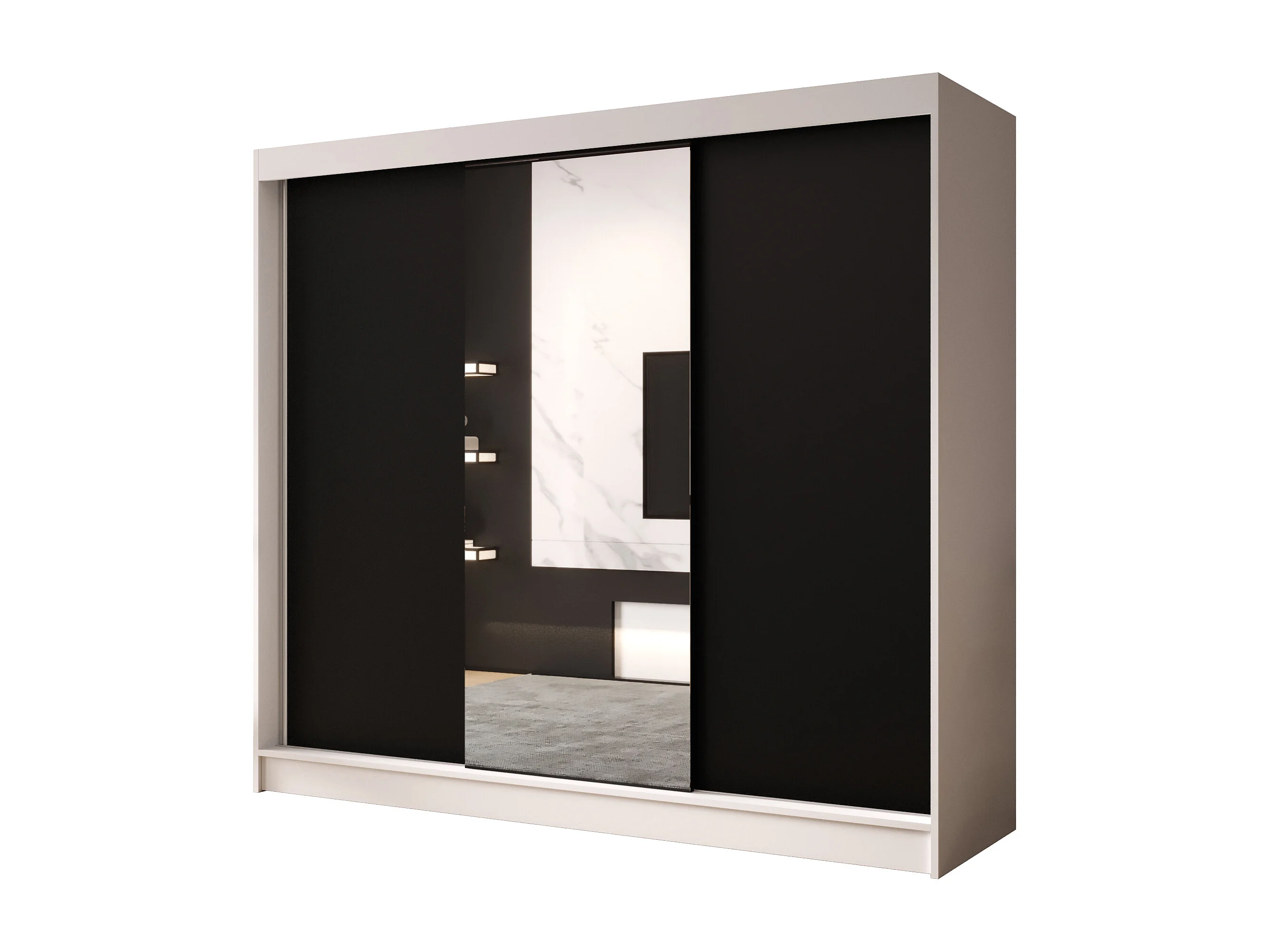 Dreitüriger Schiebeschrank mit Spiegel DALLAS DY1, Regalböden und Kleiderstange (Weiß/Schwarz)