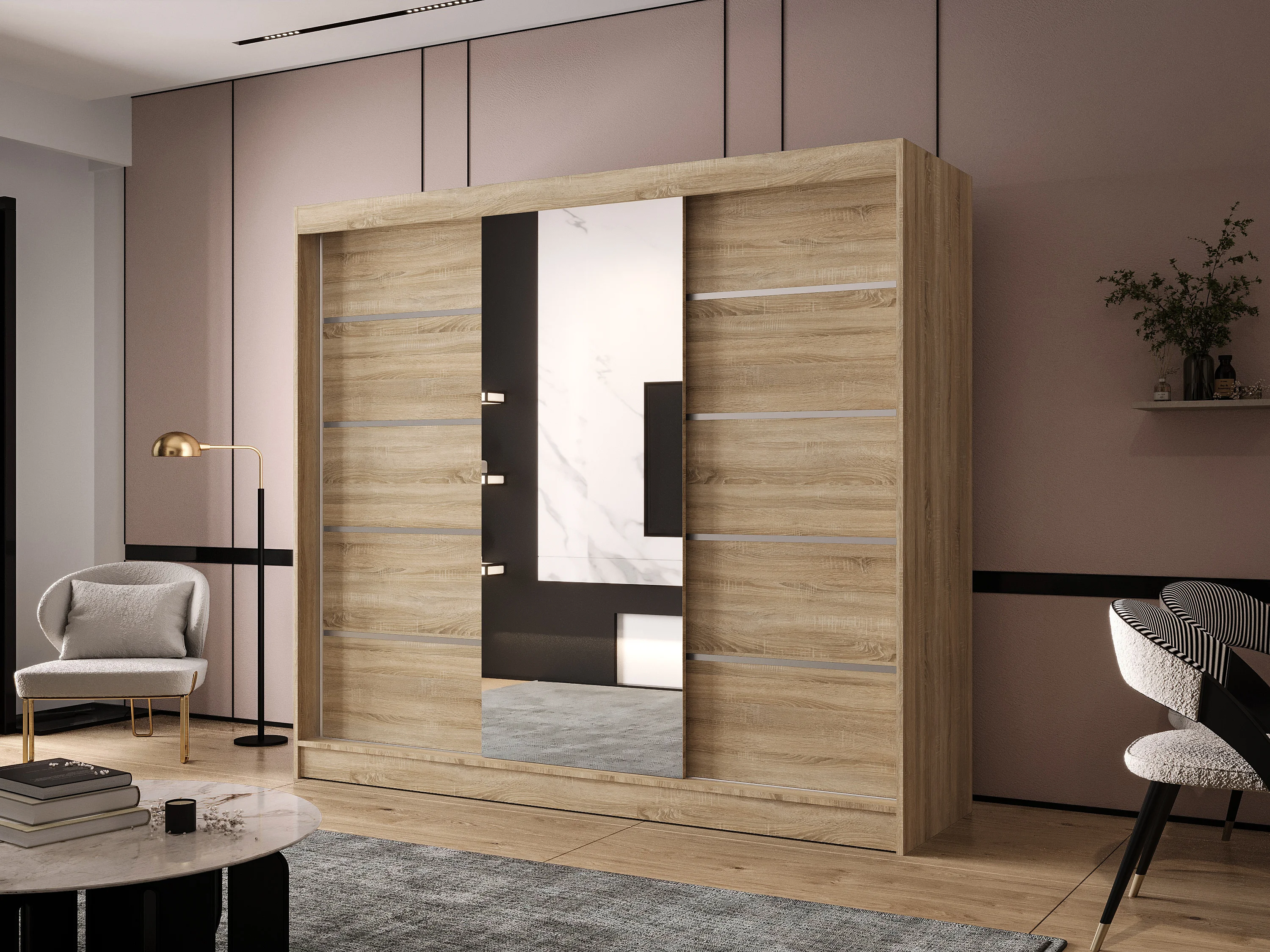 Dreitüriger Schiebeschrank mit Spiegel DALLAS DY6, Regalböden und Kleiderstange (Sonoma)