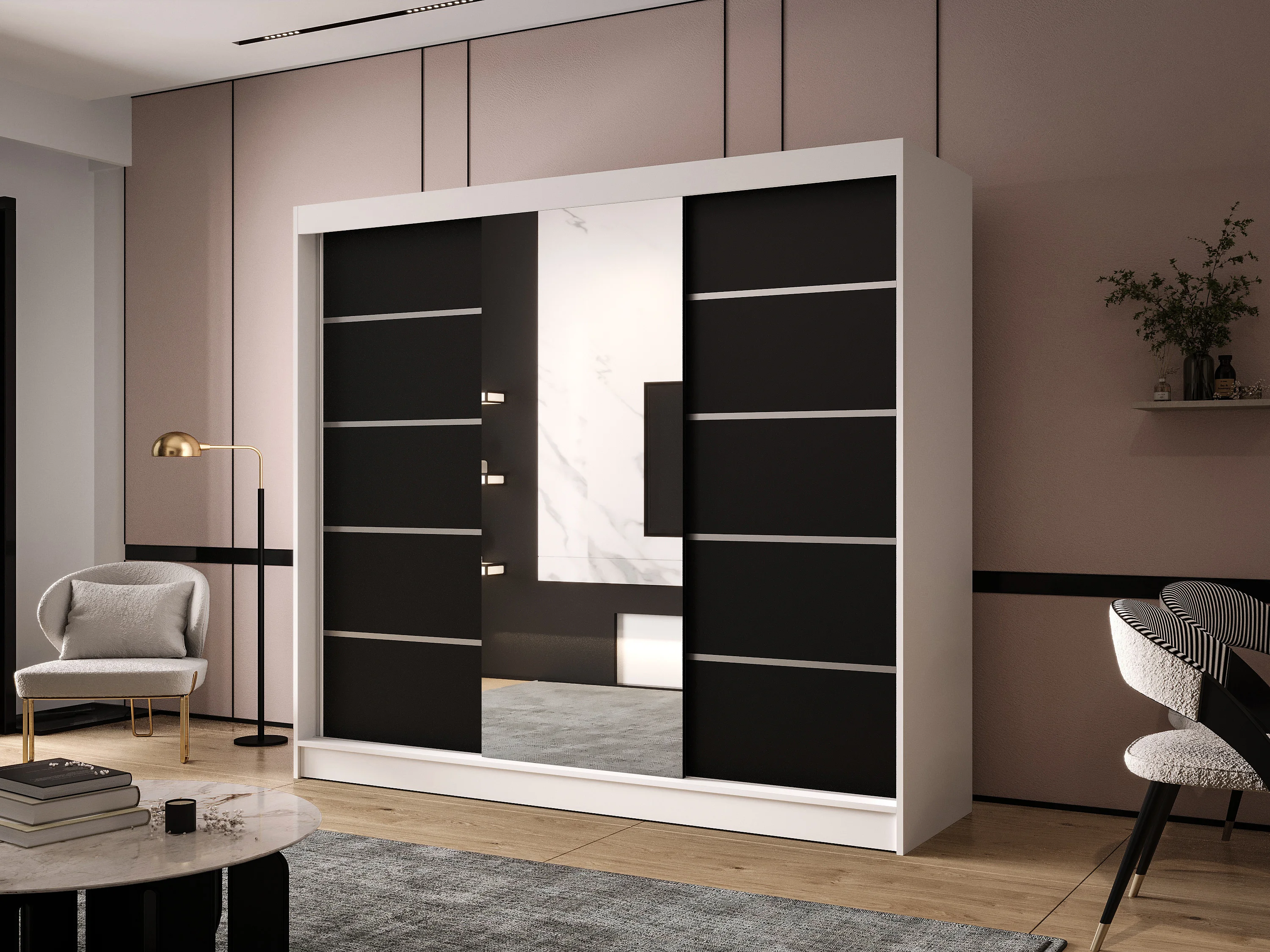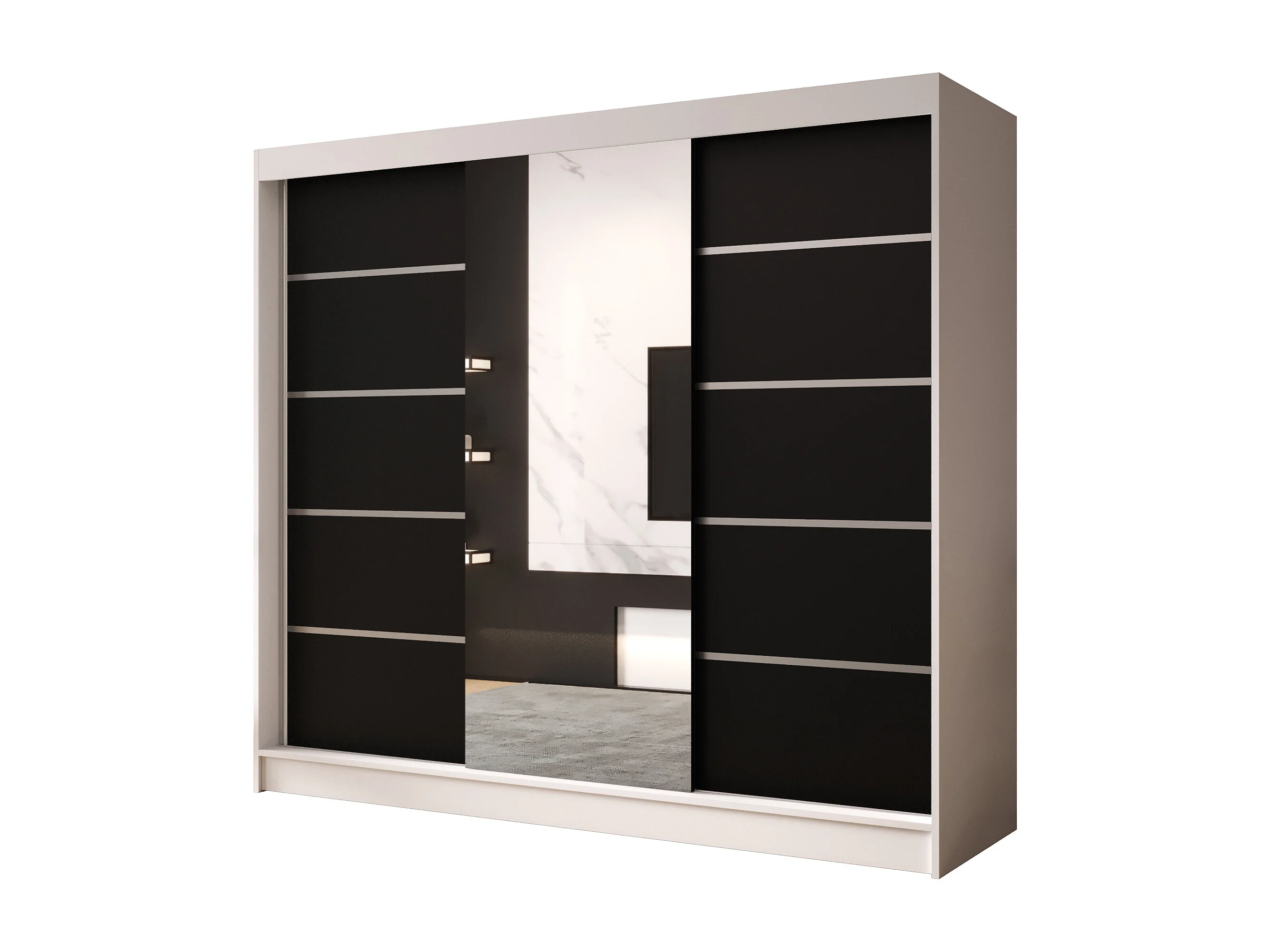 Dreitüriger Schiebeschrank mit Spiegel DALLAS DY6, Regalböden und Kleiderstange (Weiß/Schwarz)