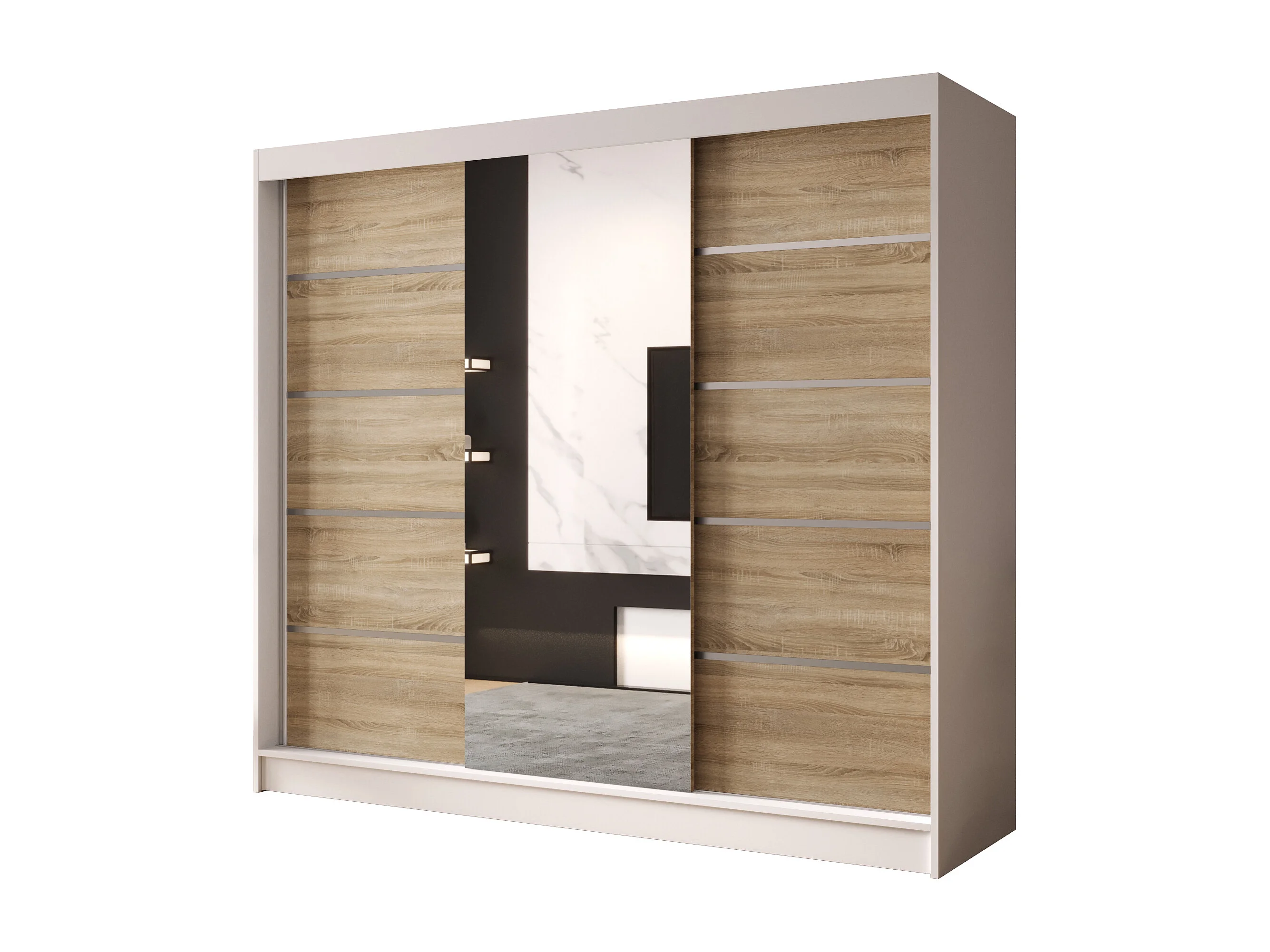 Dreitüriger Schiebeschrank mit Spiegel DALLAS DY6, Regalböden und Kleiderstange Weiß/Sonoma