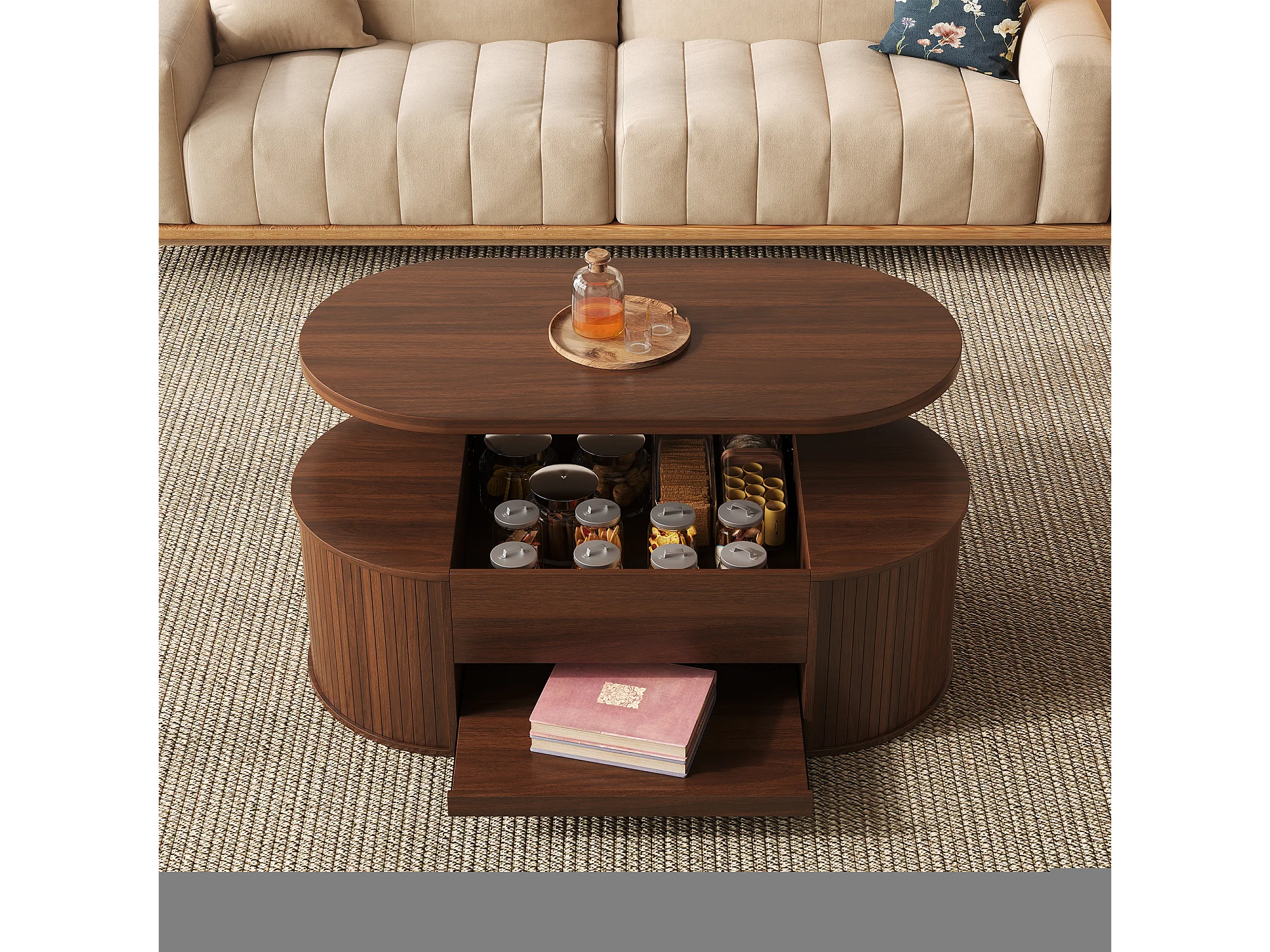 Dunkler Couchtisch aus Holz mit anhebbarer Platte und ausziehbarer Ablage – ideal für Wohn- und Arbeitszimmer