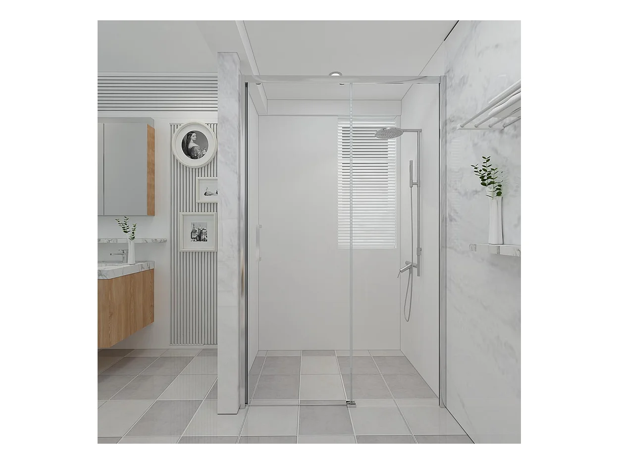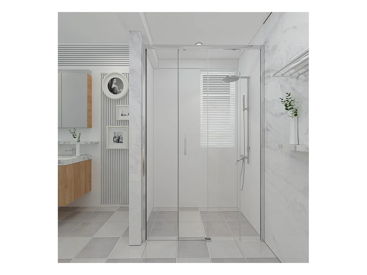Duschabtrennung 125 cm Wand mit erleichtertem Eingang mit einer festen Glasscheibe und einer Schiebetür, Höhe 200 cm