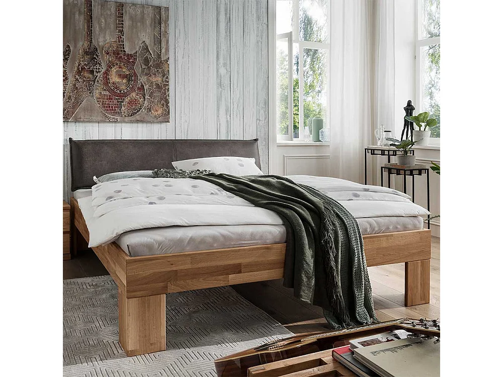 Echtholzbett mit Kopfpolster aus Wildeiche Massivholz geölt