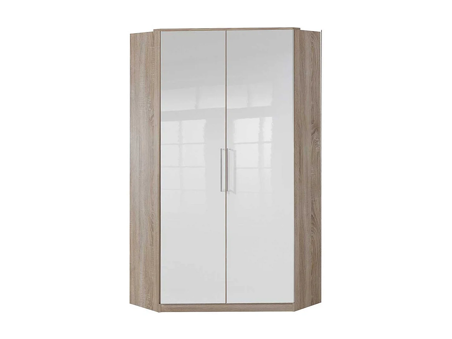 Eckkleiderschrank Hochglanz Front in Weiß Eiche Sägerau