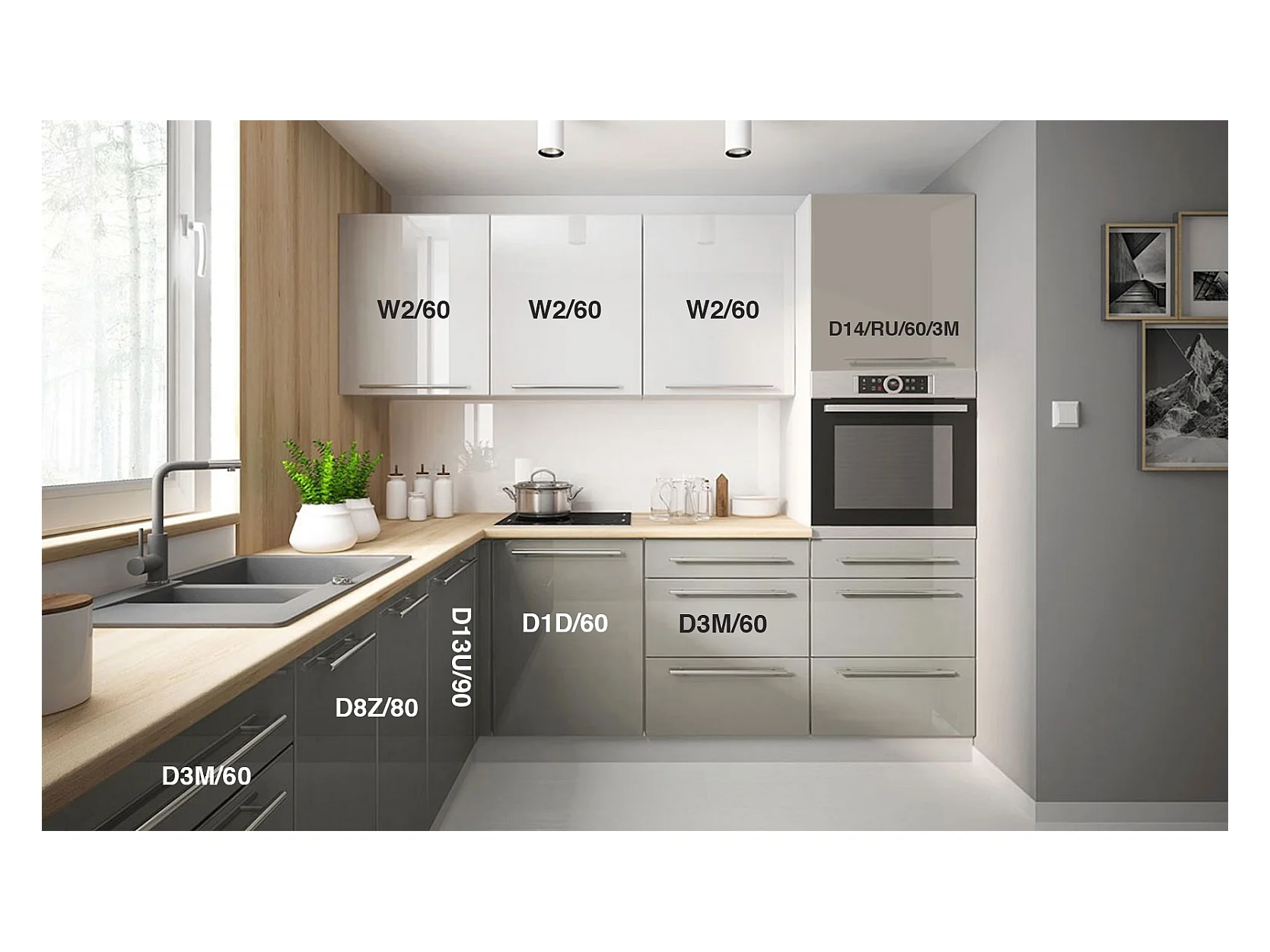 WINKELKÜCHE Brerra grau / verkehrsweiß-seidengrau hochglanz 9-teilig