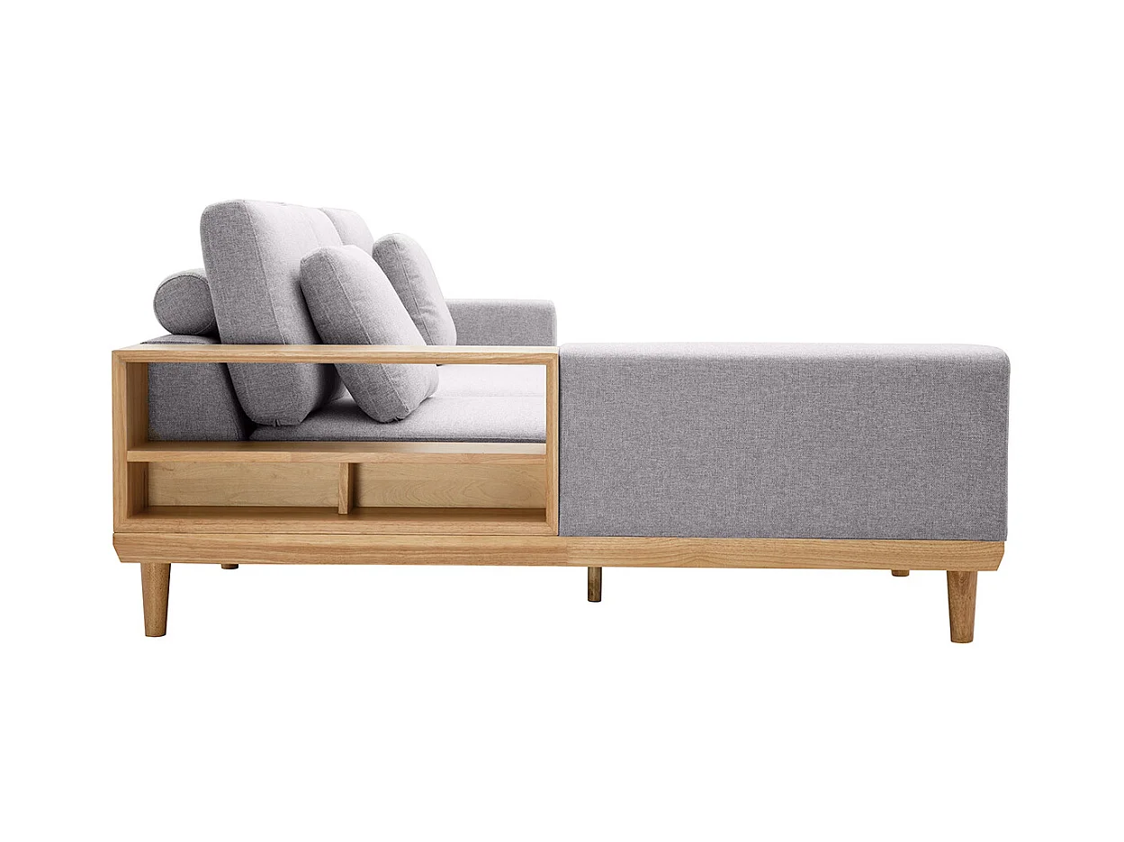 Ecksofa 5-Sitzer mit Stauraum hellgrauer Stoff mit strukturiertem Samteffekt und helles Holz KOMAO.