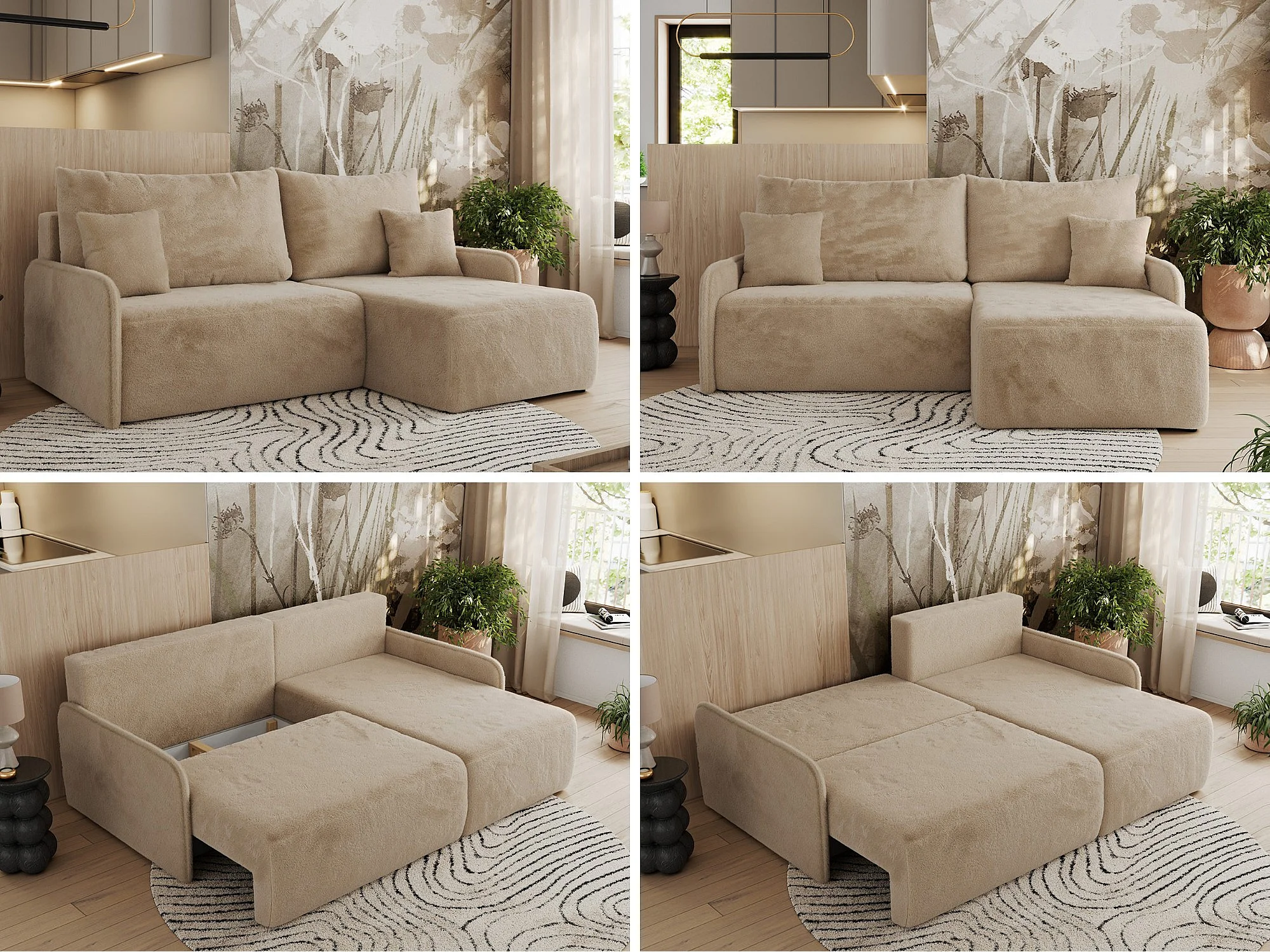 Ecksofa ARPA - L-form Schlaffsofa, Bettkasten und lose Kissen, Armlehnen - Beige Plüsch - Ecke Rechts
