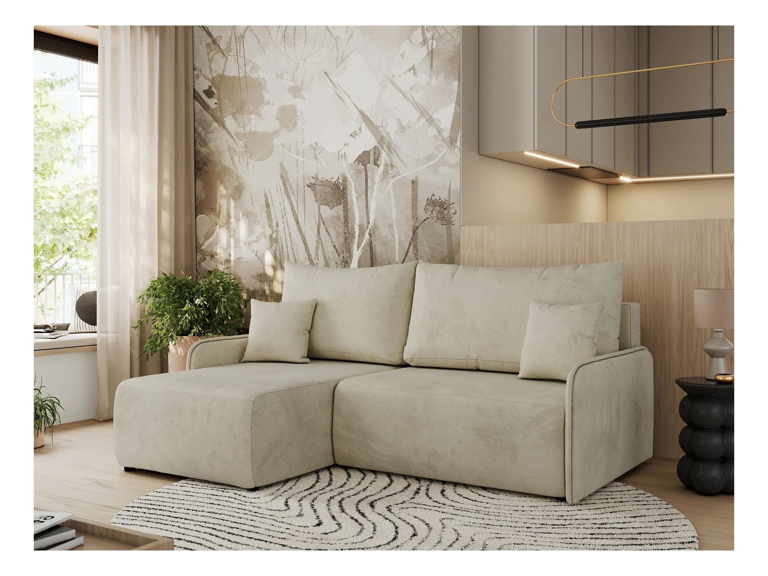 Ecksofa ARPA - L-form Schlaffsofa, Bettkasten und lose Kissen, Armlehnen - Beige Velvet - Ecke Links