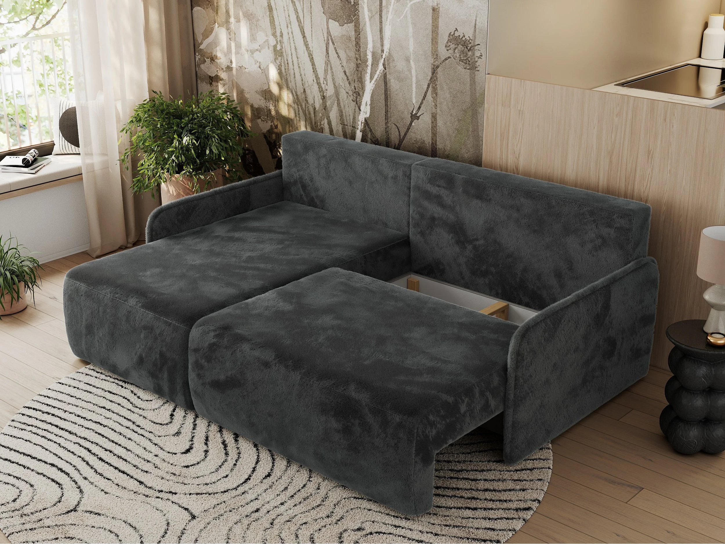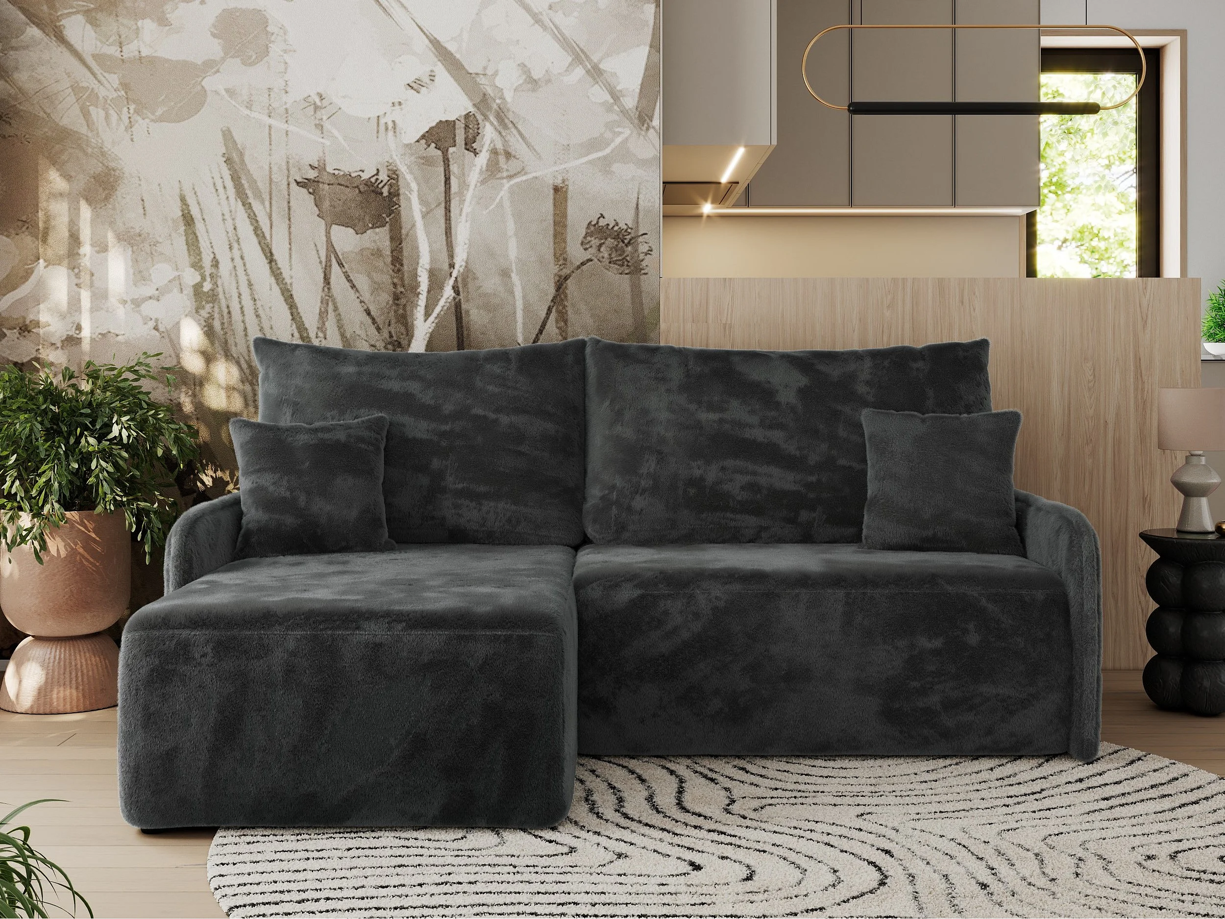Ecksofa ARPA - L-form Schlaffsofa, Bettkasten und lose Kissen, Armlehnen - Dunkelgrau Plüsch - Ecke Links