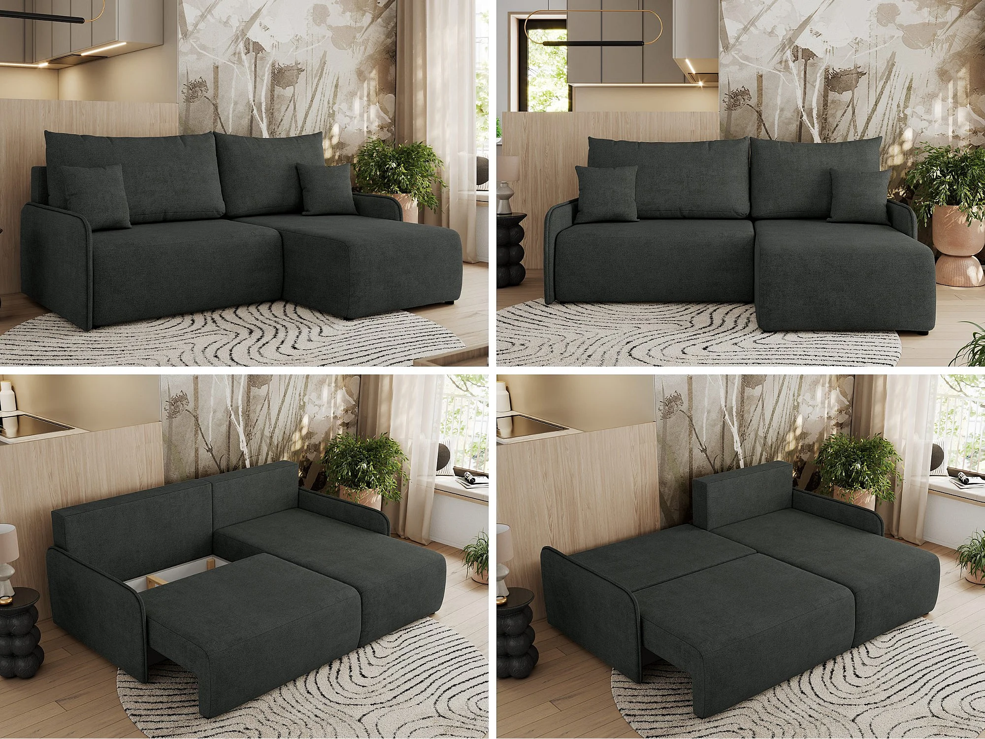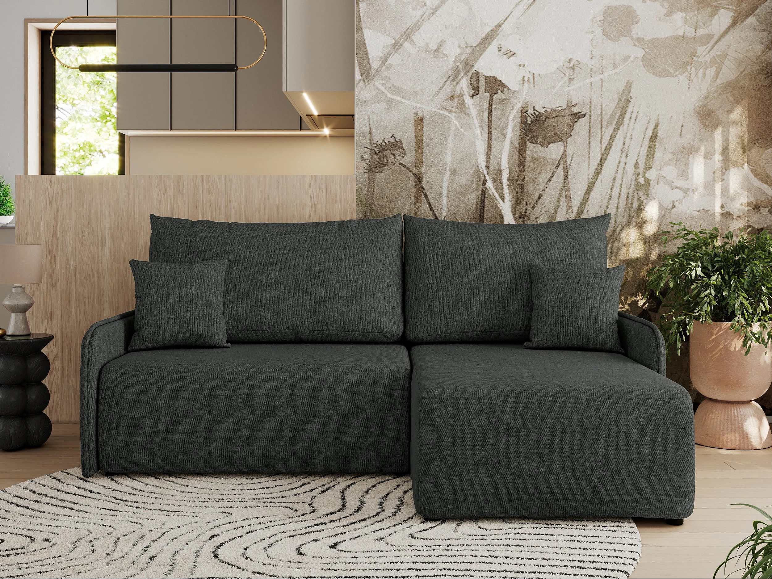 Ecksofa ARPA - L-form Schlaffsofa, Bettkasten und lose Kissen, Armlehnen - Dunkelgrau Struktur - Ecke Rechts