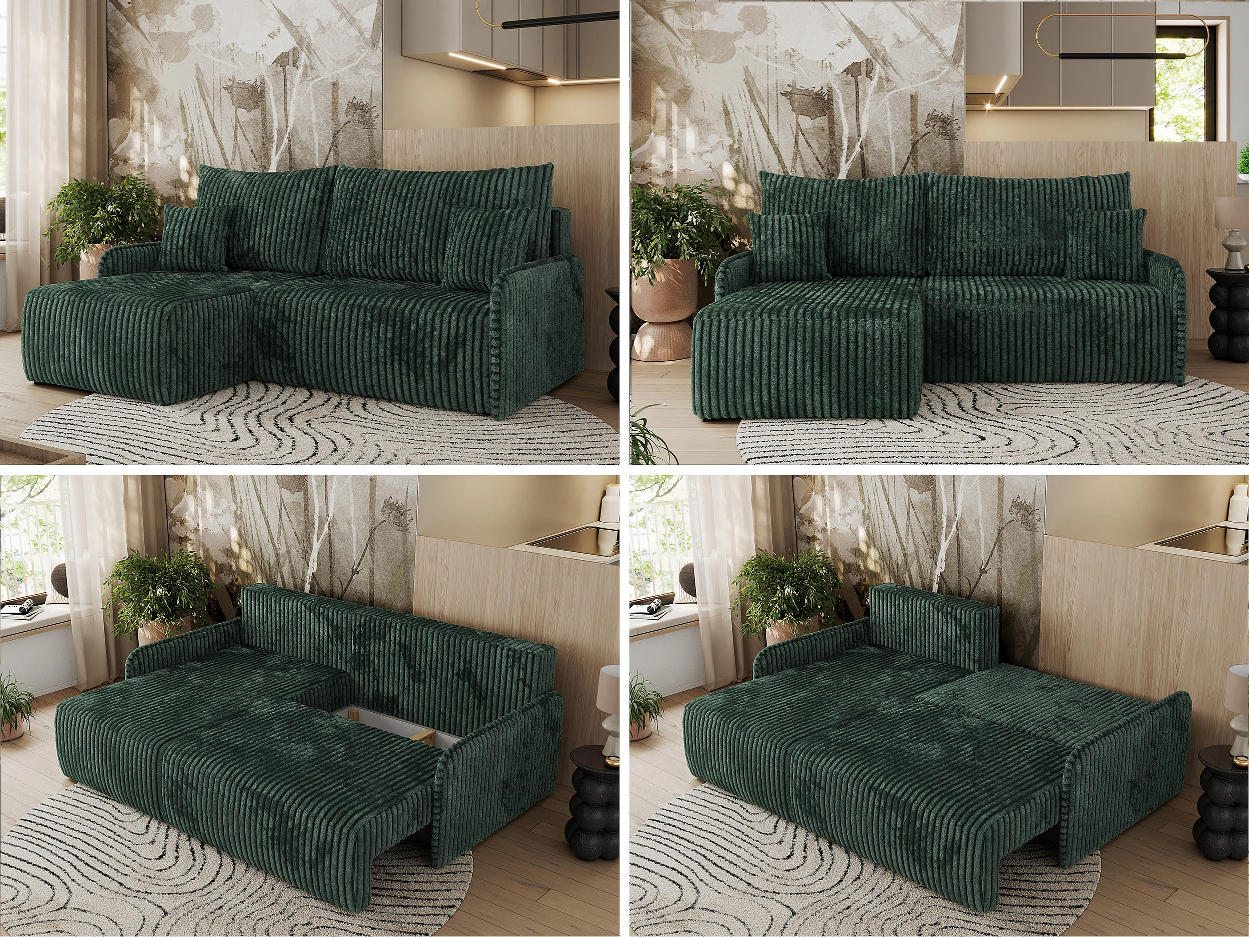 Ecksofa ARPA - L-form Schlaffsofa, Bettkasten und lose Kissen, Armlehnen - Grün Cord - Ecke Links
