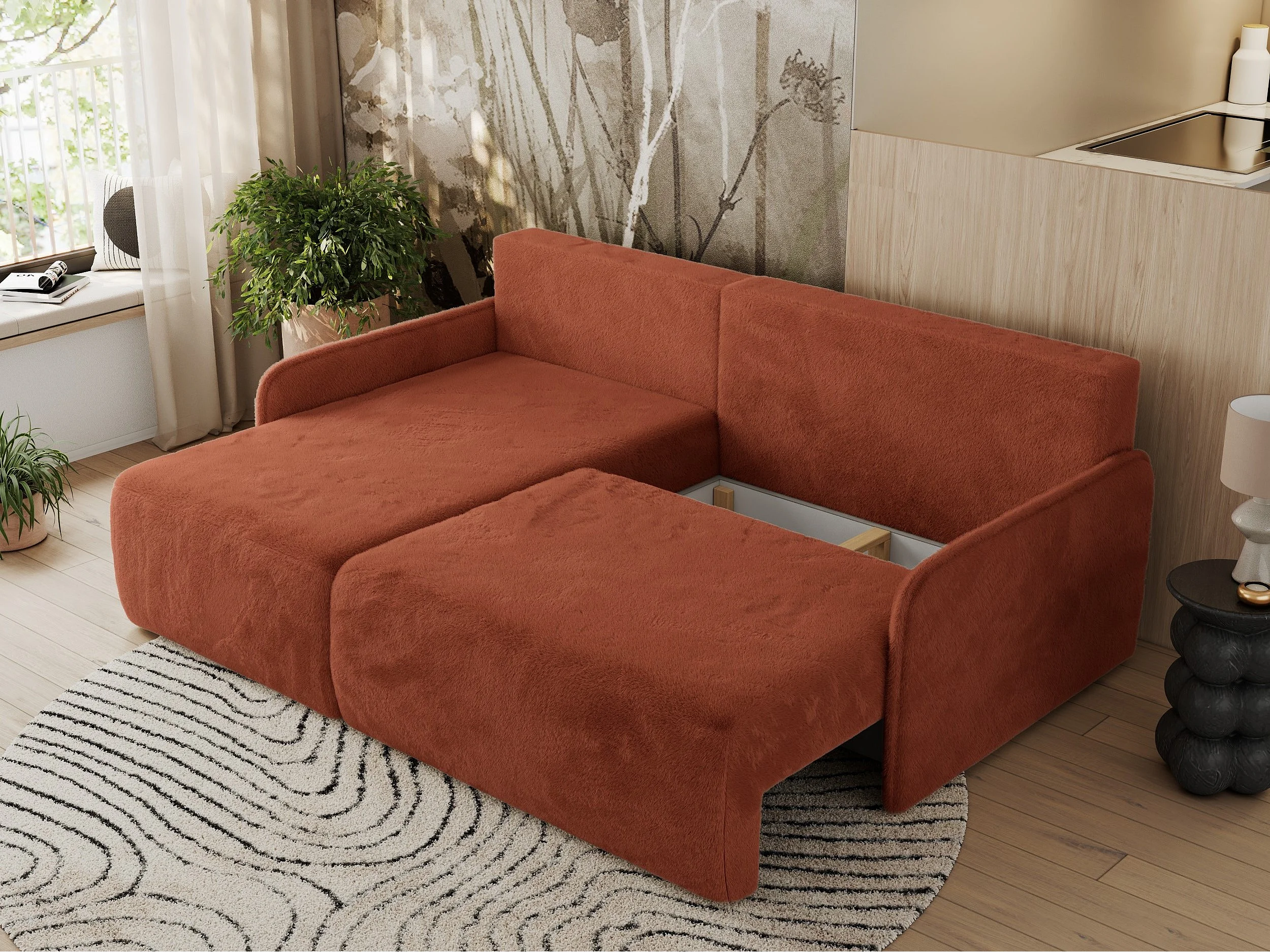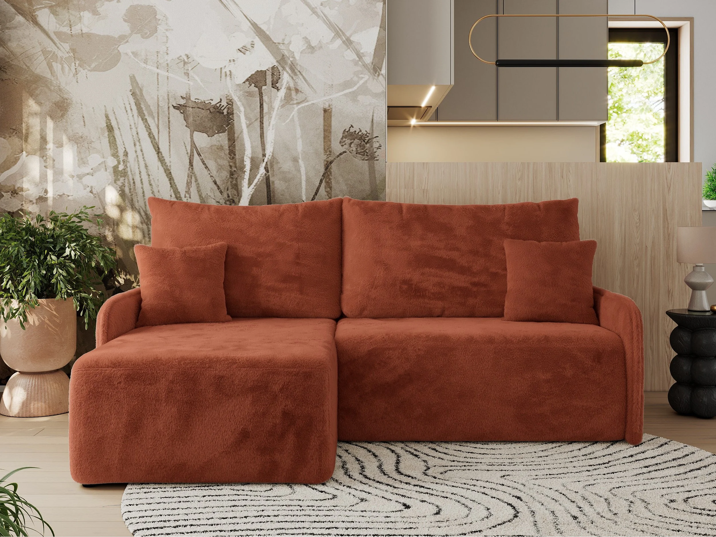 Ecksofa ARPA - L-form Schlaffsofa, Bettkasten und lose Kissen, Armlehnen - Orange Plüsch - Ecke Links
