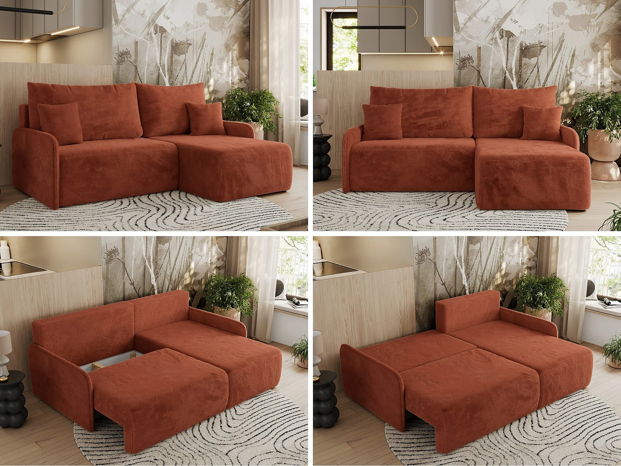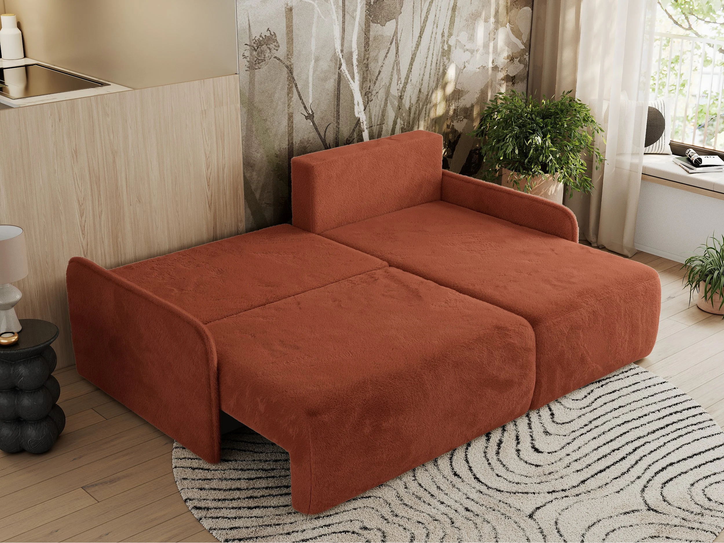 Ecksofa ARPA - L-form Schlaffsofa, Bettkasten und lose Kissen, Armlehnen - Orange Plüsch - Ecke Rechts