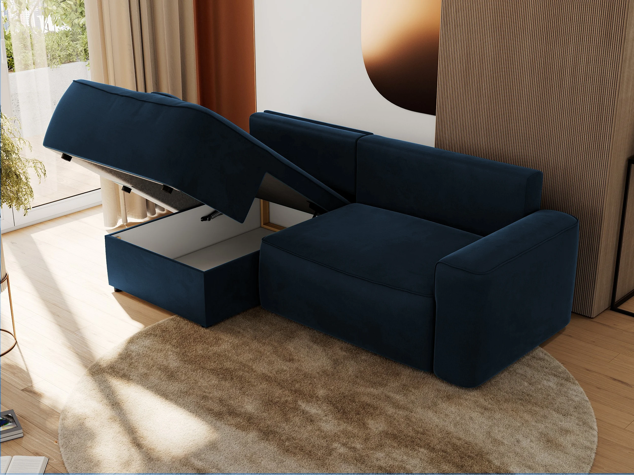 Ecksofa BELLUNO - Schlafsofa mit Bettkasten, Armlehnen, Couch L-form mit Schlaffunktion - Dunkelblau Velvet - Ecke Links