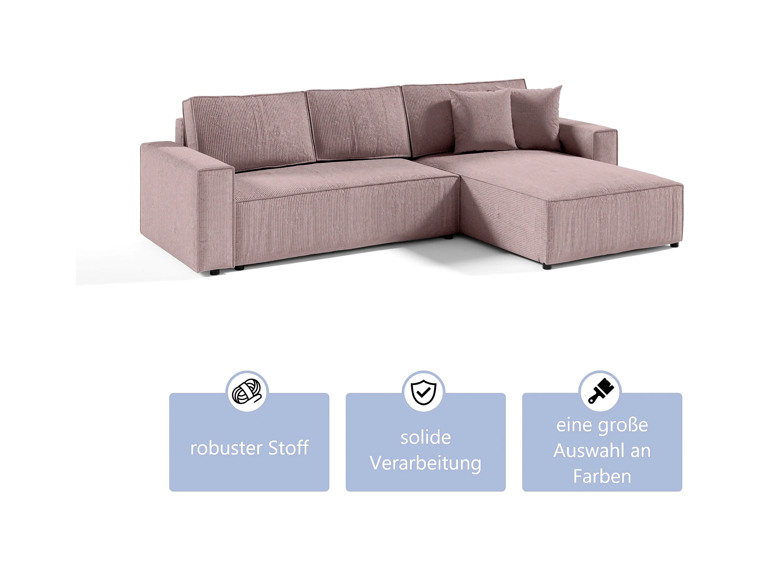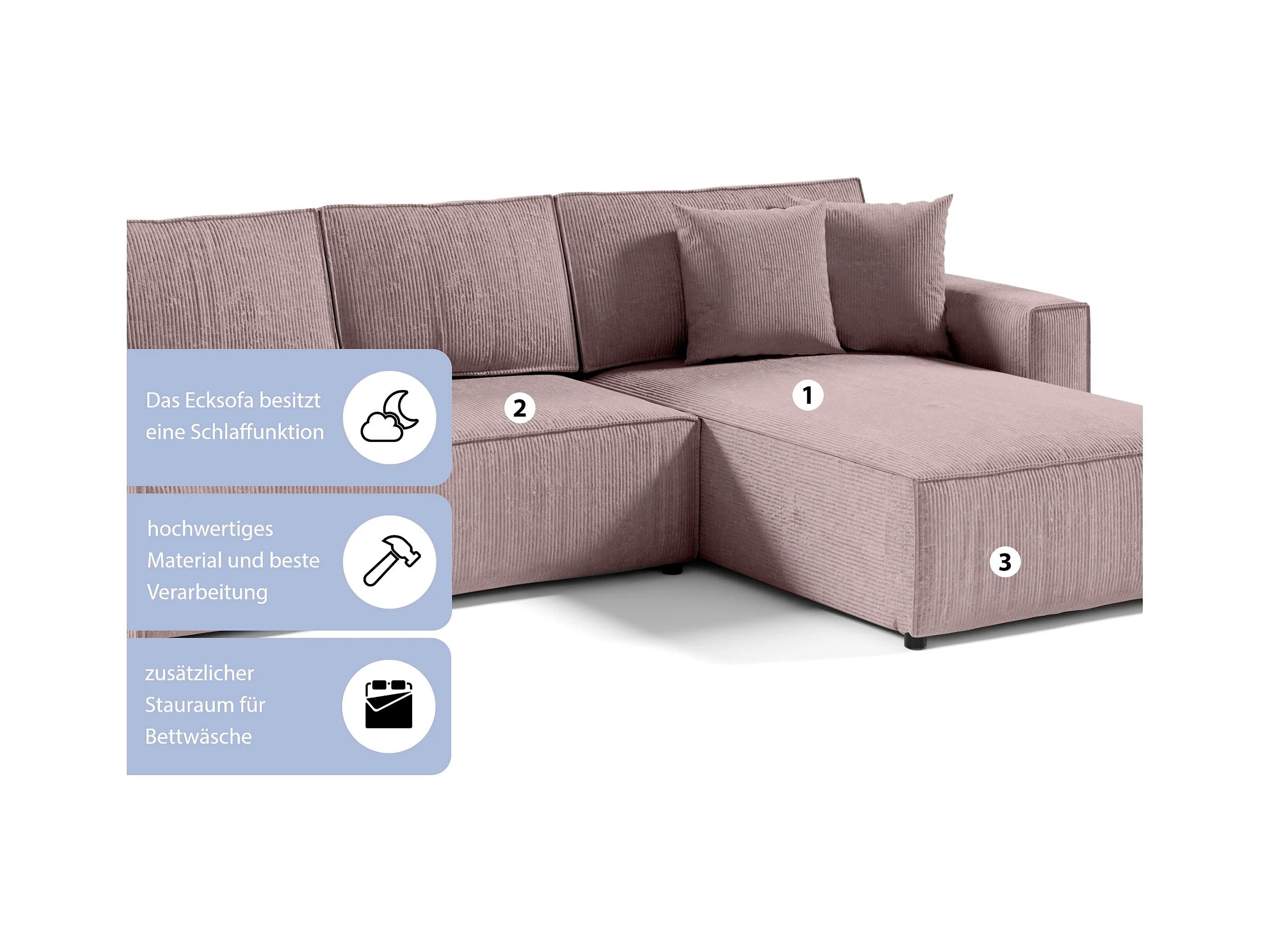 ECKSOFA aus Cord Stoff Bento L Rosa Right