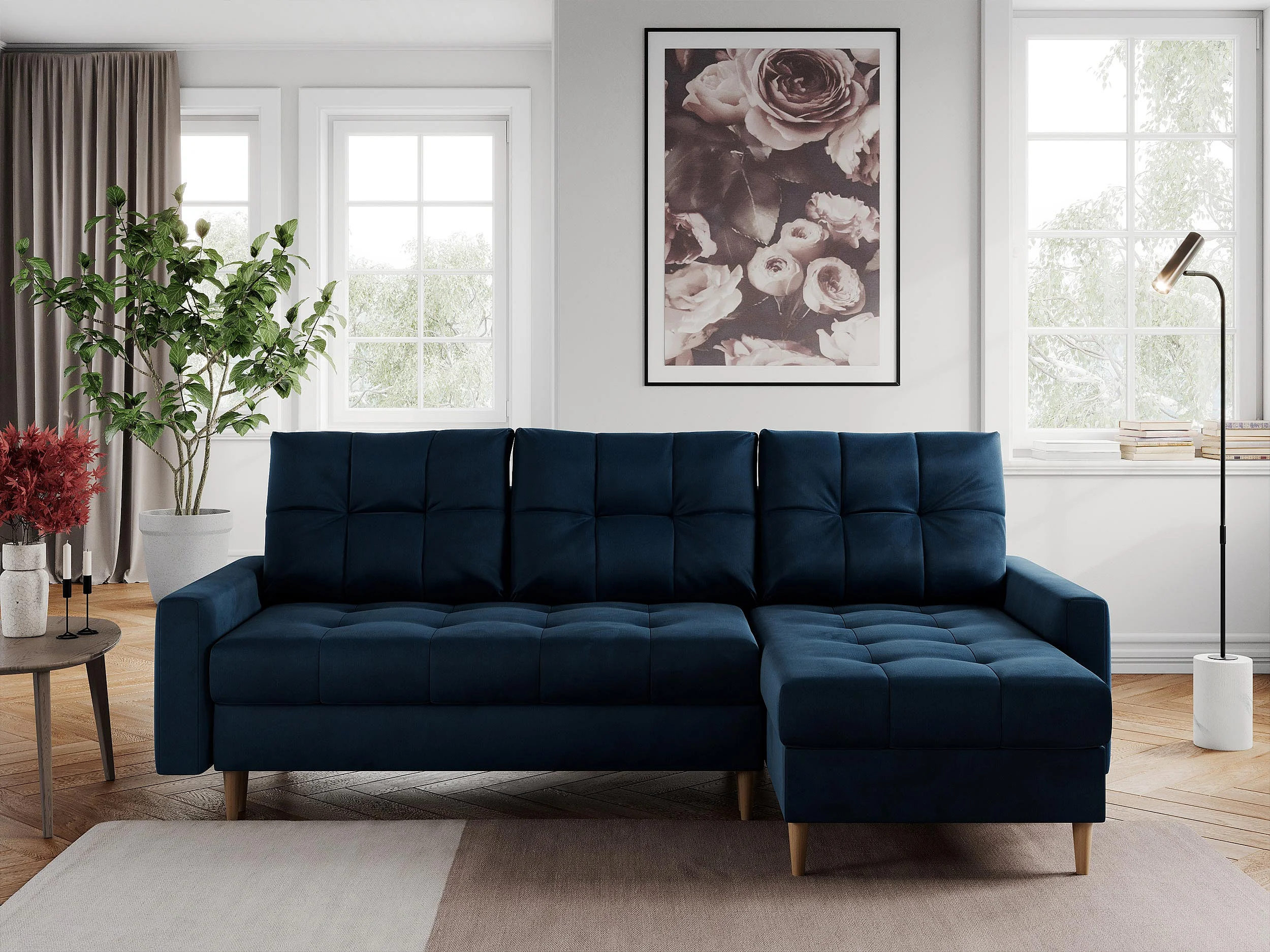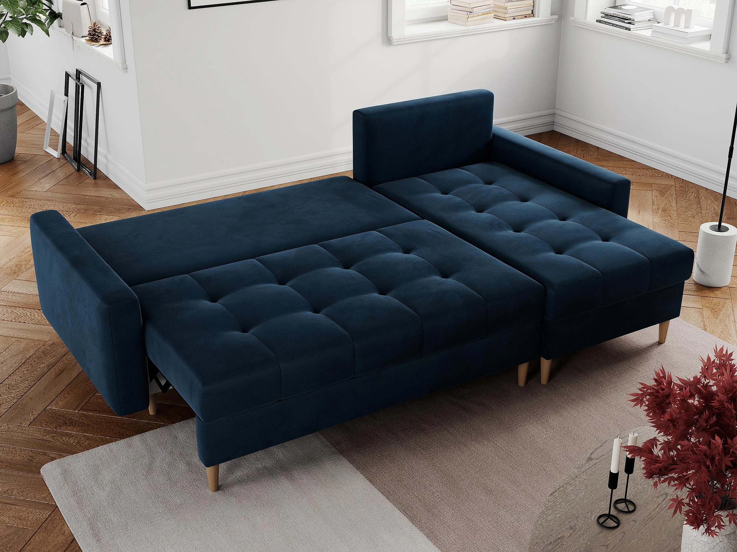 Ecksofa COLIN - gesteppte Sitzfläche, mit Schlaffunktion - Dunkelblau Velvet