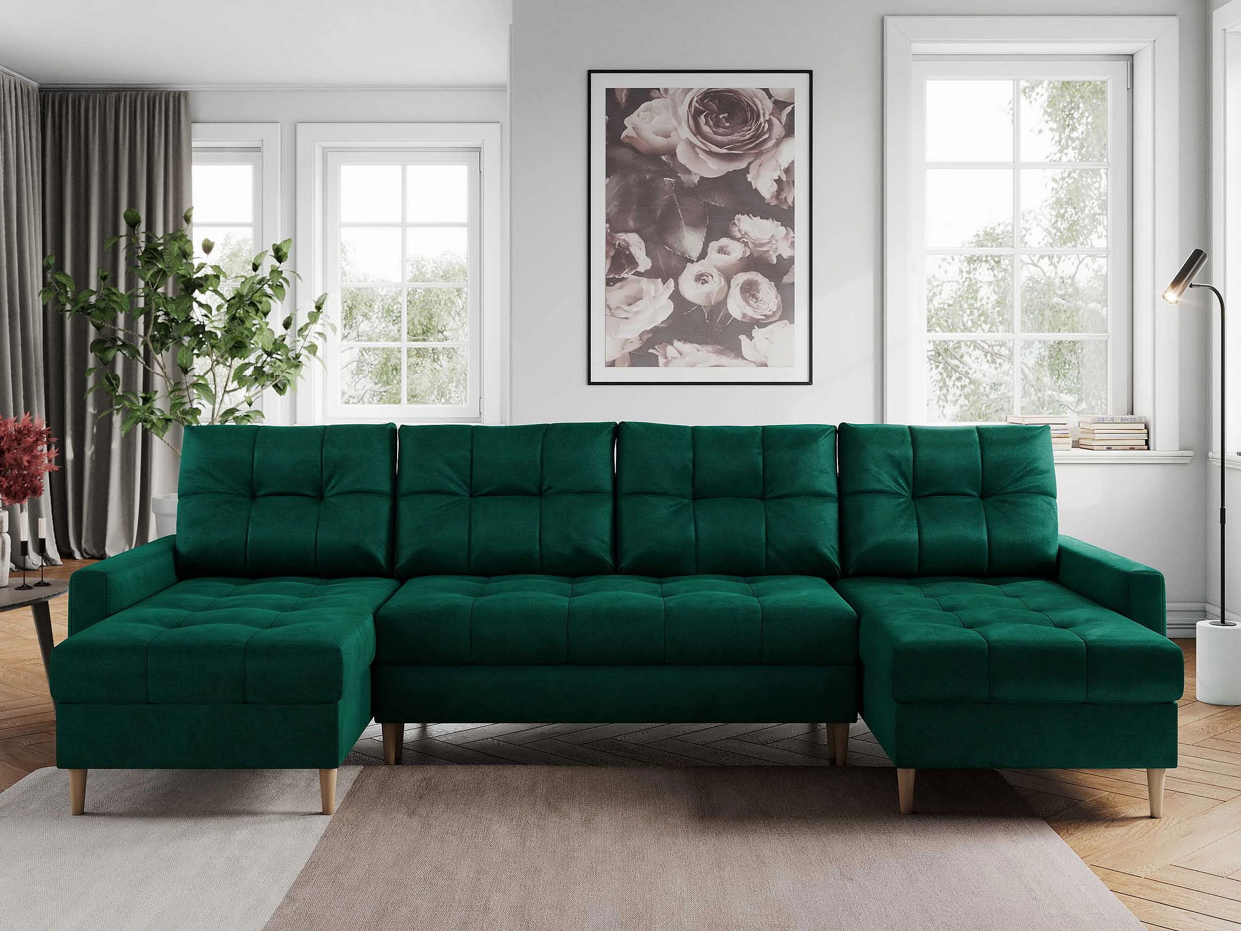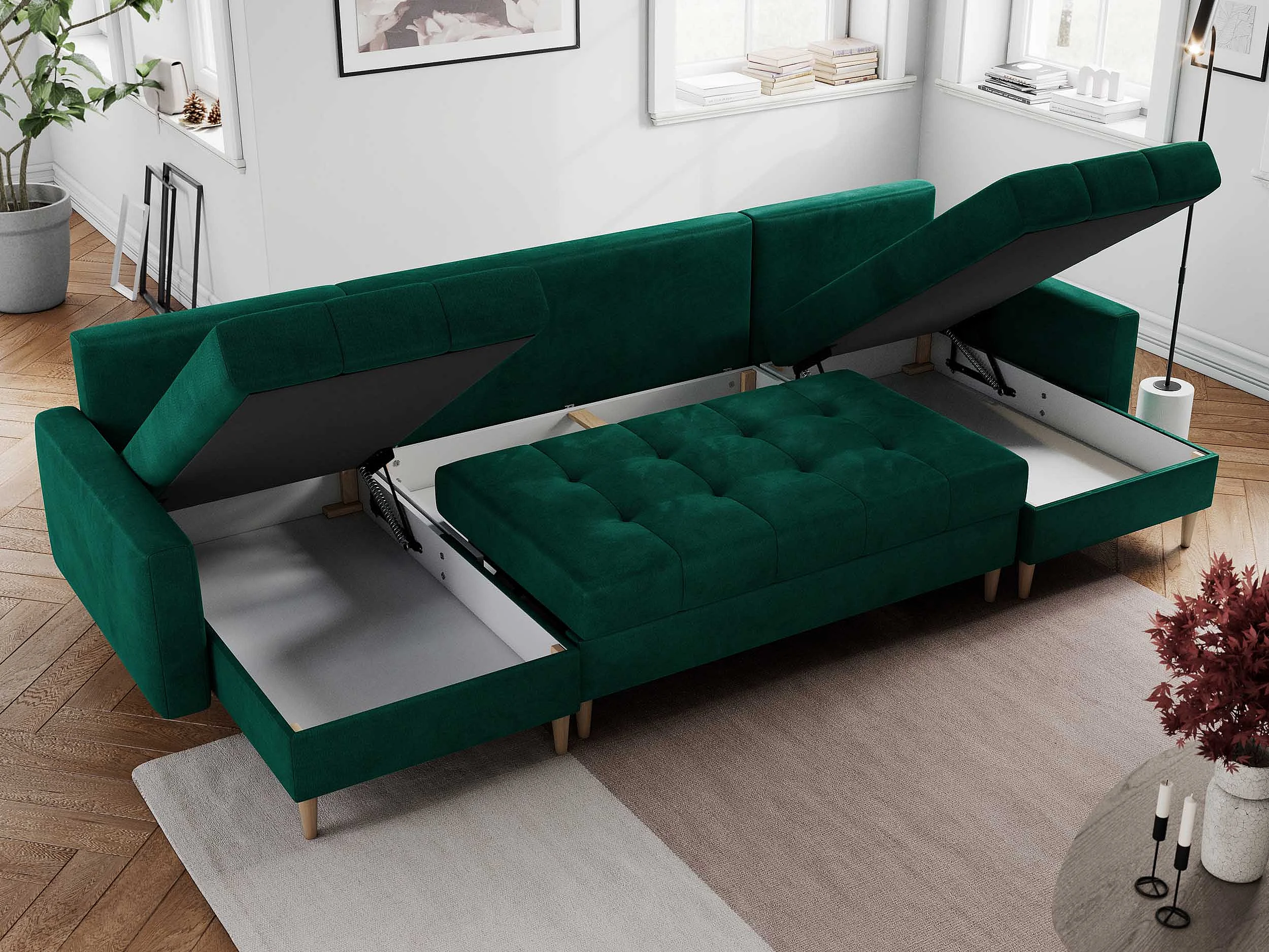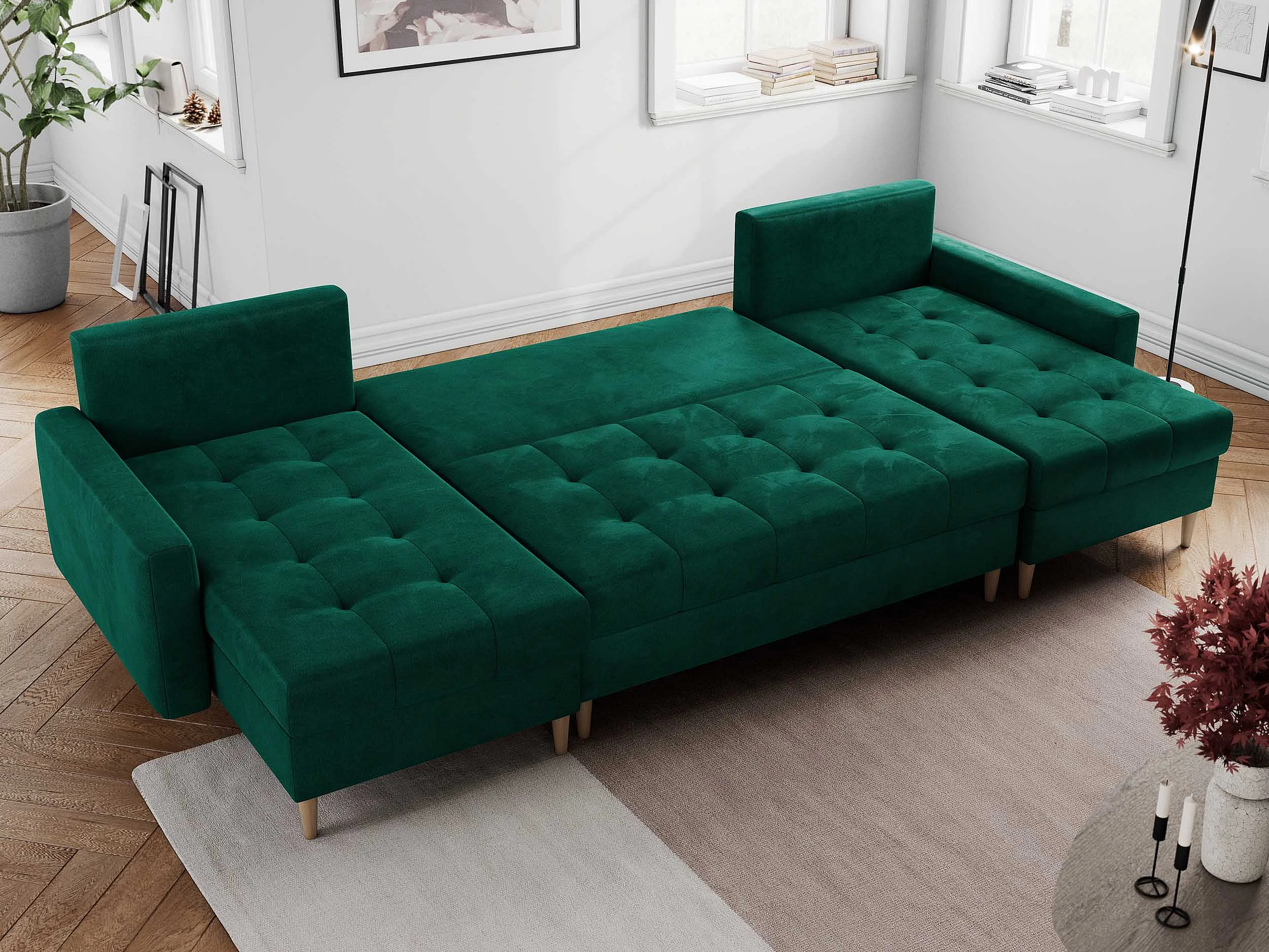 Ecksofa COLIN U mit Bettfunktion - skandinavisches design, lose Kissen - Dunkelgrün Velvet