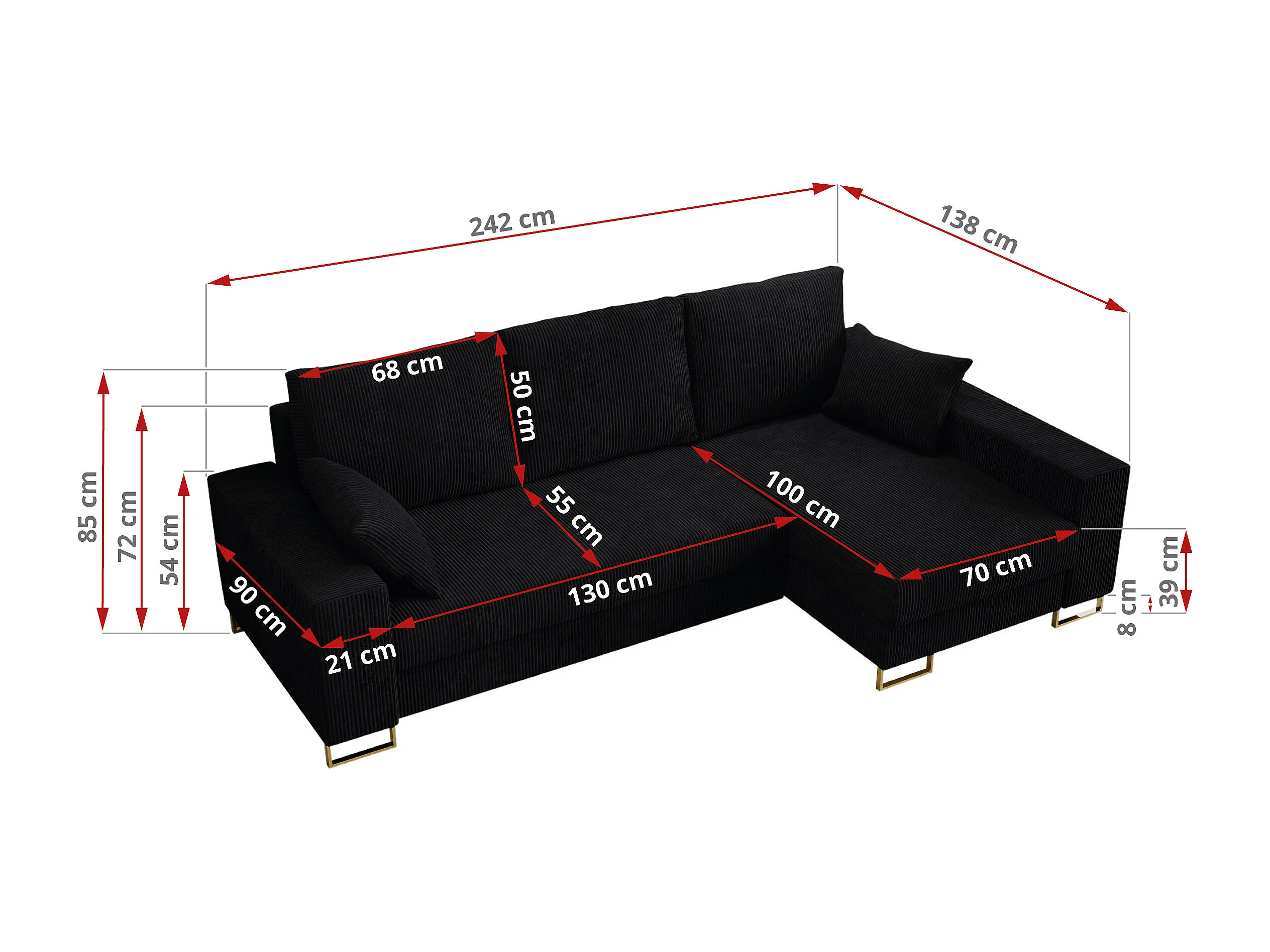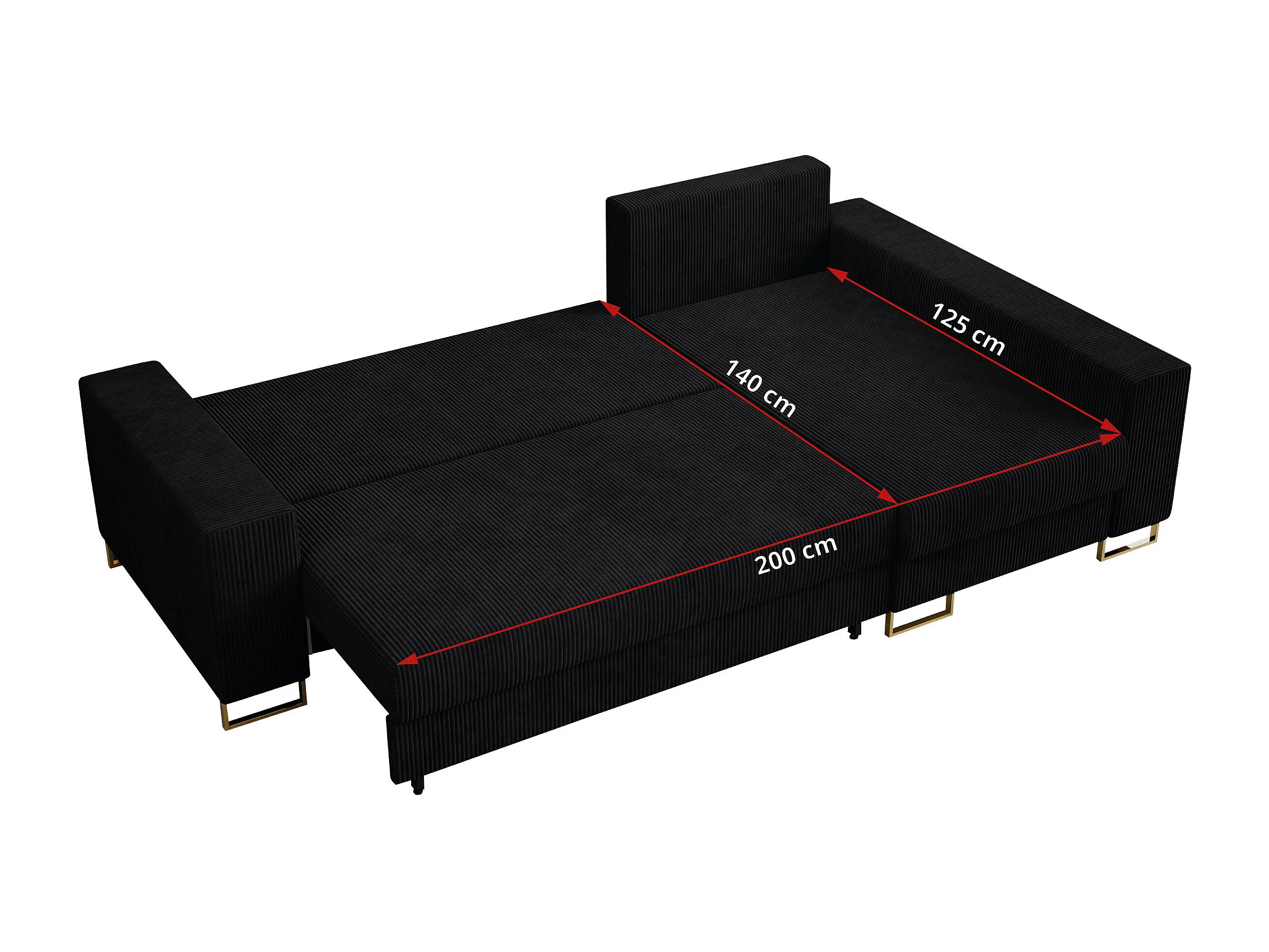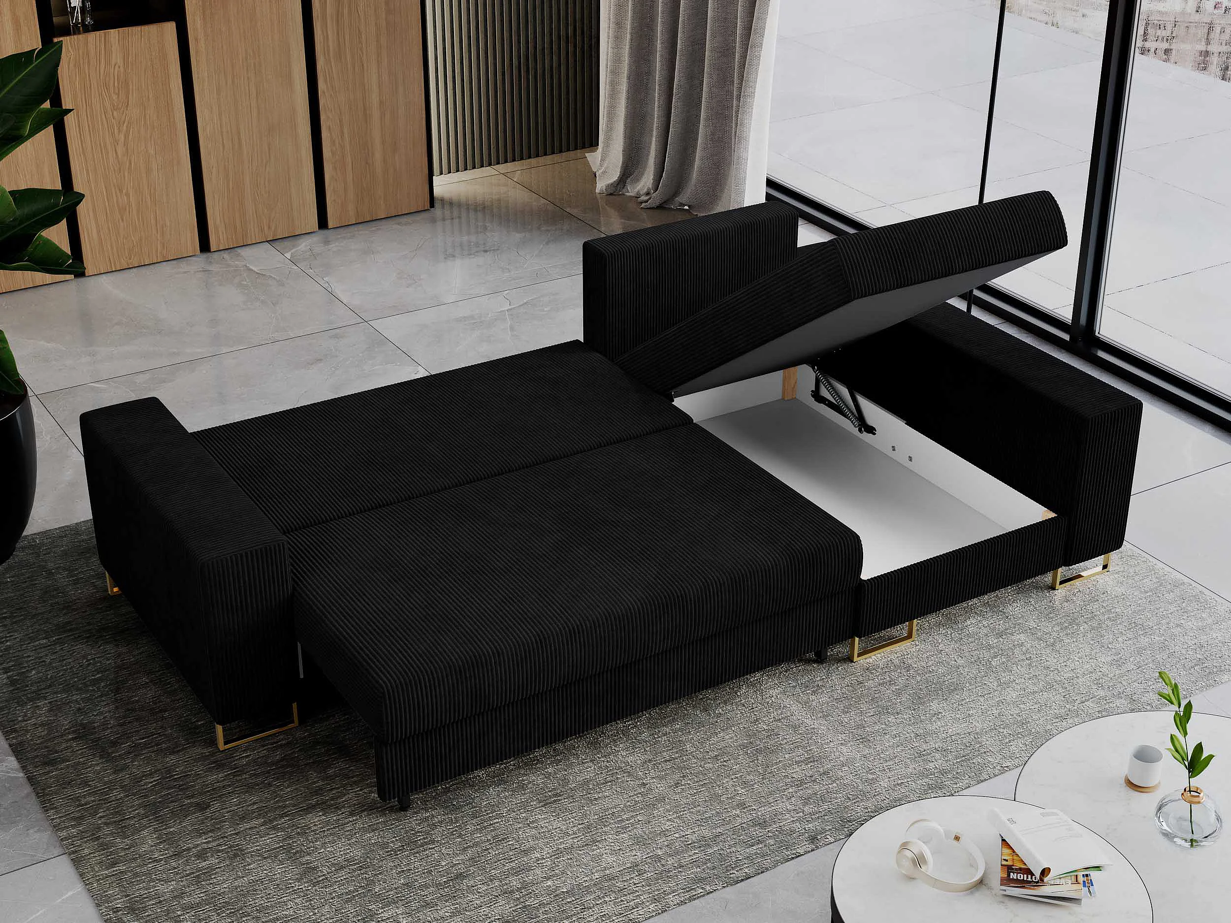 Ecksofa DORIAN - schlaffunktion und Bettkasten, lose Kissen - Schwarz Cord