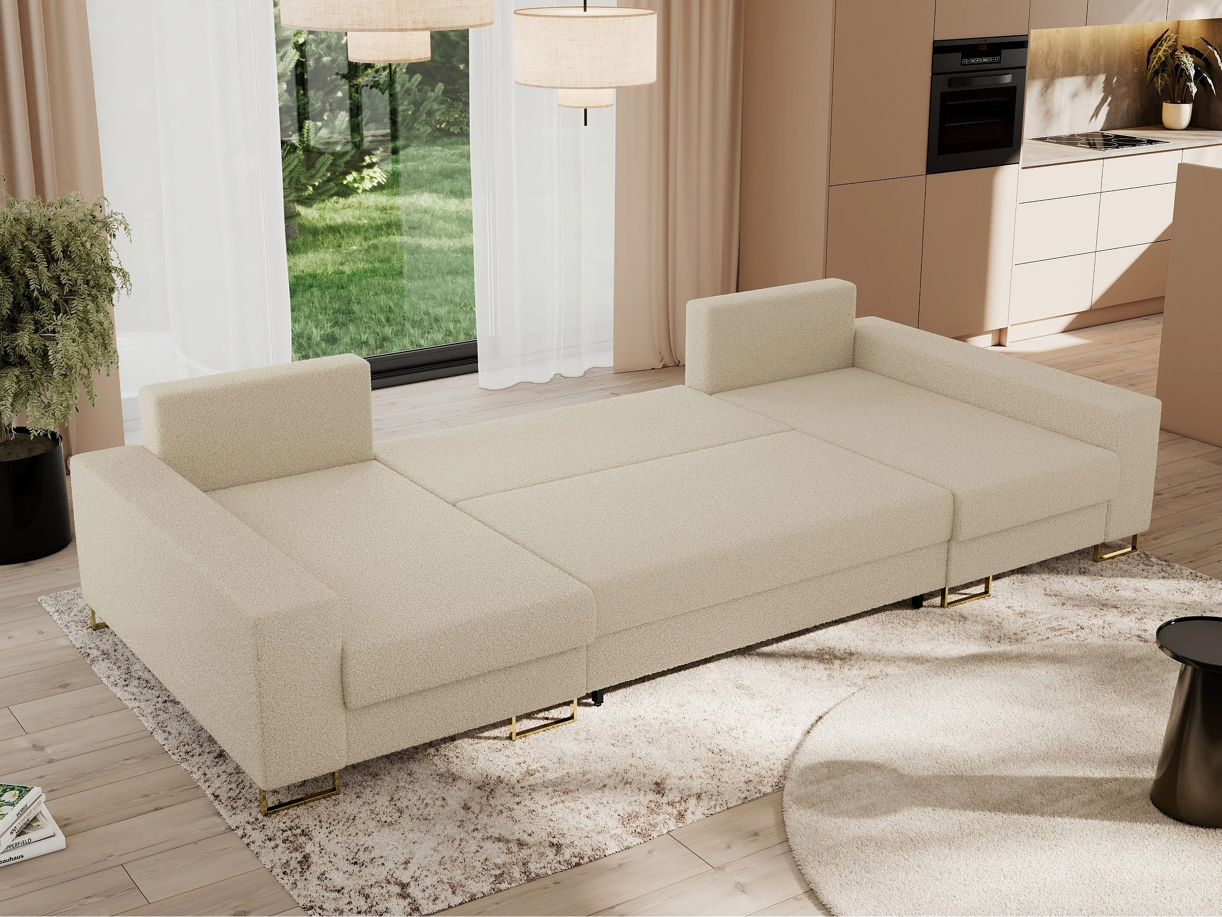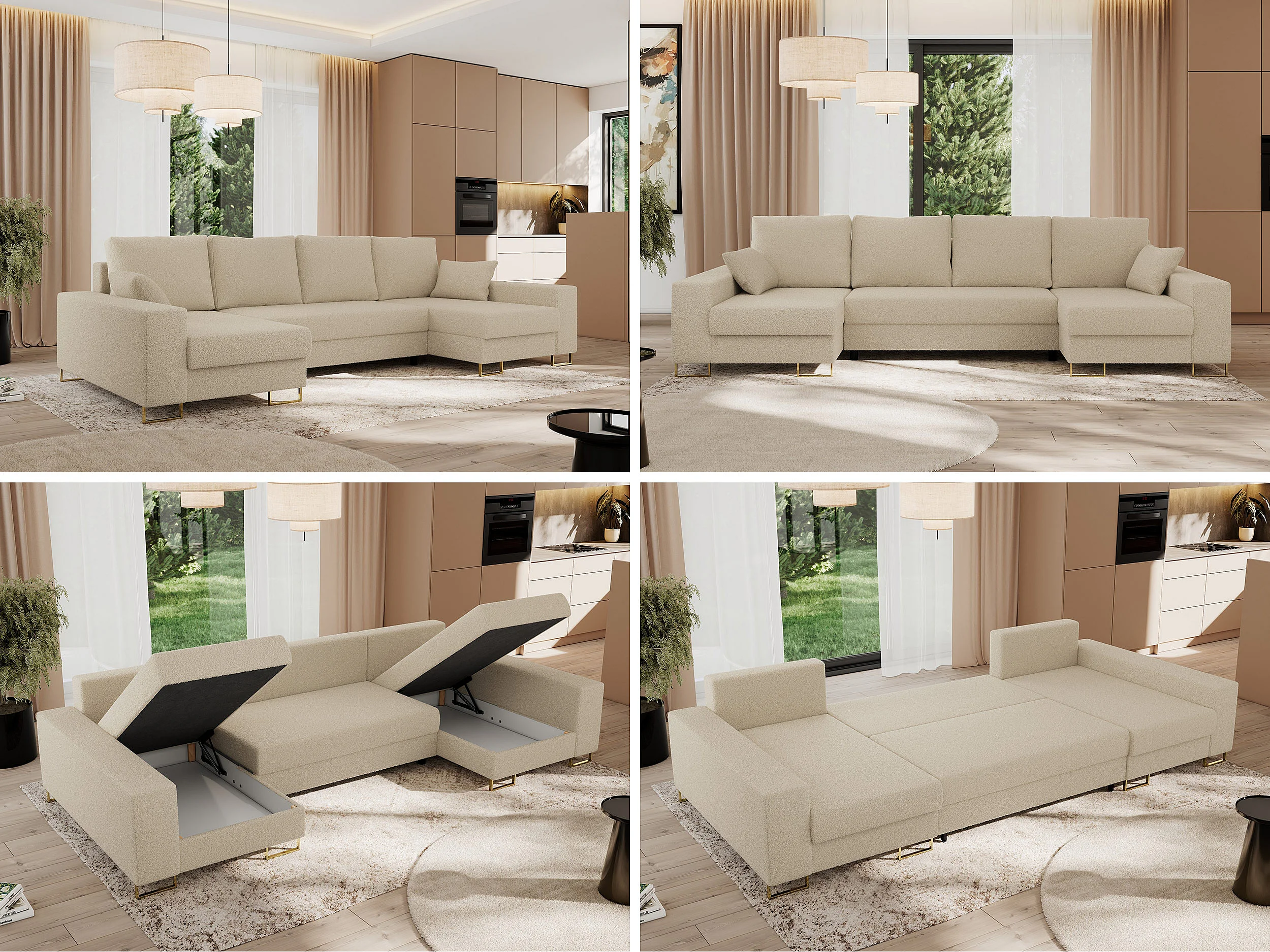 Ecksofa DORIAN U, Wohnlandschaft, Ecksofa mit Armlehnen, schlaffunktion und Bettkästen - Beige Boucle