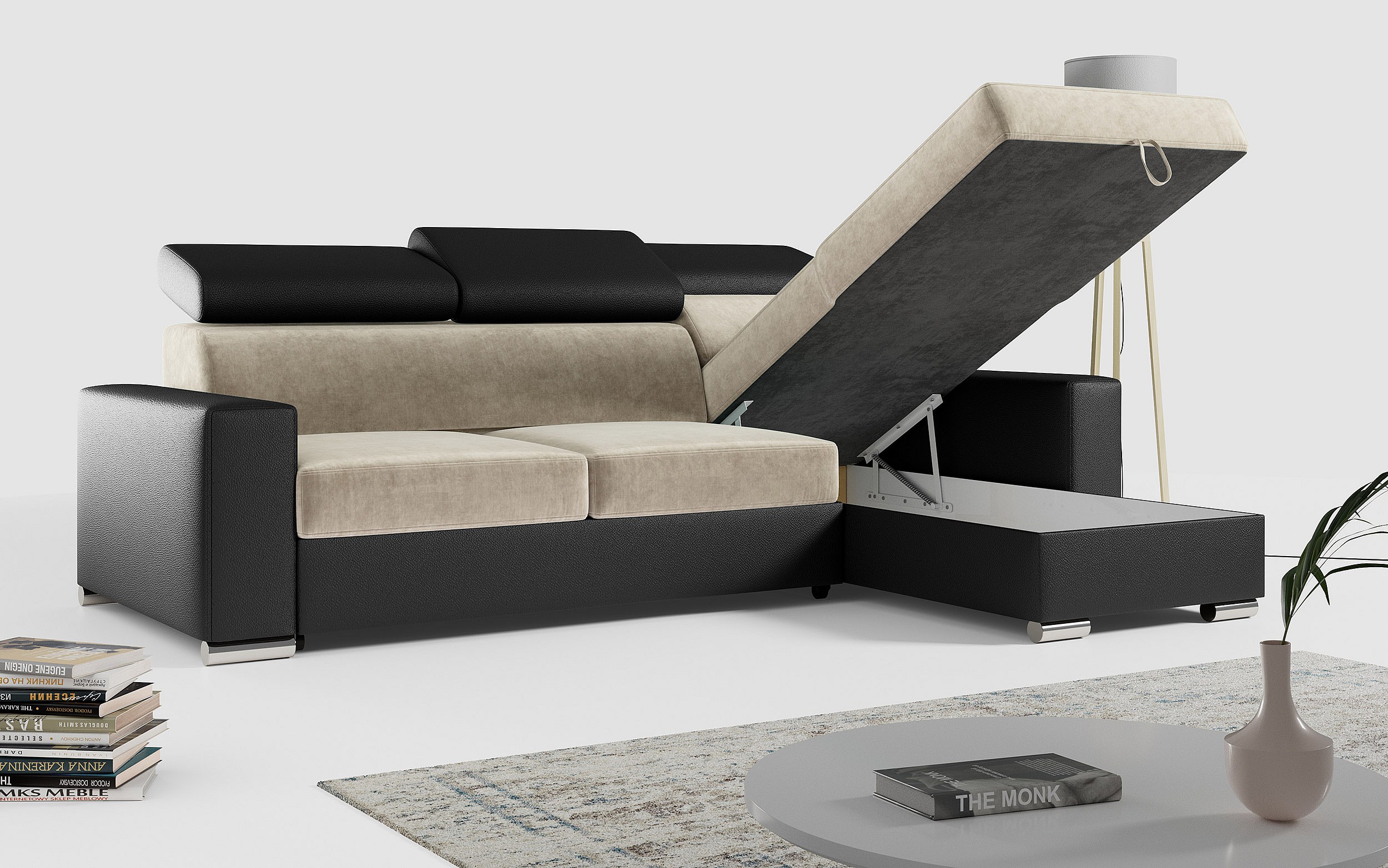 Ecksofa FOX, L-förmige Ecke, Schlaffunktion und Bettkasten, verstellbare Kopfstützen - Beige, Schwarz - Velvet, Kunstleder