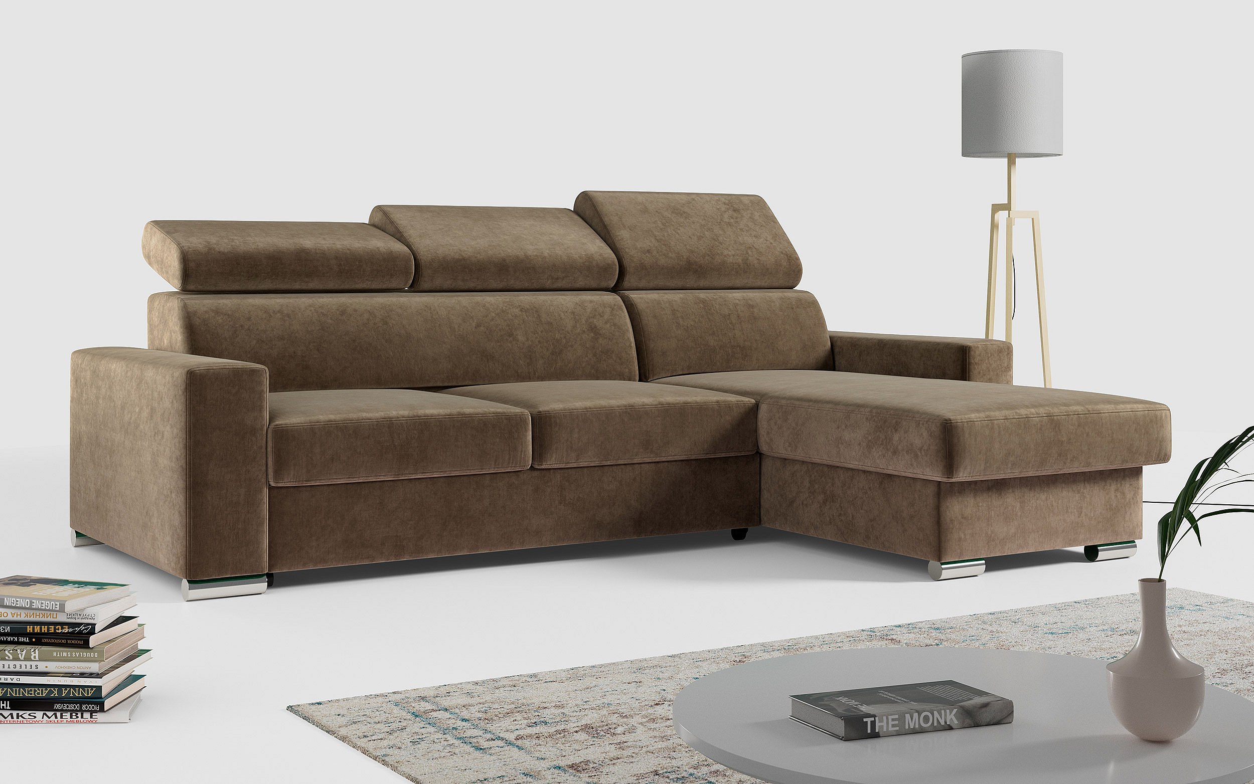 Ecksofa FOX, L-förmige Ecke, Schlaffunktion und Bettkasten, verstellbare Kopfstützen - Braun Velvet