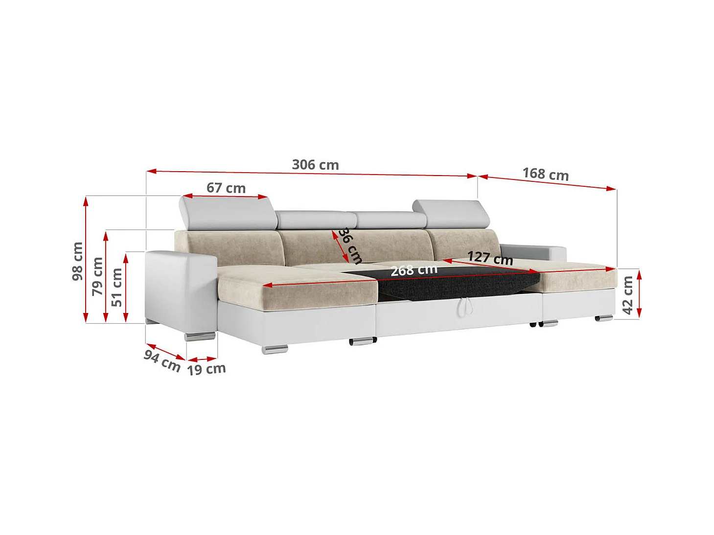 Ecksofa FOX U - verstellbare Kopfstützen, zwei Bettkästen, L-förmige Ecke mit Schlaffunktion, Armlehnen - Beige, Weiß - Velvet, Kunstleder