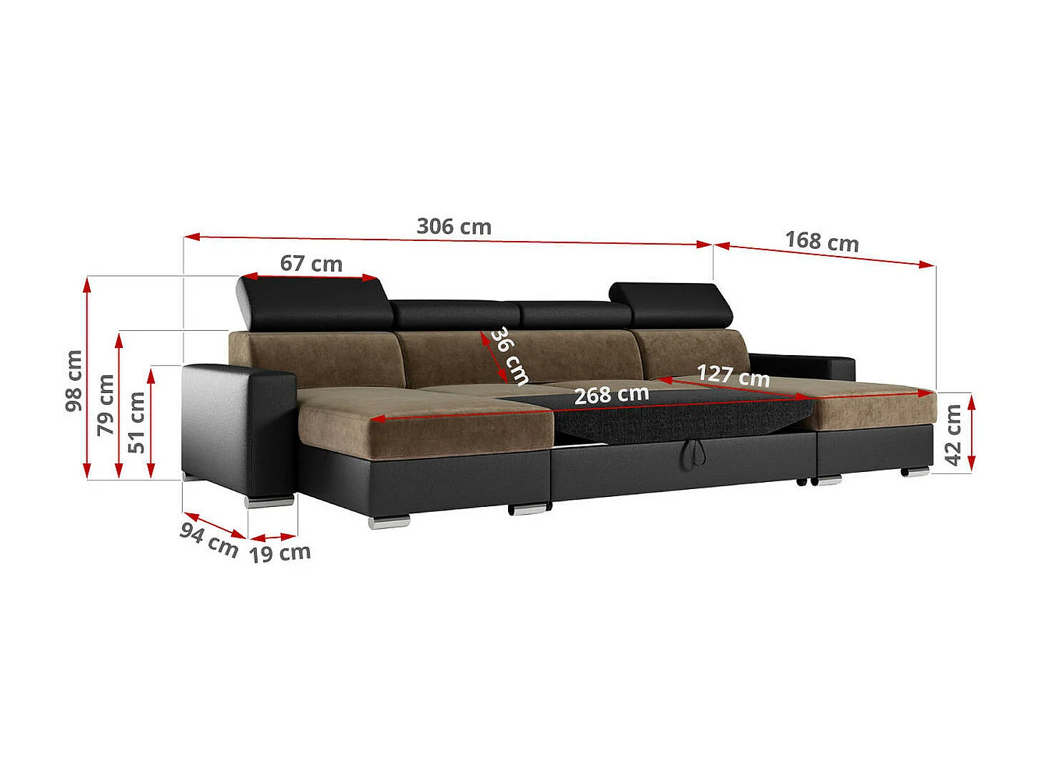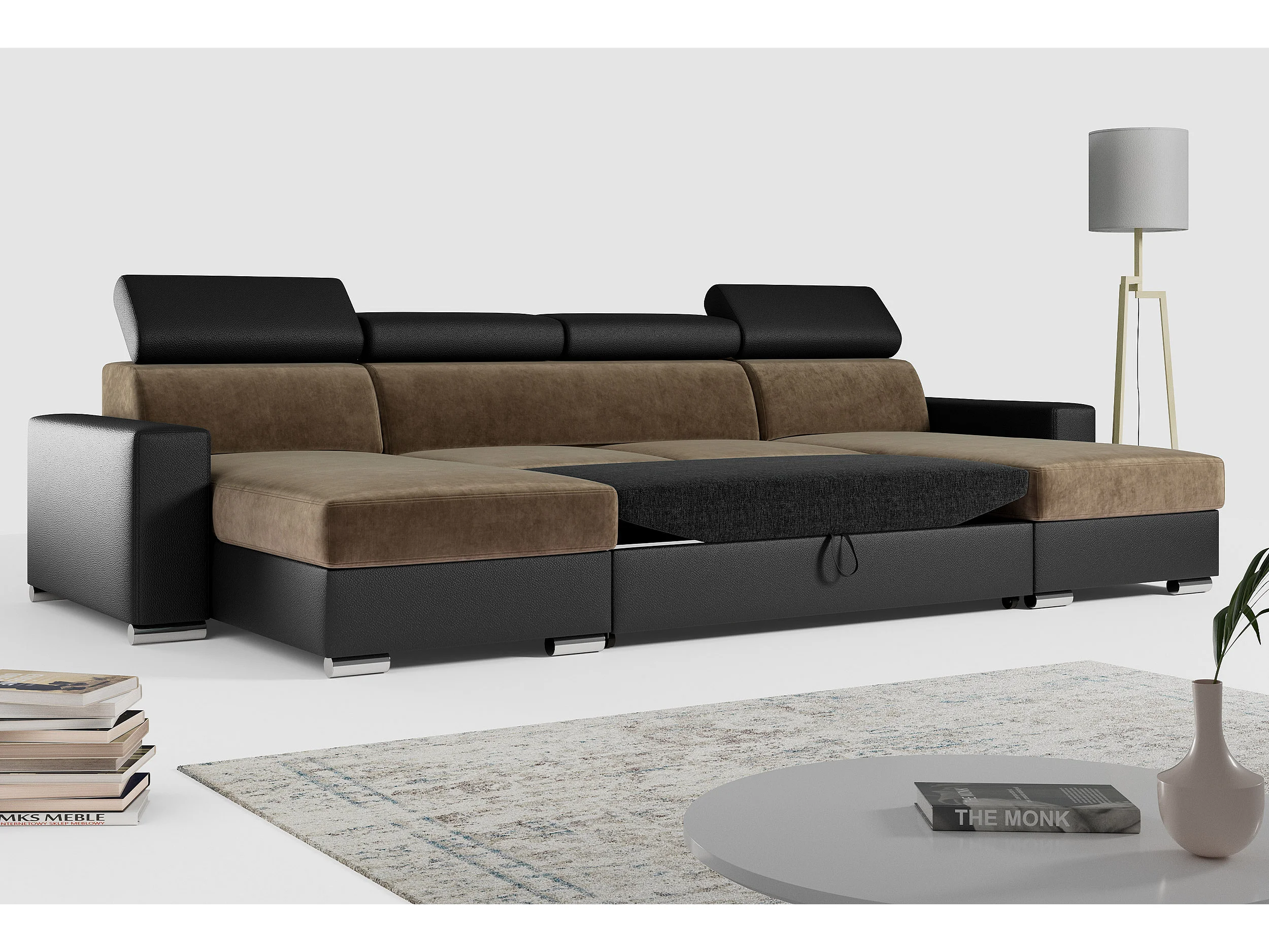 Ecksofa FOX U - verstellbare Kopfstützen, zwei Bettkästen, L-förmige Ecke mit Schlaffunktion, Armlehnen - Braun, Schwarz - Velvet, Kunstleder