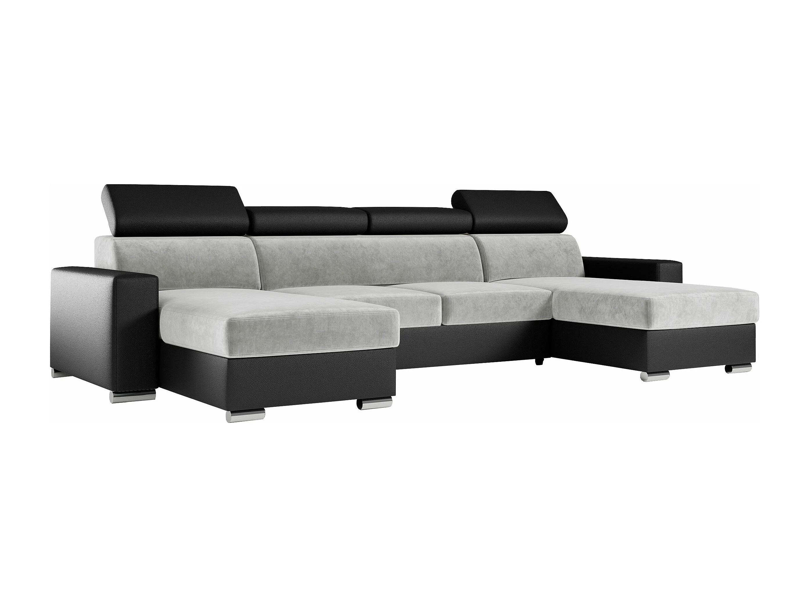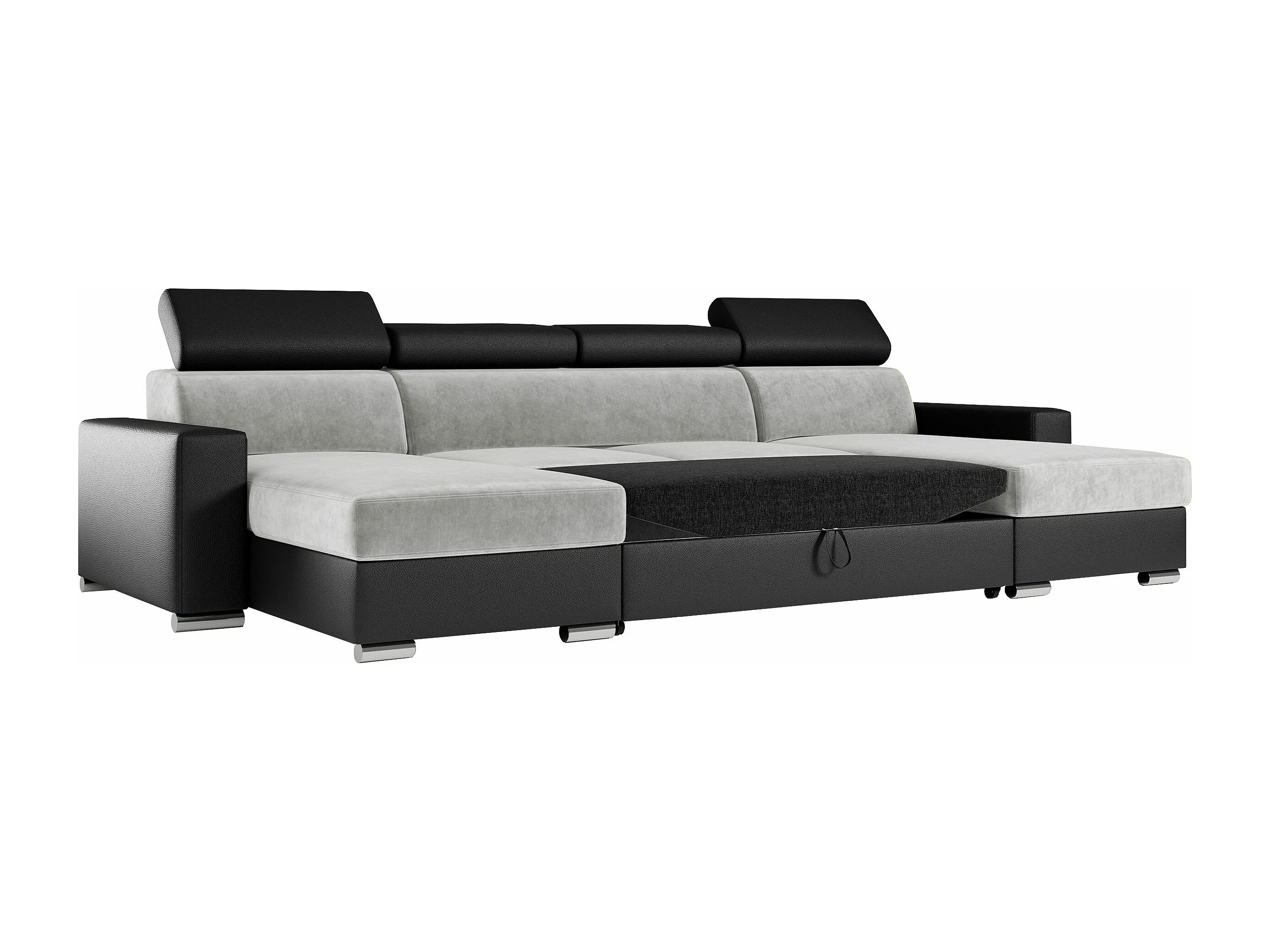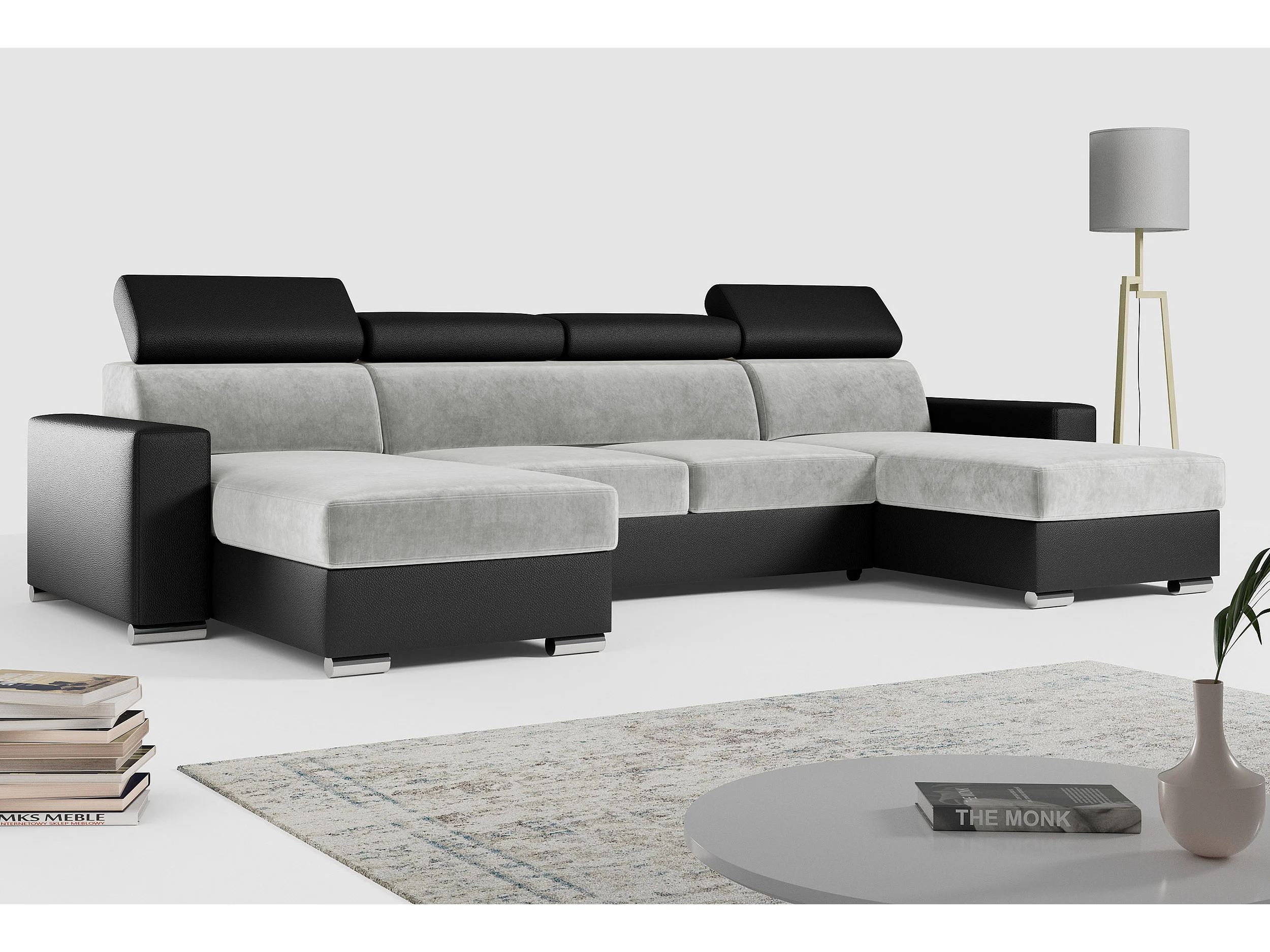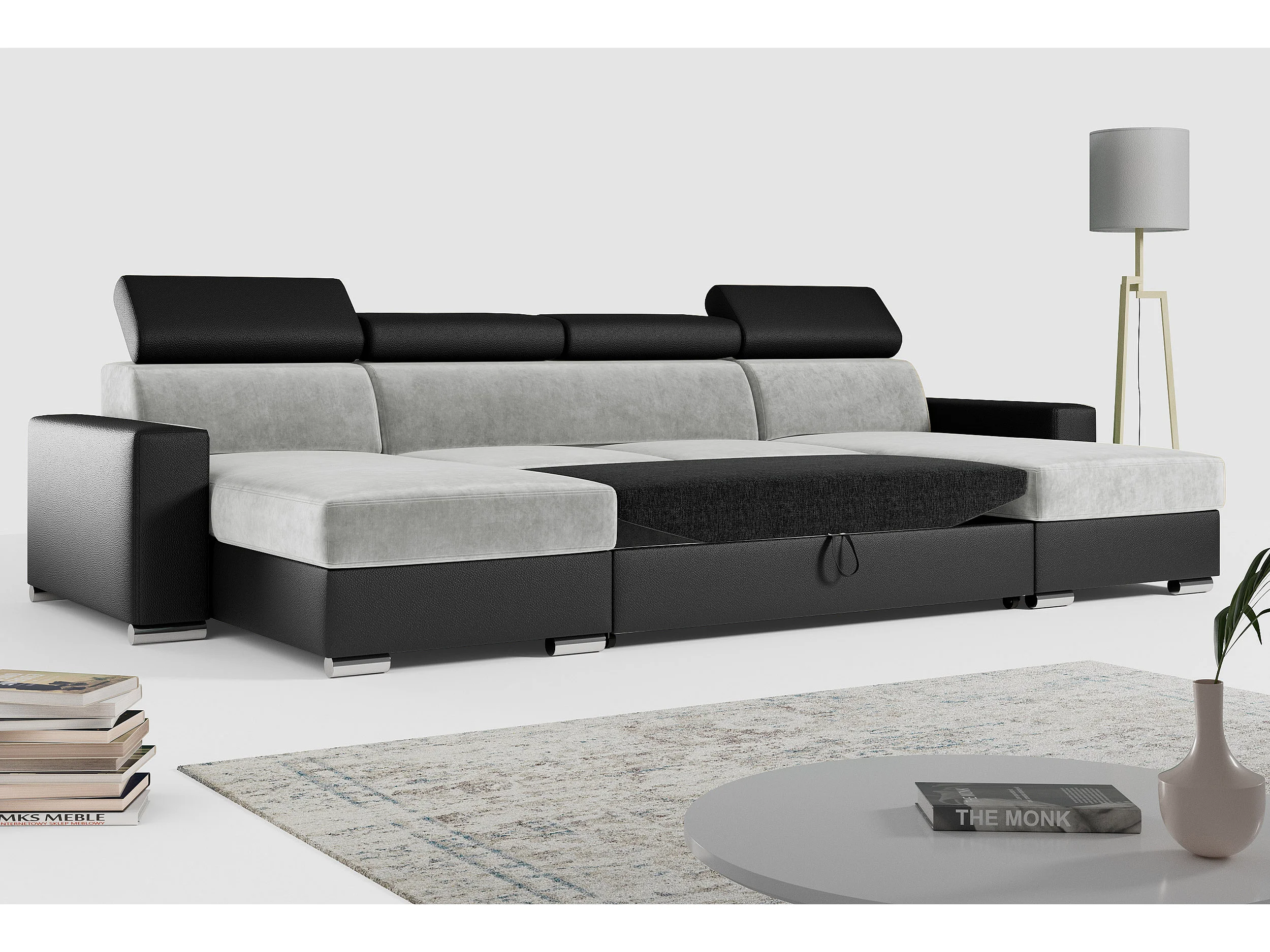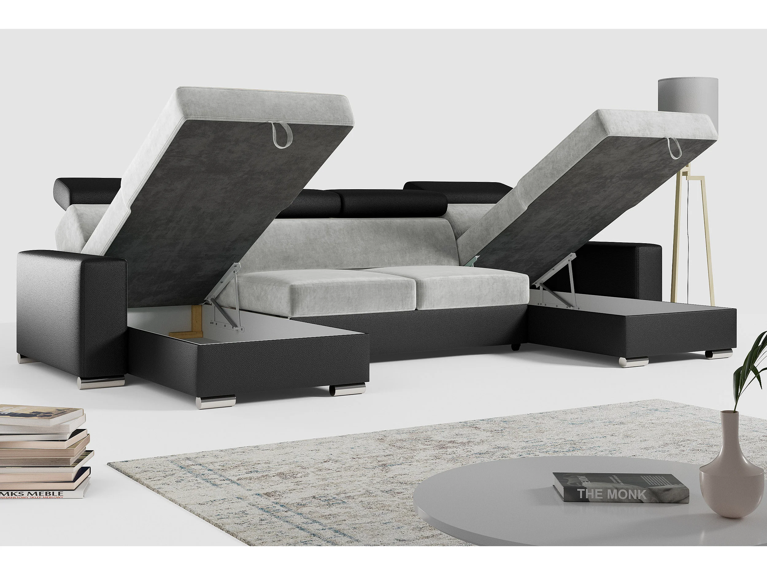 Ecksofa FOX U - verstellbare Kopfstützen, zwei Bettkästen, L-förmige Ecke mit Schlaffunktion, Armlehnen - Hellgrau, Schwarz - Velvet, Kunstleder