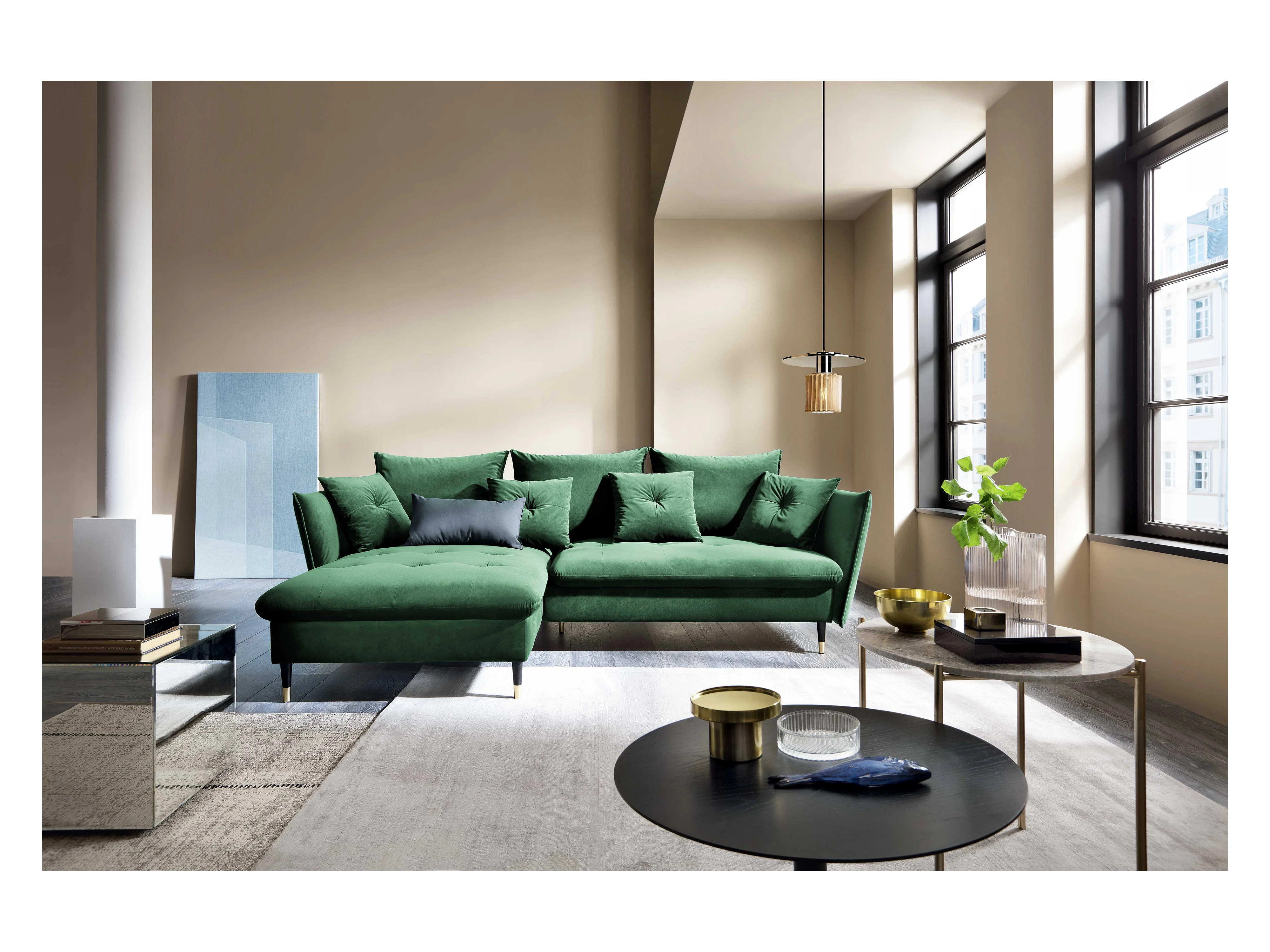 Ecksofa GLAM mit Schlaffunktion, Ottomane & goldenen Füßen – Samtsofa im Glamour-Stil mit Zierkissen, 258x167x91cm, Linke Seite GRÜN