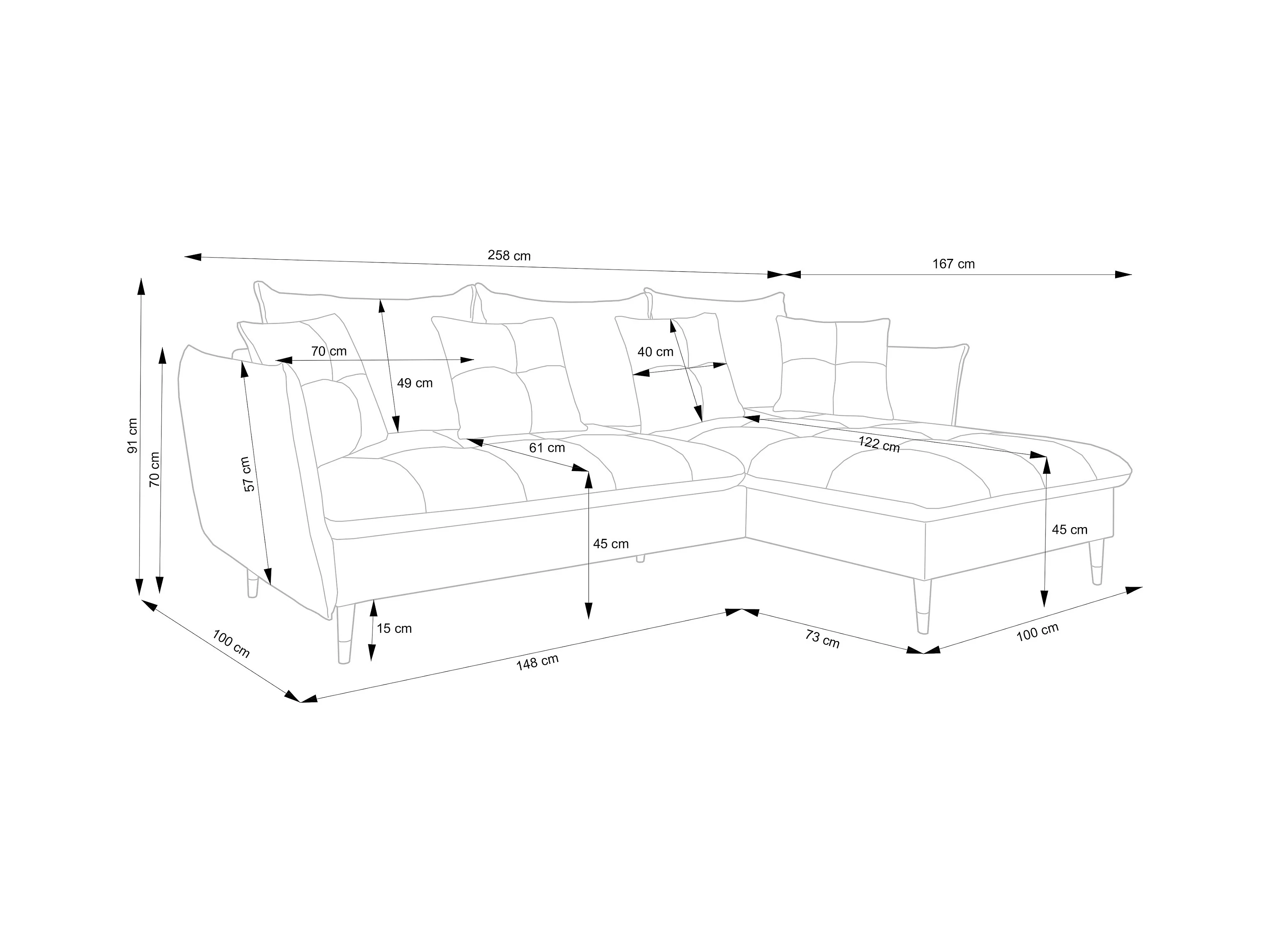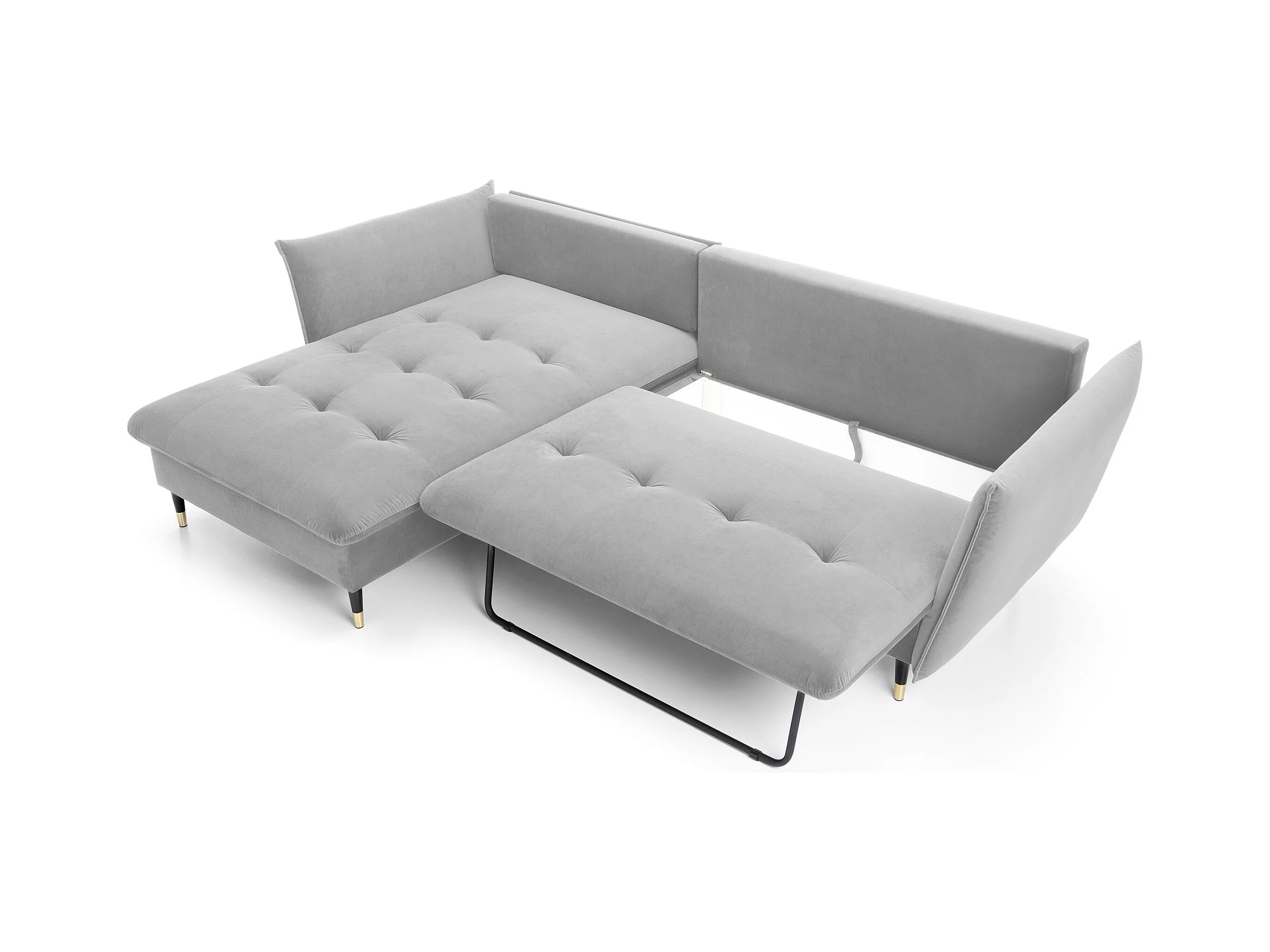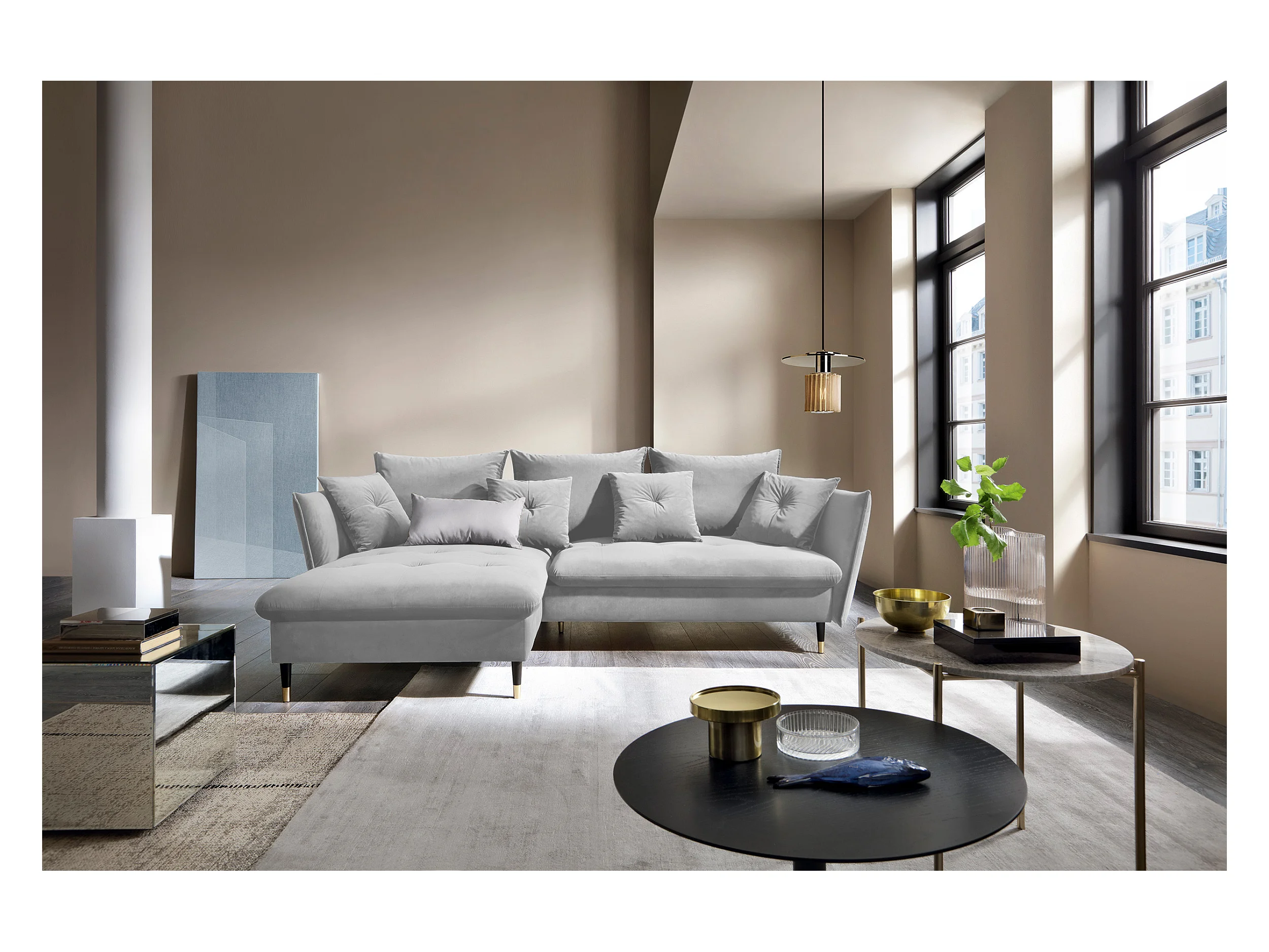 Ecksofa GLAM mit Schlaffunktion, Ottomane & goldenen Füßen – Samtsofa im Glamour-Stil mit Zierkissen, 258x167x91cm, Linke Seite HELL GRAU
