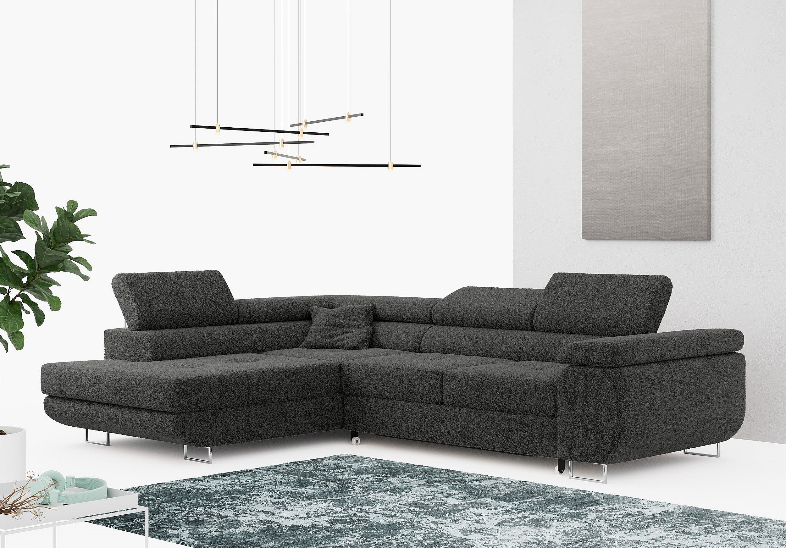 Ecksofa GUSTAW - mit Schlaffunktion, verstellbare Kopfstützen, Metallbeine - Dunkelgrau Boucle - Ecke Links