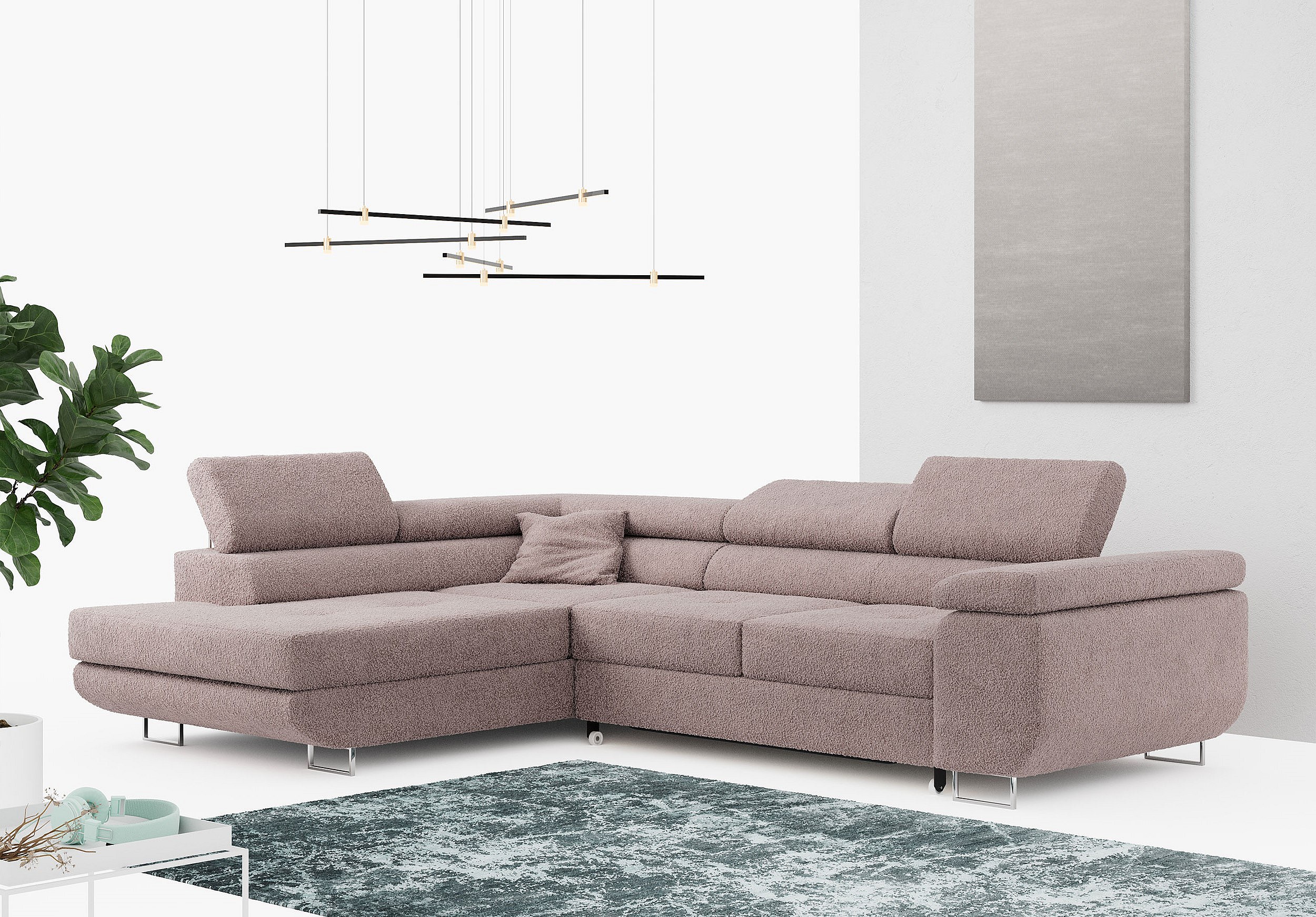 Ecksofa GUSTAW - mit Schlaffunktion, verstellbare Kopfstützen, Metallbeine - Rose Boucle - Ecke Links