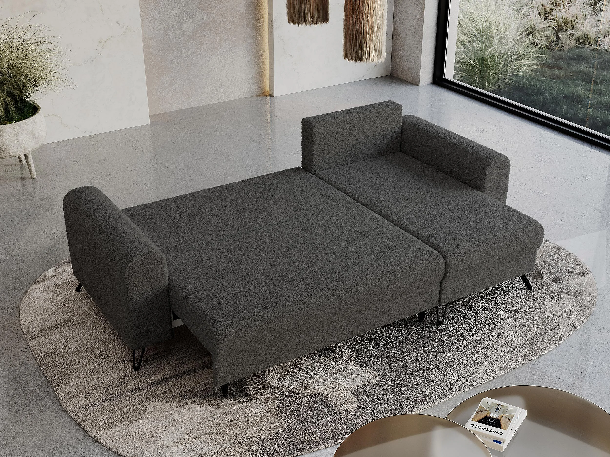 Ecksofa HUGO - L-Form mit Schlaffunktion, lose Kissen - Dunkelgrau Boucle