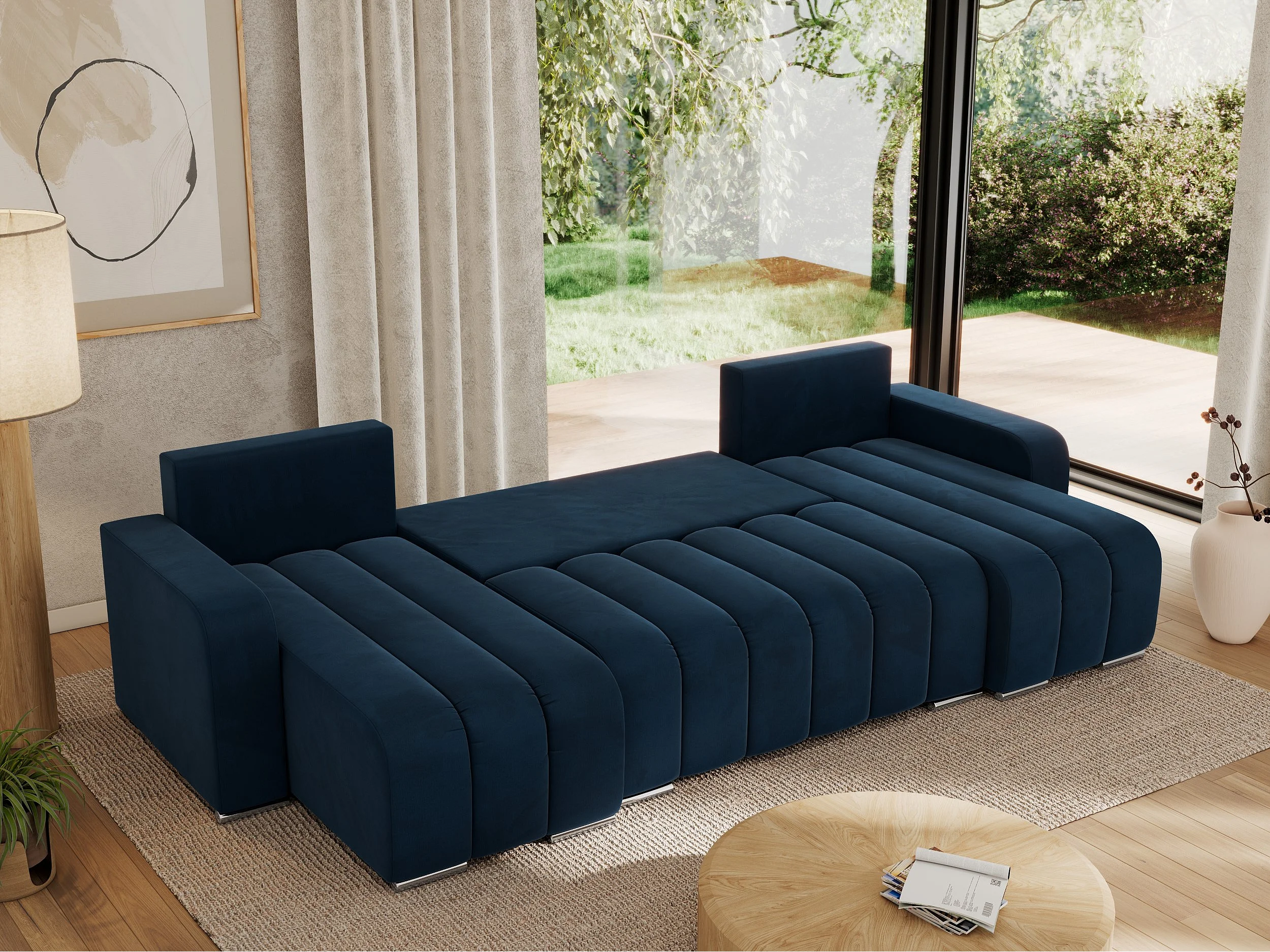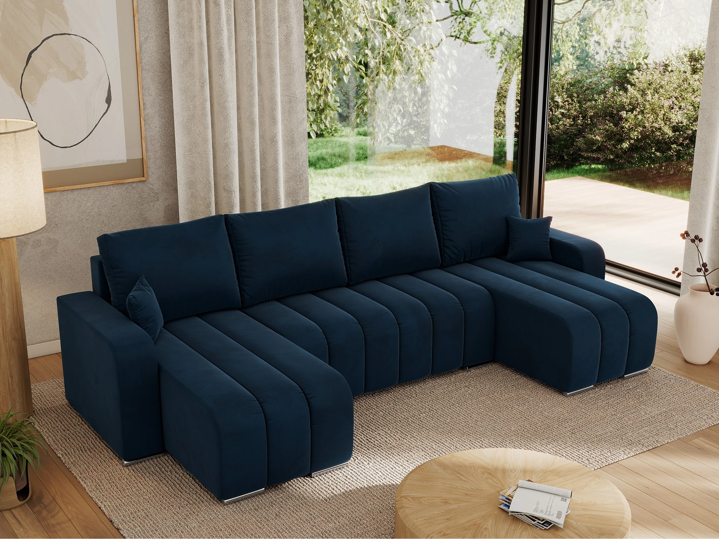Ecksofa KIRASSO U - Wohnlandschaft, Schlaffunktion und Bettkasten, Couch U-form, lose Kissen - Dunkelblau Velvet