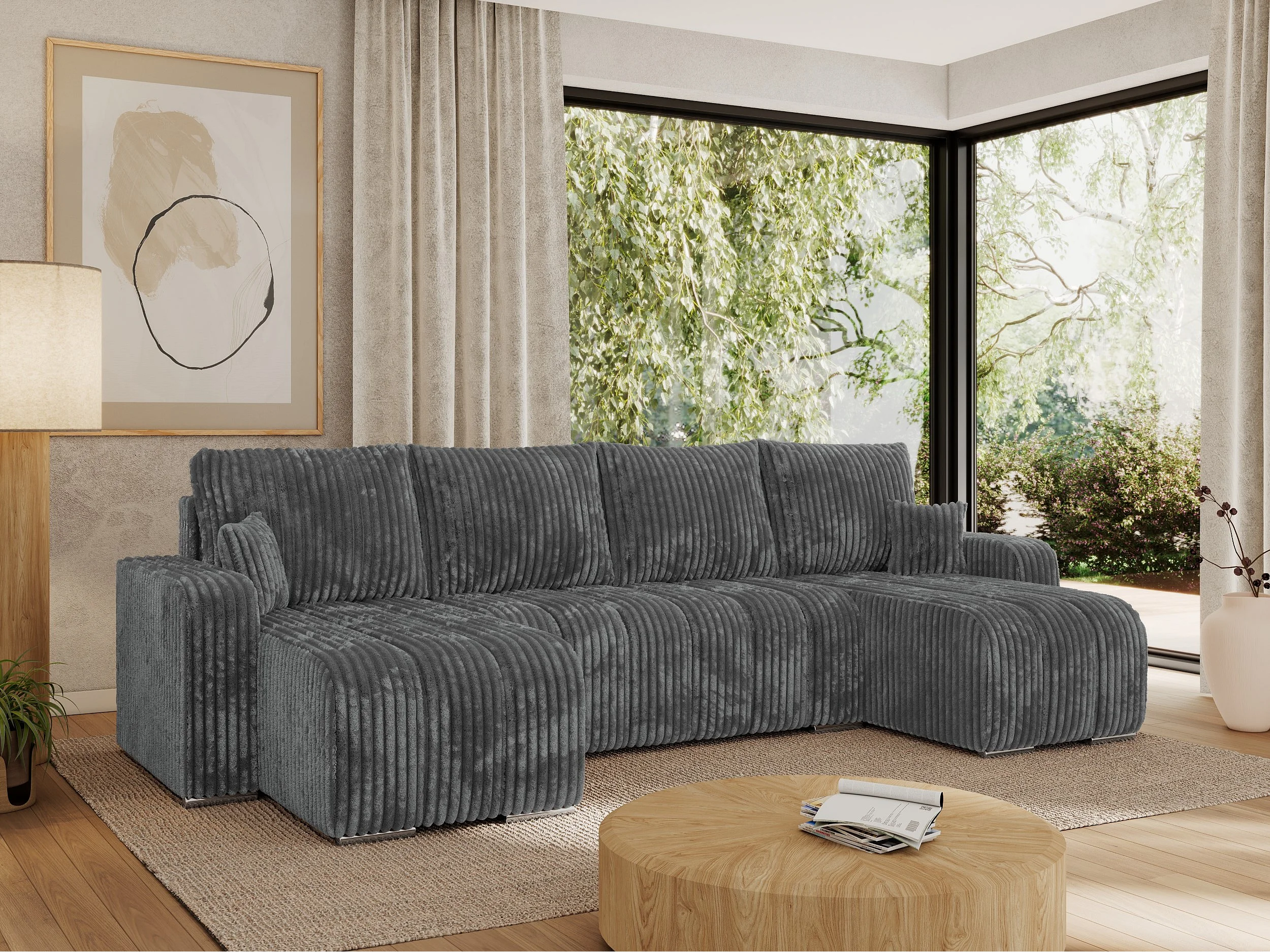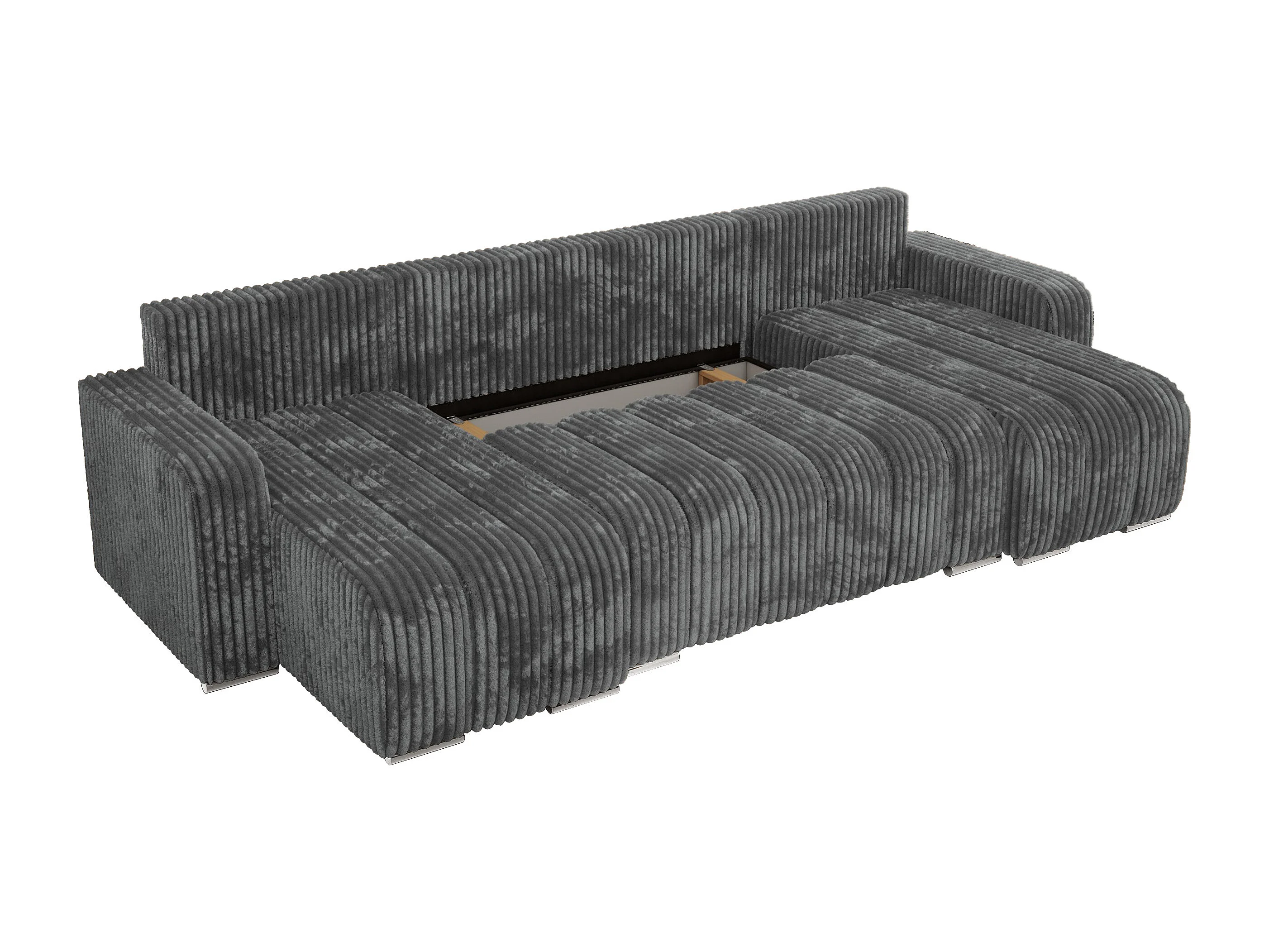 Ecksofa KIRASSO U - Wohnlandschaft, Schlaffunktion und Bettkasten, Couch U-form, lose Kissen - Dunkelgrau Cord