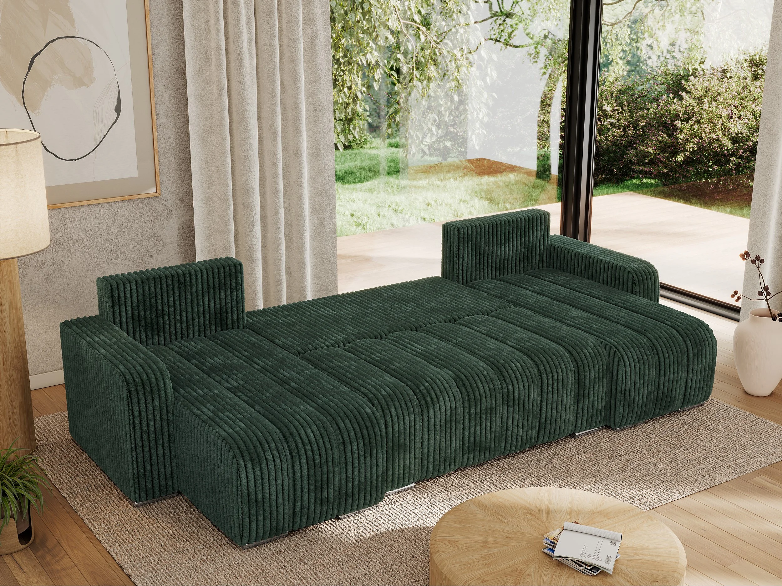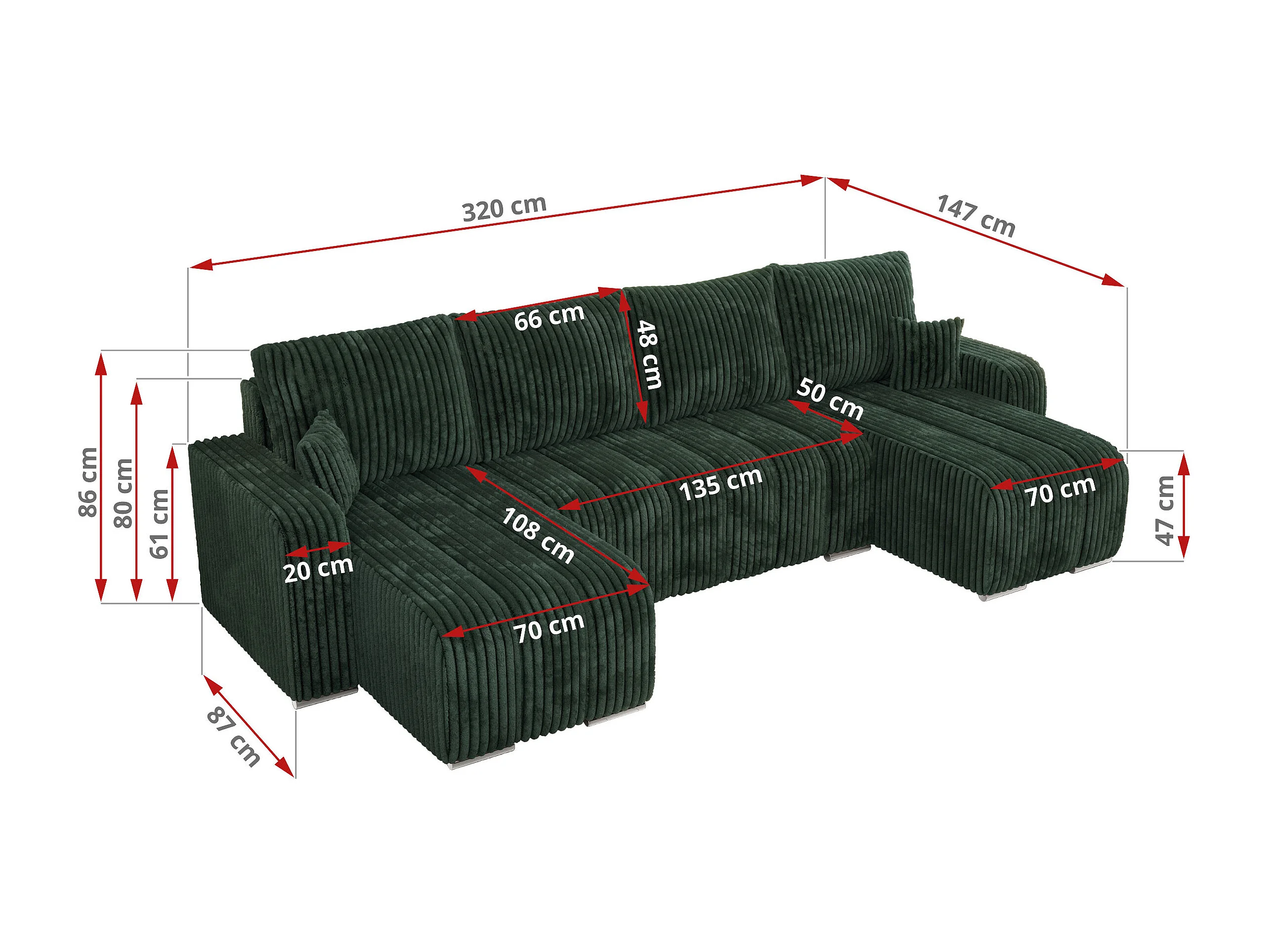 Ecksofa KIRASSO U - Wohnlandschaft, Schlaffunktion und Bettkasten, Couch U-form, lose Kissen - Grün Cord