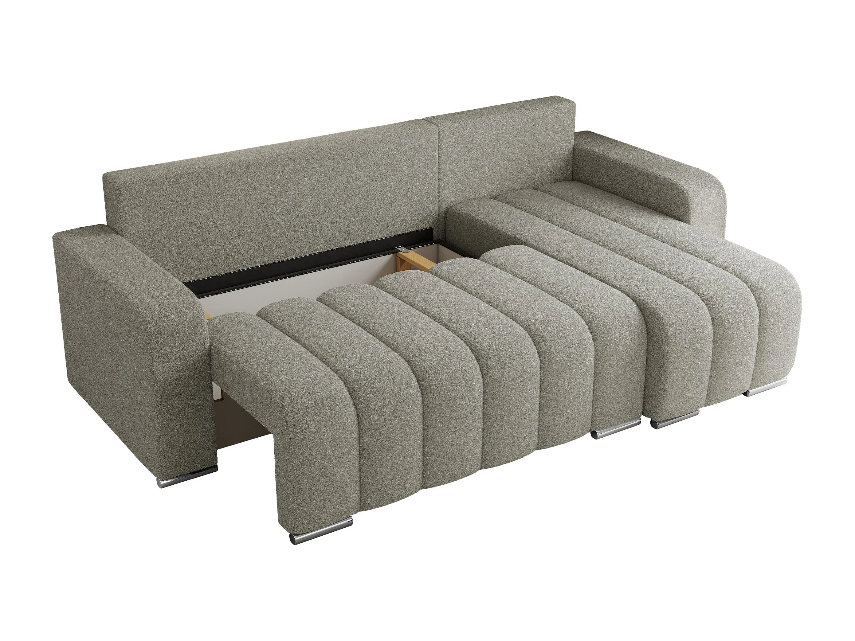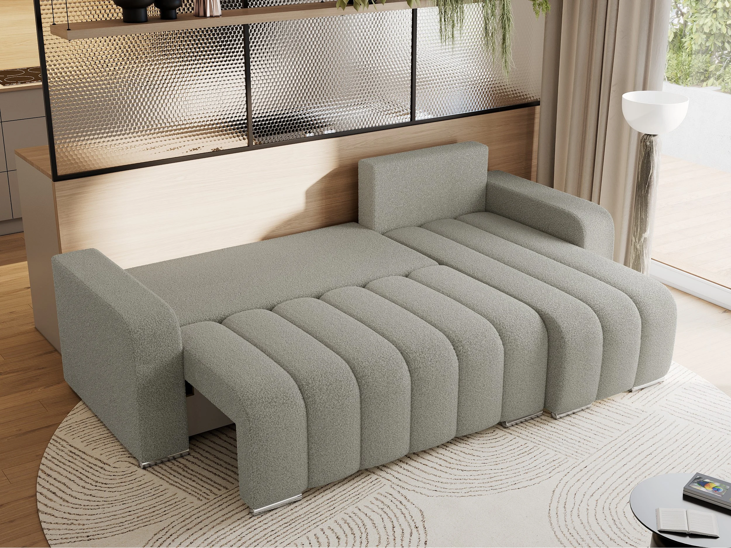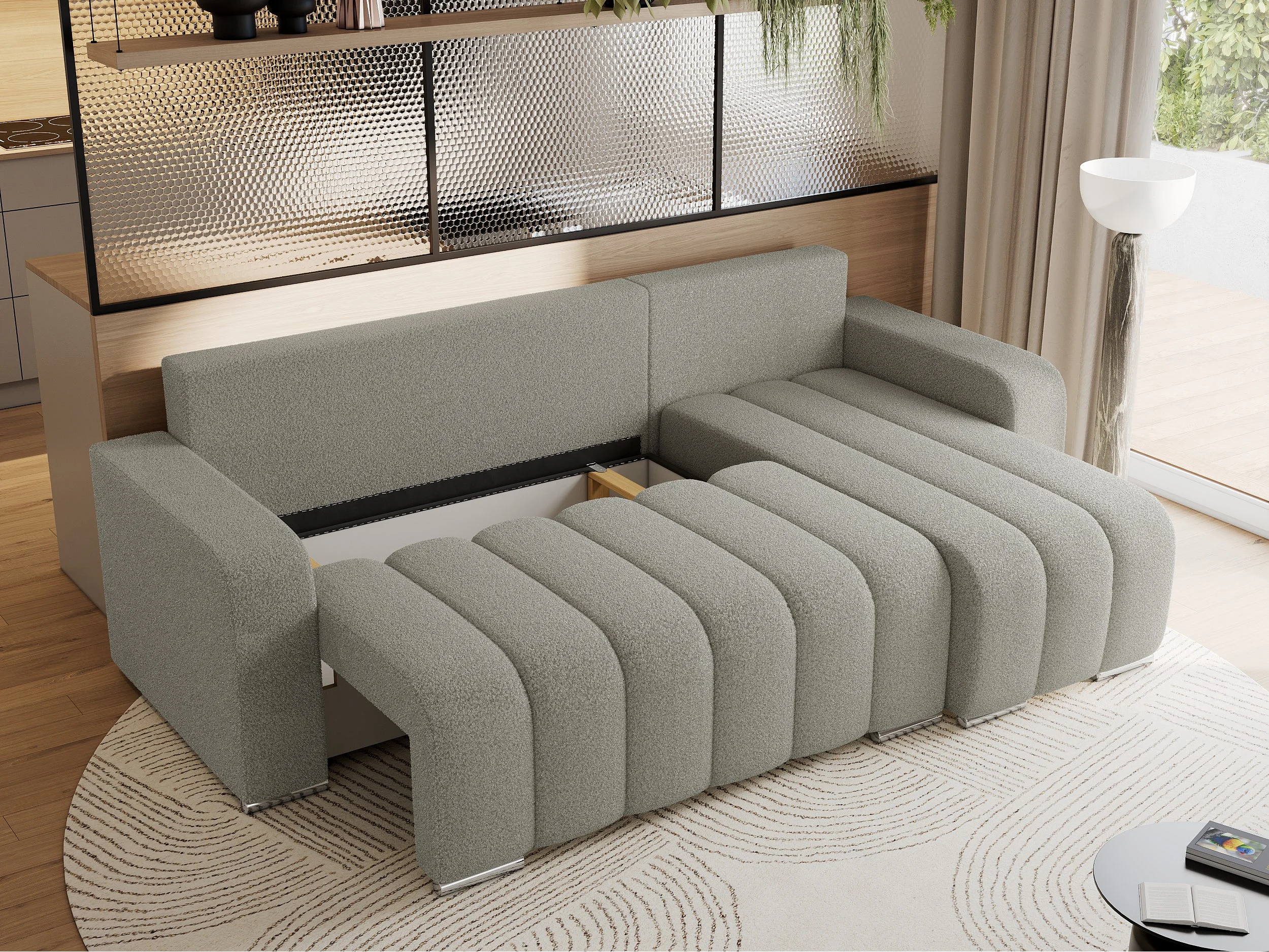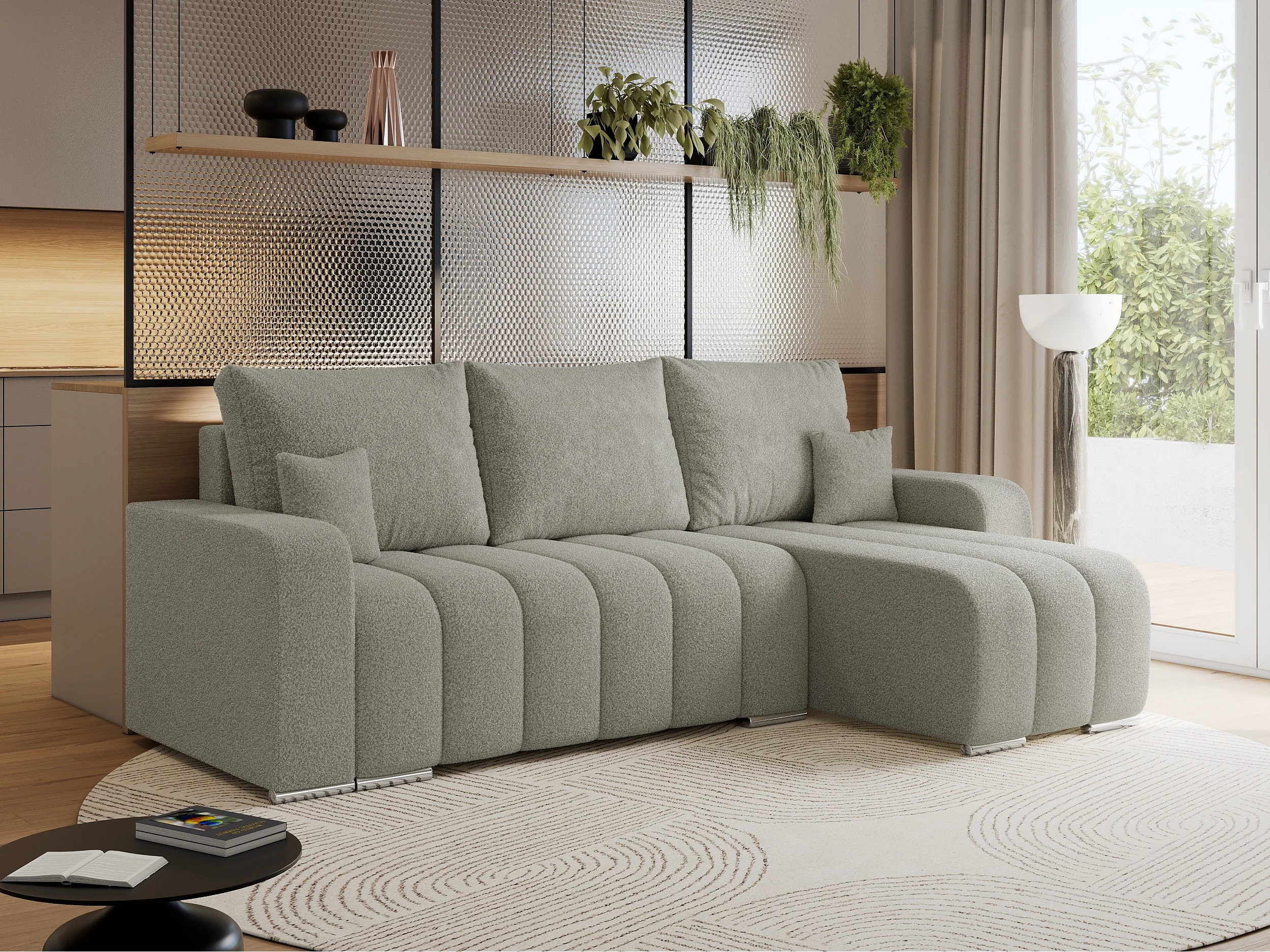 Ecksofa KIRASSO - universelles mit Schlaffunktion und Bettkasten, lose Kissen, Armlehnen - Hellgrau Boucle