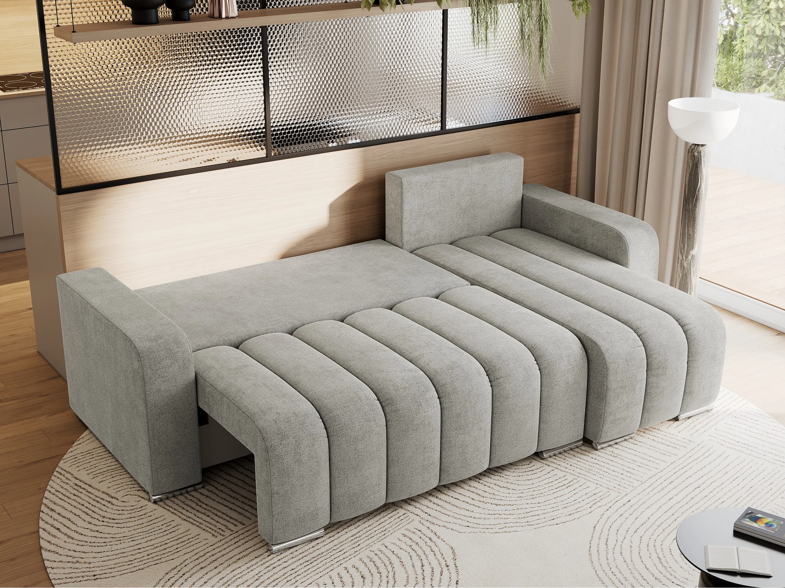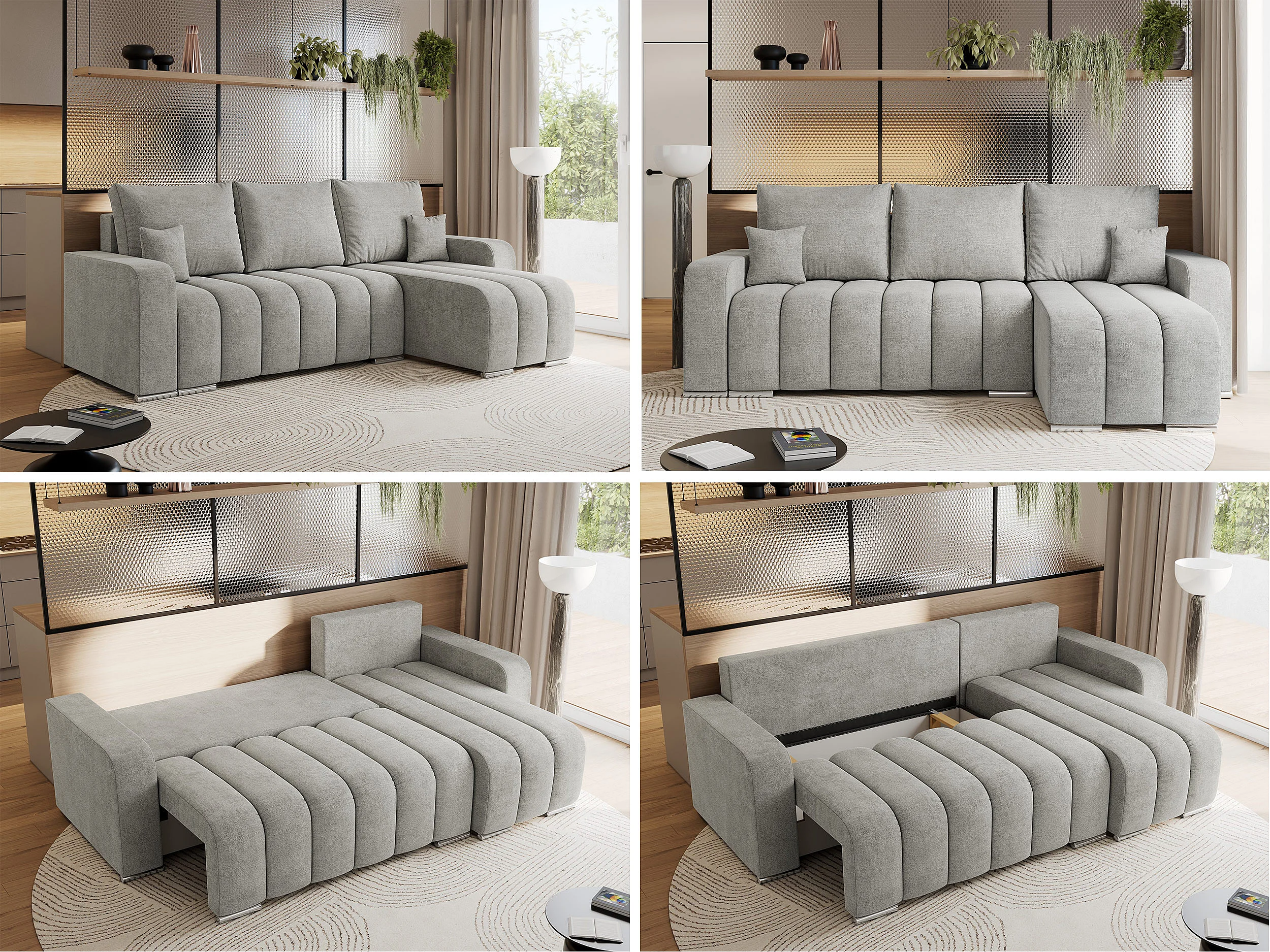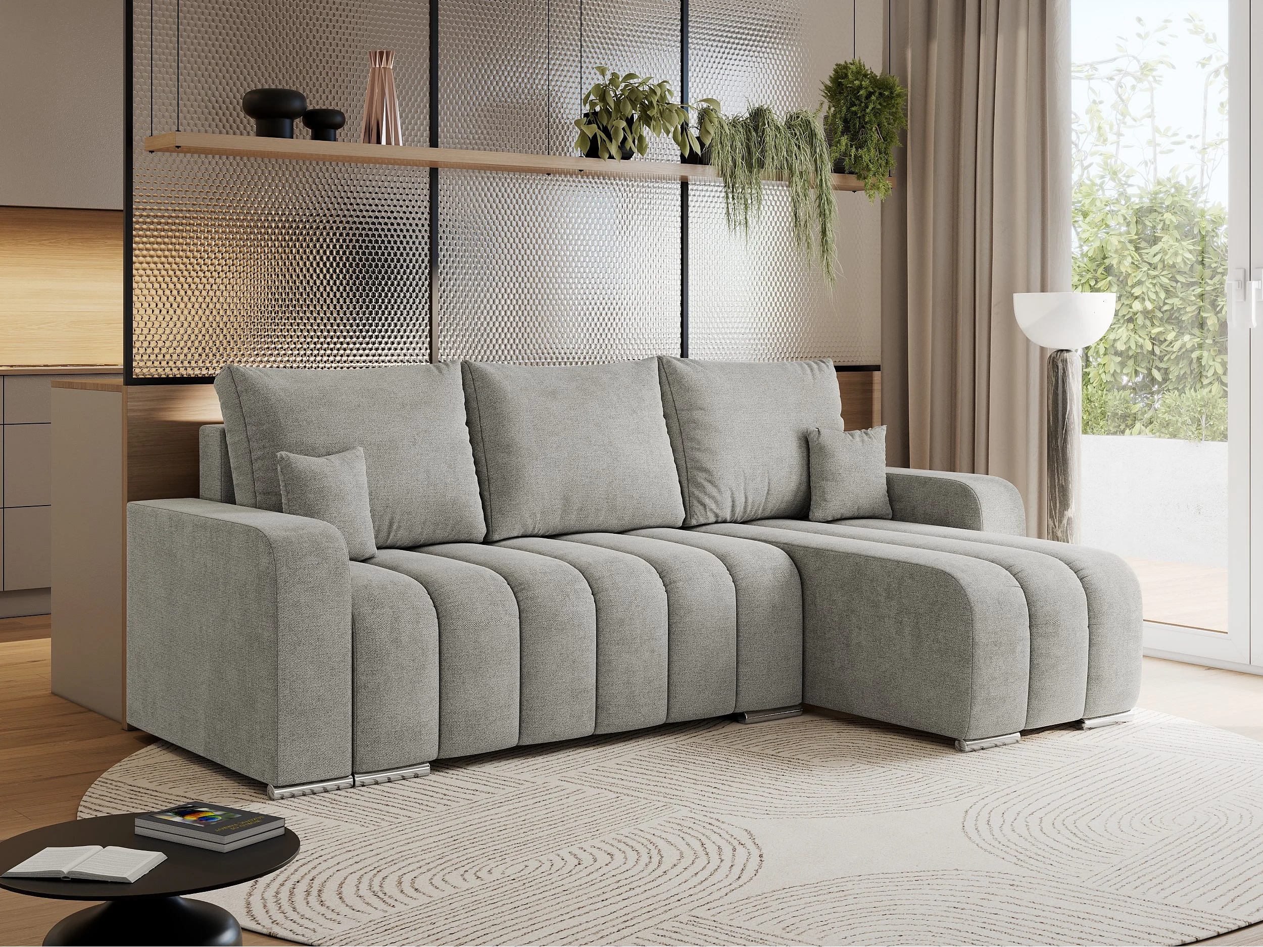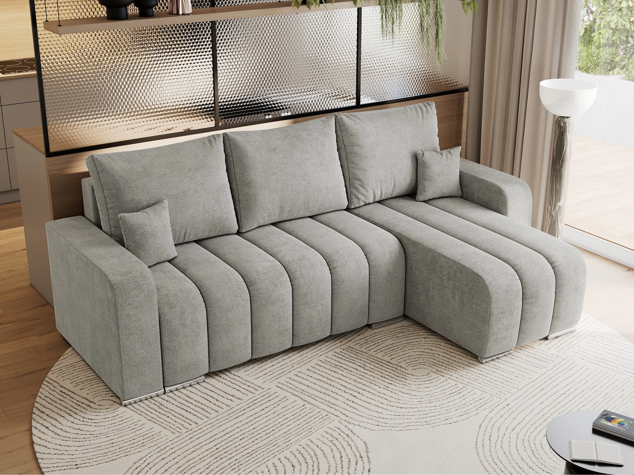 Ecksofa KIRASSO - universelles mit Schlaffunktion und Bettkasten, lose Kissen, Armlehnen - Hellgrau Stukture