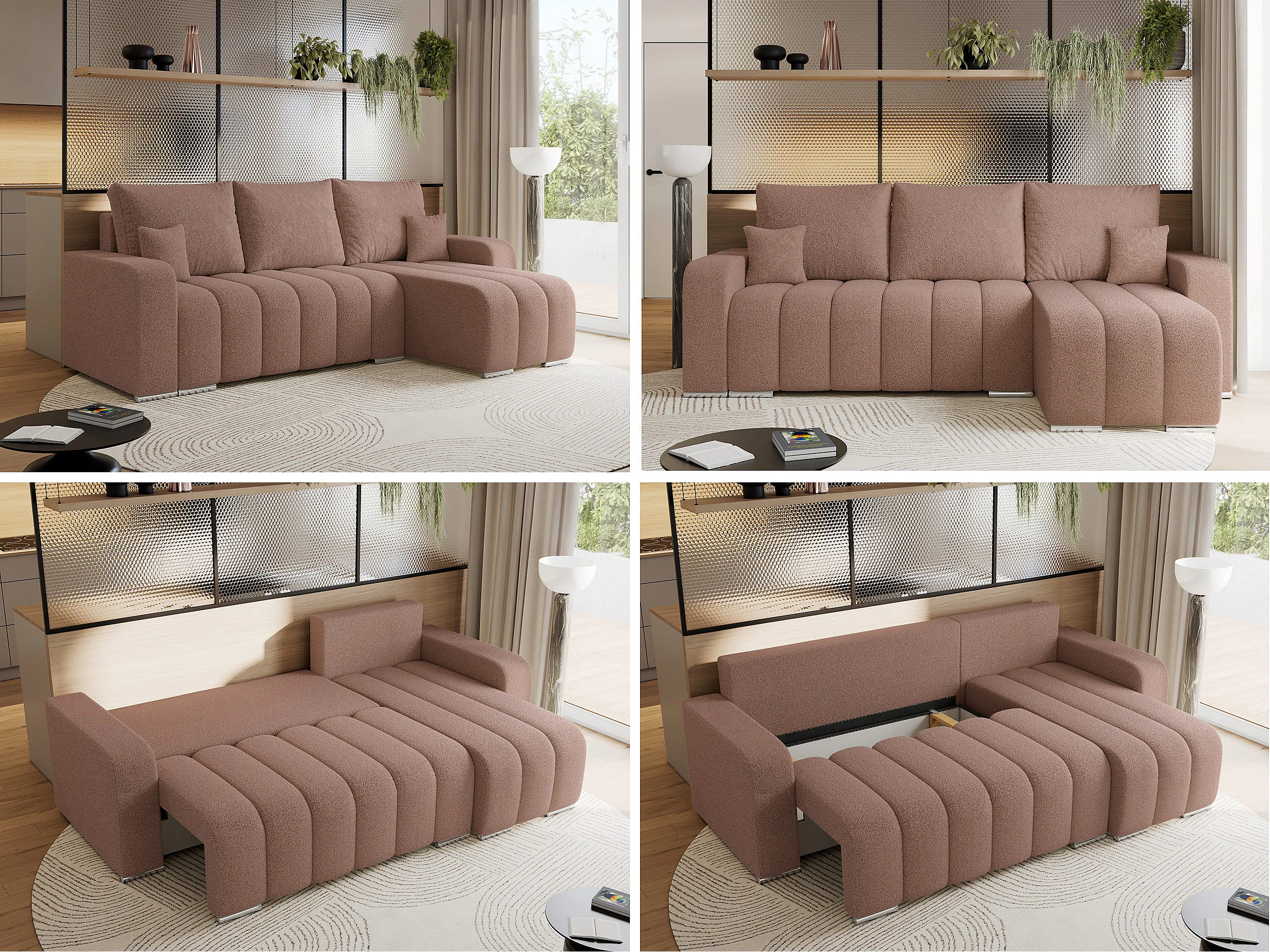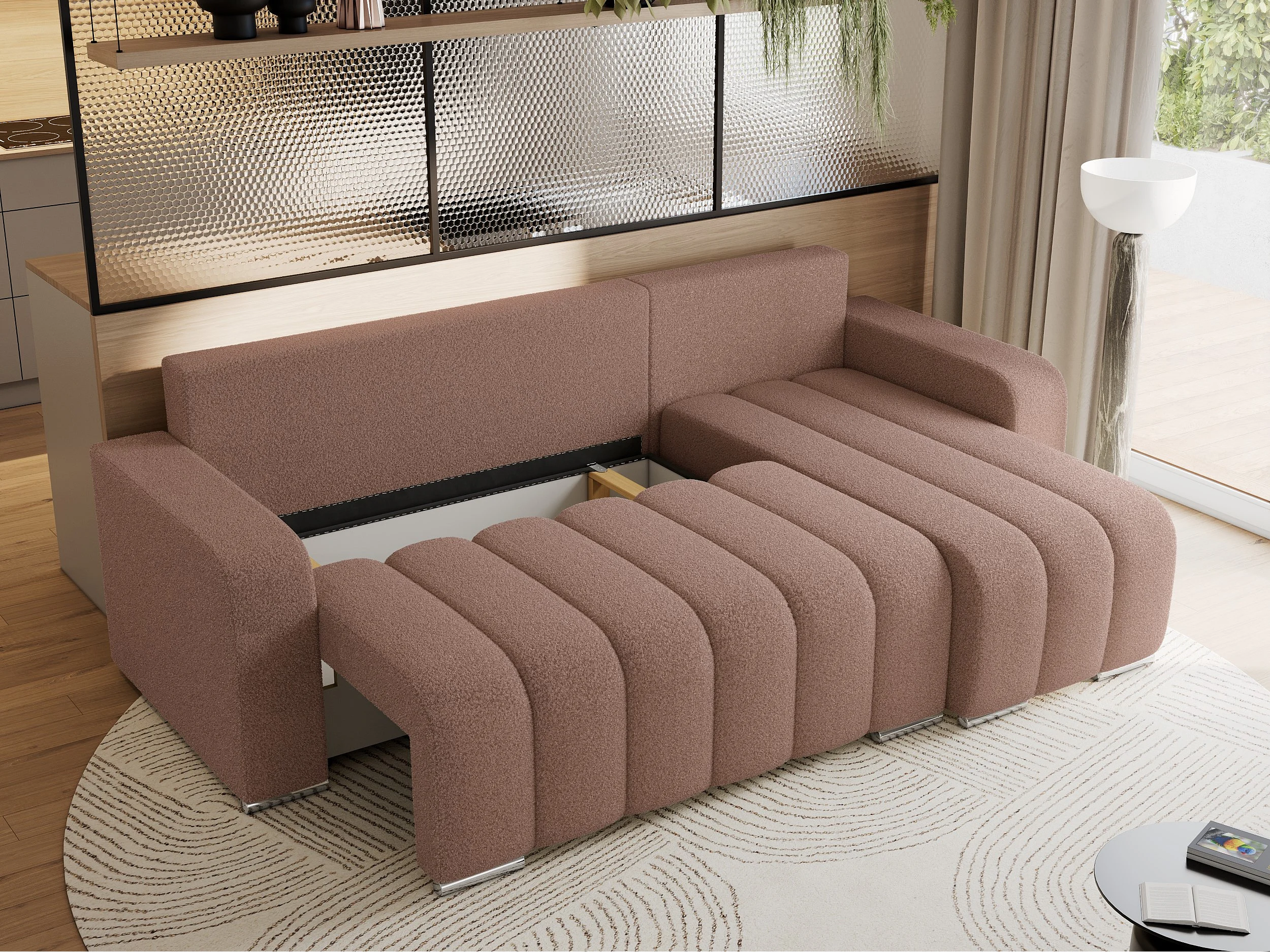 Ecksofa KIRASSO - universelles mit Schlaffunktion und Bettkasten, lose Kissen, Armlehnen - Rosa Boucle