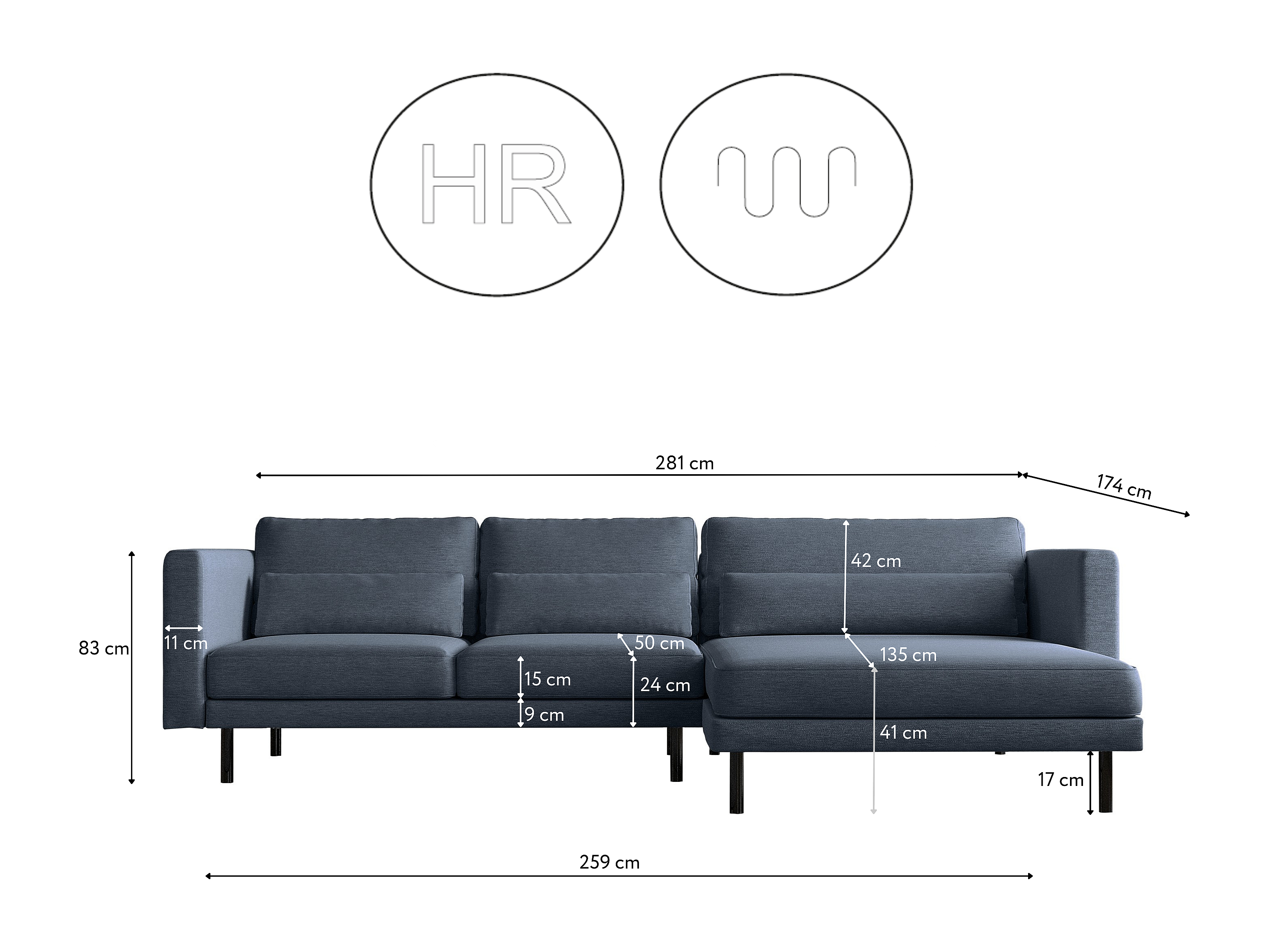 Ecksofa L-form Dani modern und geräumig Stoff Verita Marineblau Rechts