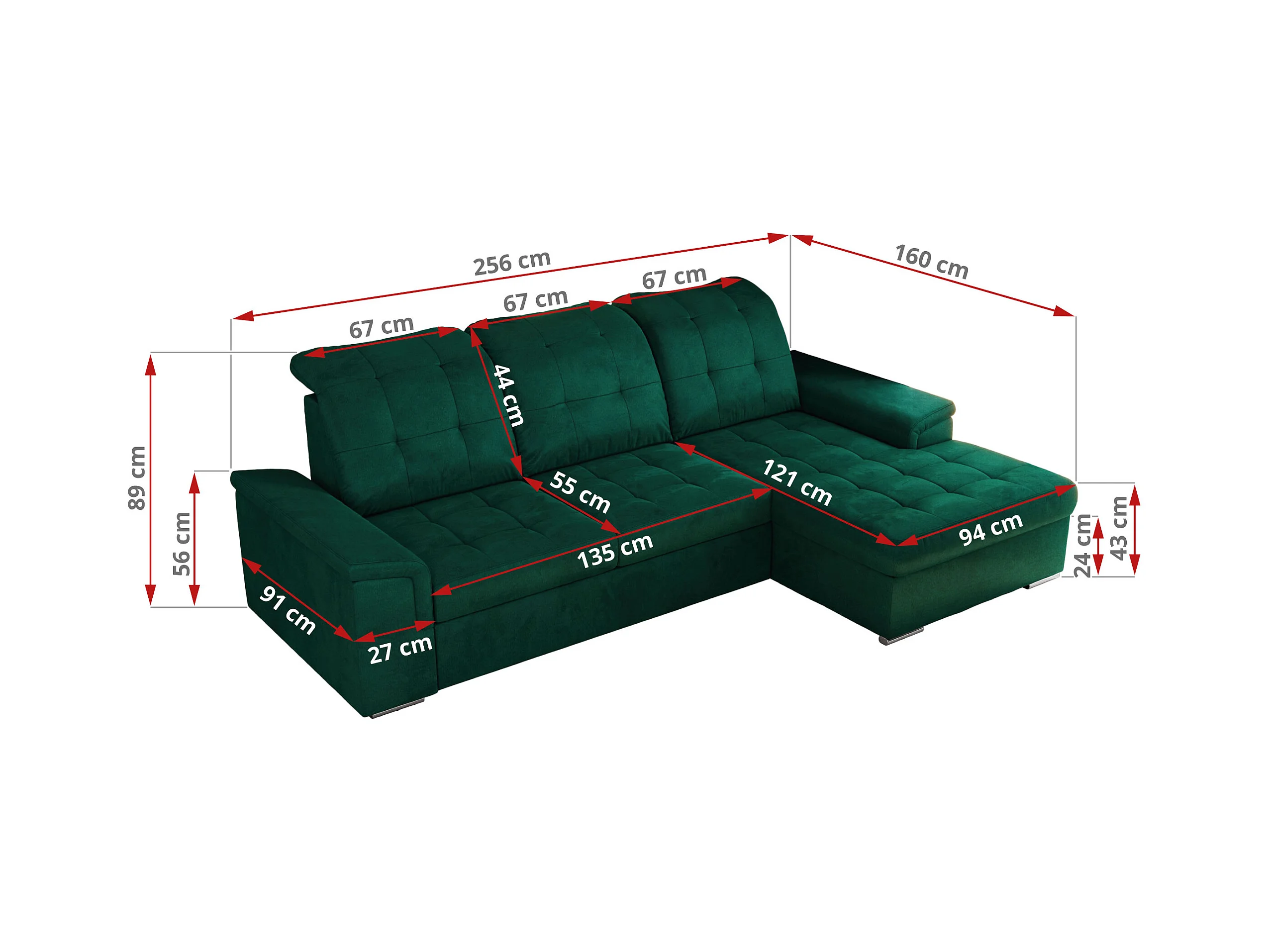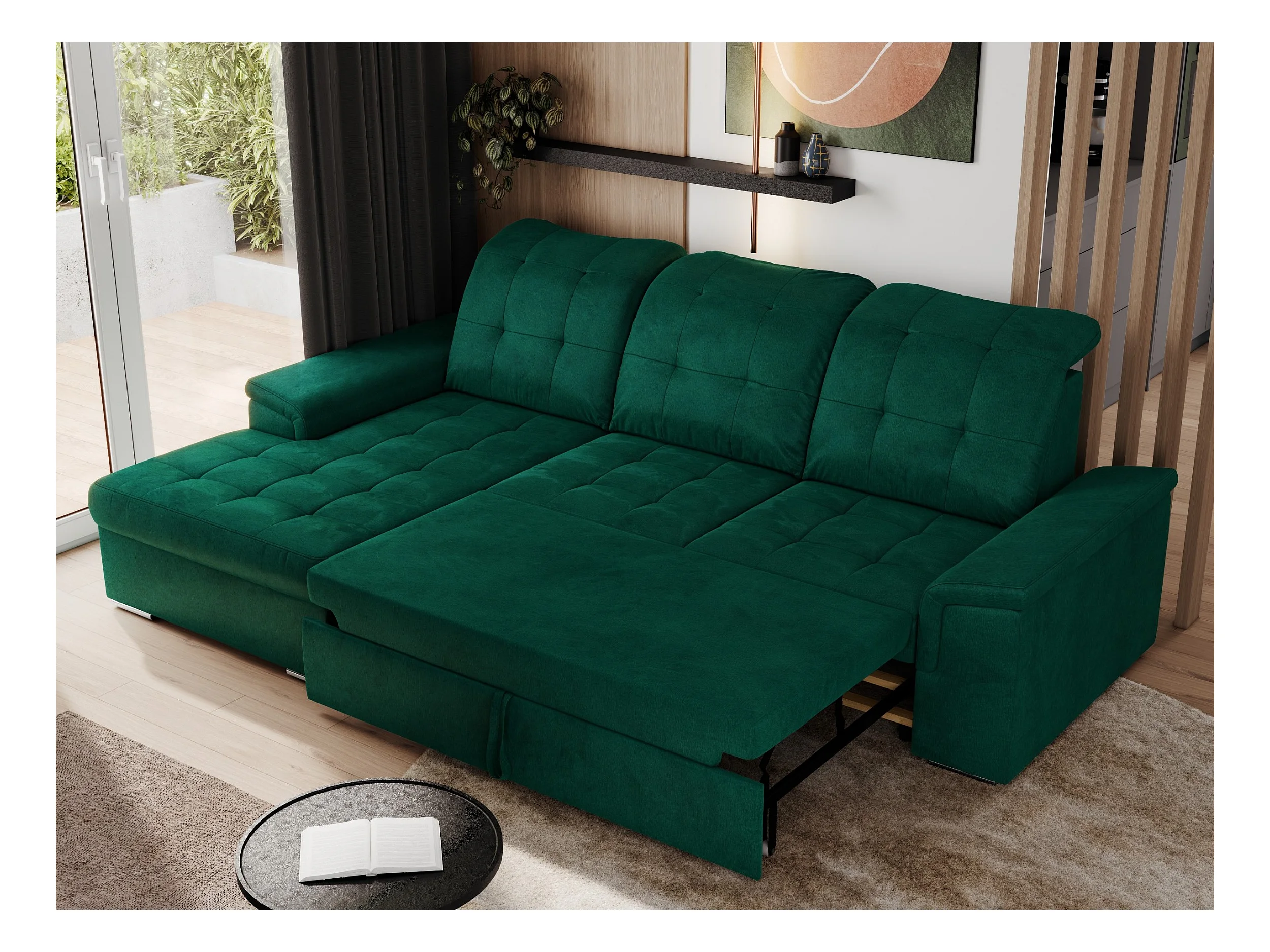 Ecksofa MADRITO - mit verstellbarer Rückenlehne, Armlehnen, gestepptem Sitz und Rückenlehne, Schlaffunktion - DunkelGrün Velvet - Ecke Links