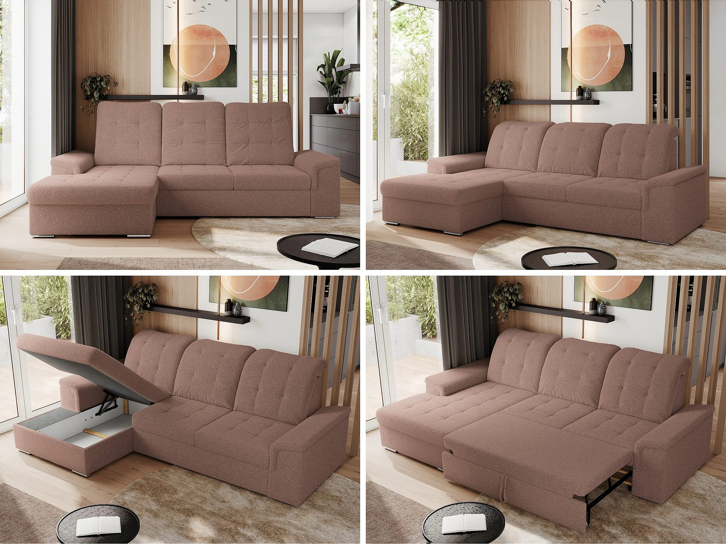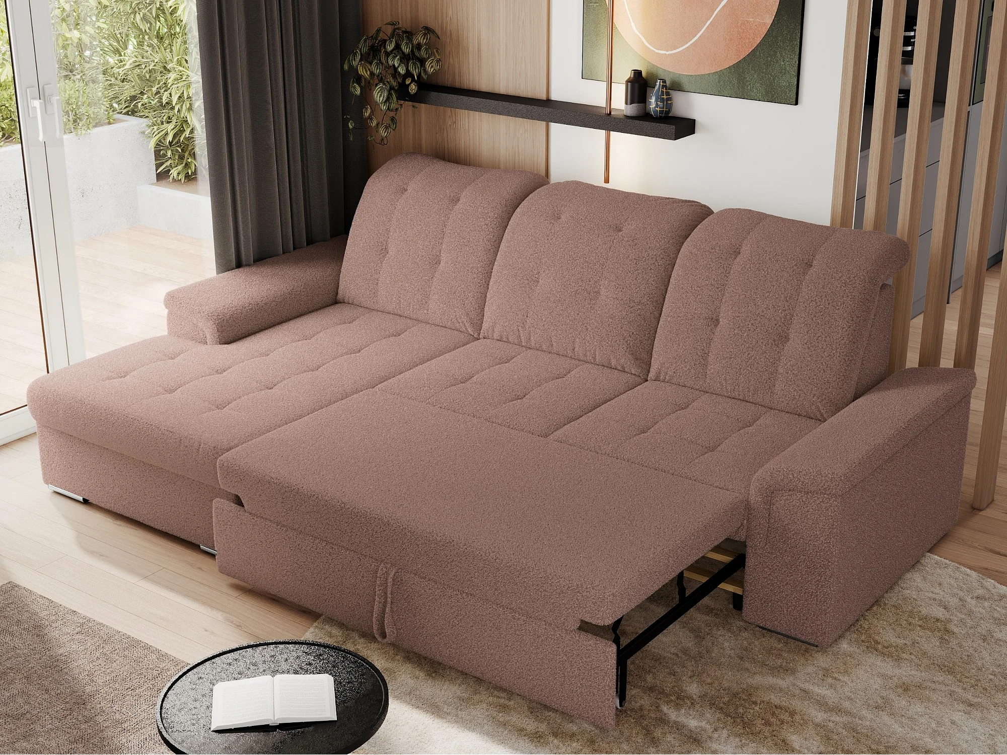 Ecksofa MADRITO - mit verstellbarer Rückenlehne, Armlehnen, gestepptem Sitz und Rückenlehne, Schlaffunktion - Rosa Boucle - Ecke Links