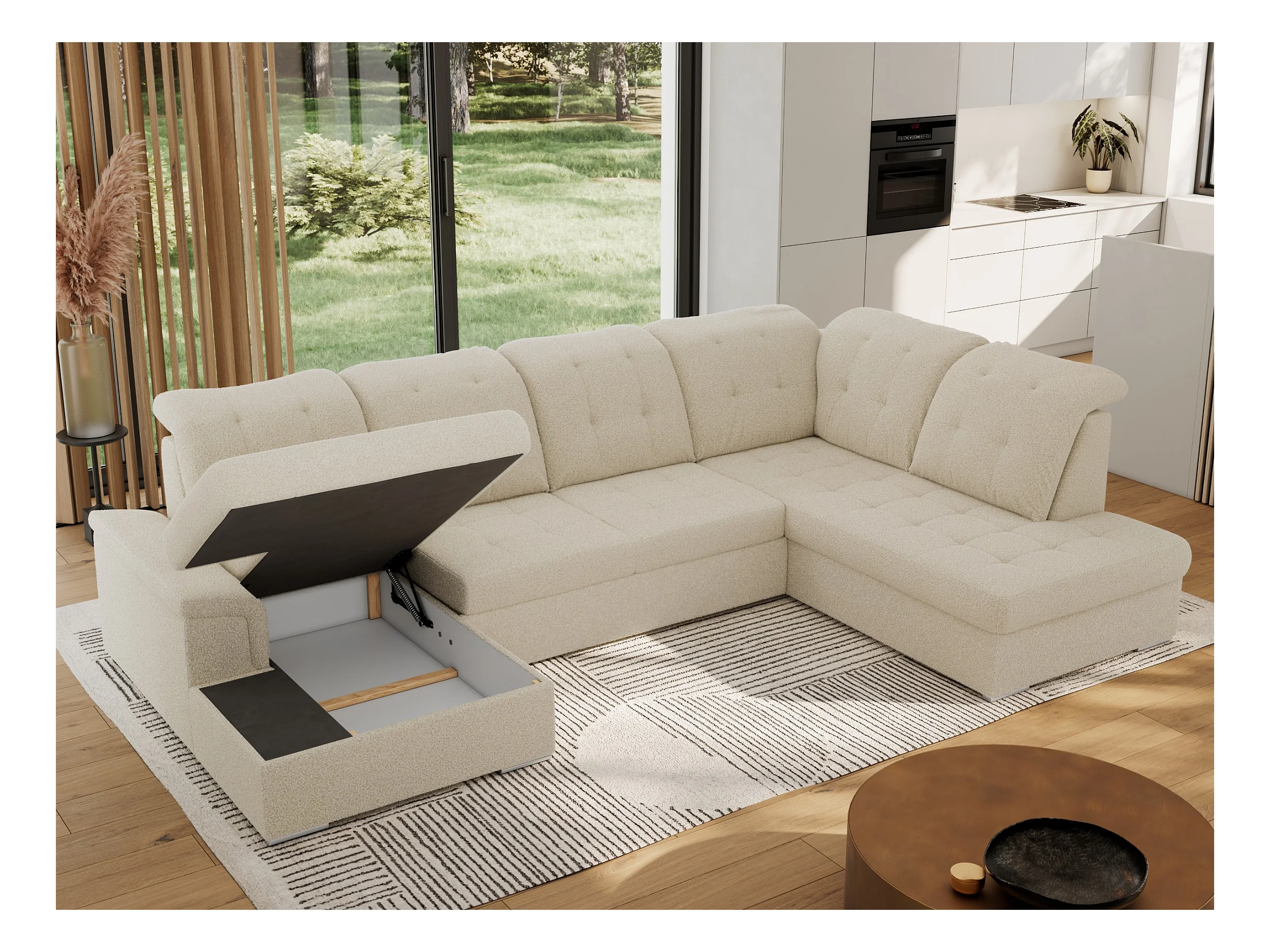 Ecksofa MADRITO U - mit verstellbarer Rückenlehne, Armlehne, L-förmige Ecke, Bettkasten - Beige Boucle - Ecke Rechts