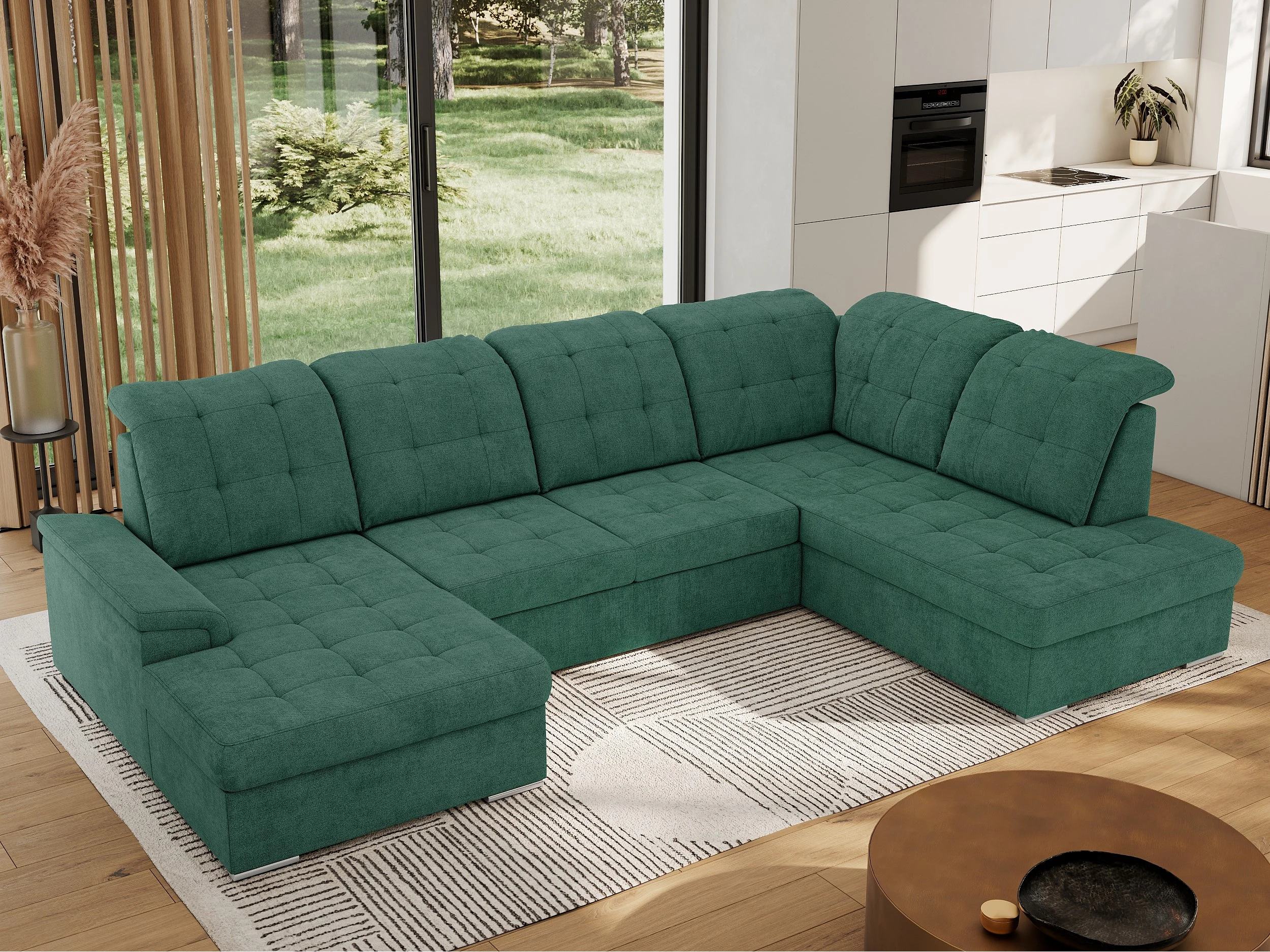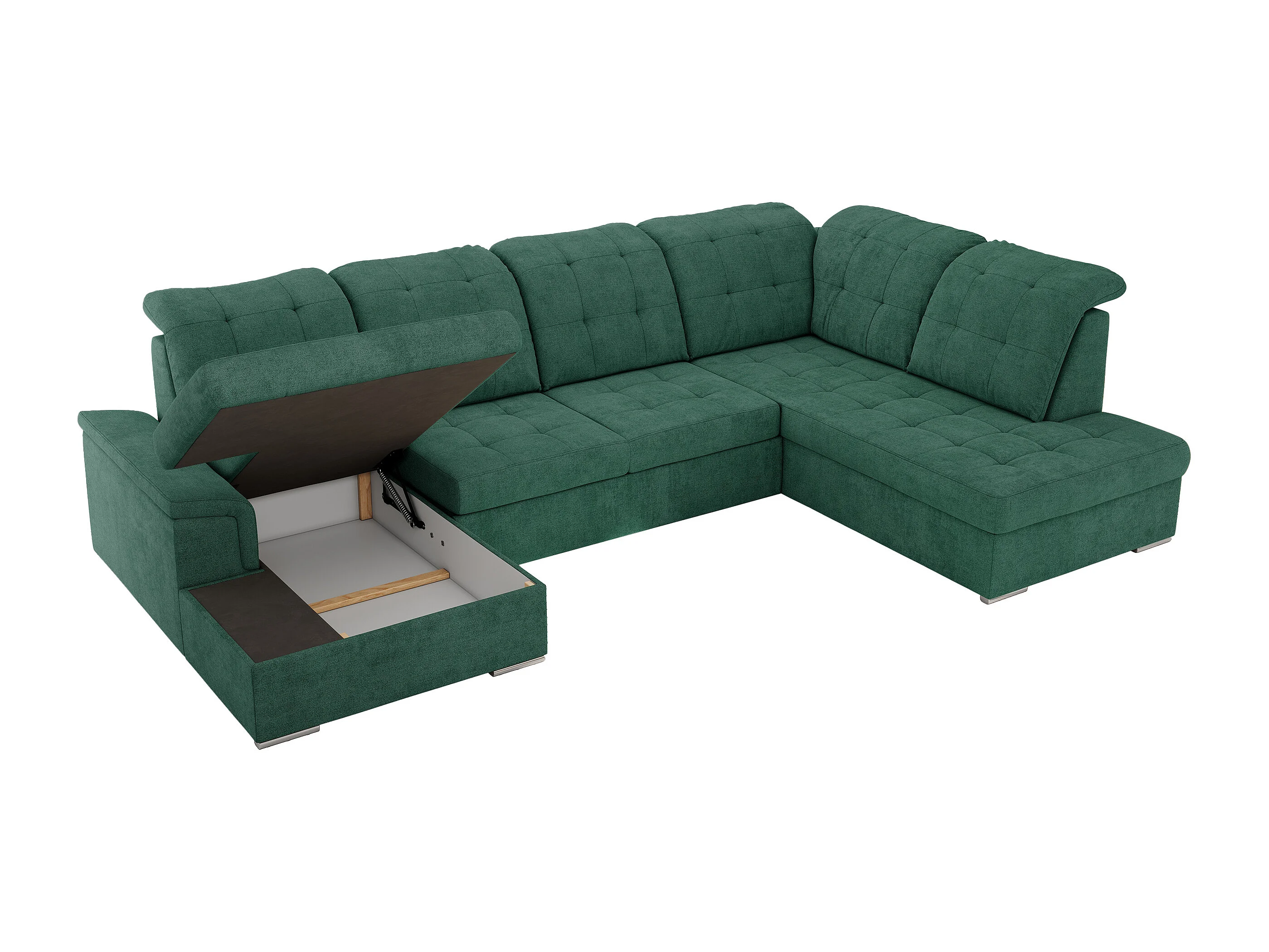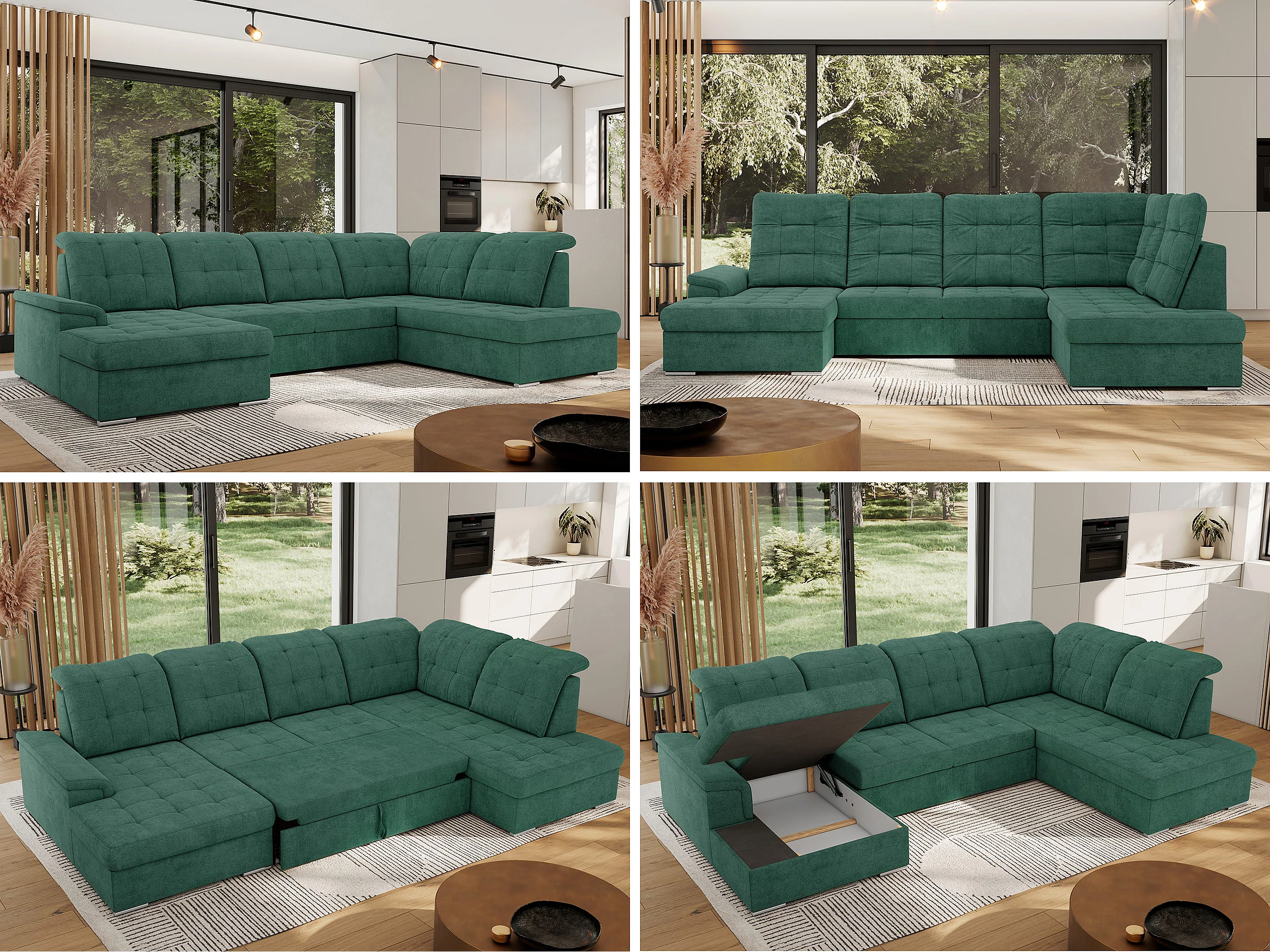 Ecksofa MADRITO U - mit verstellbarer Rückenlehne, Armlehne, L-förmige Ecke, Bettkasten - Grün Struktur - Ecke Rechts