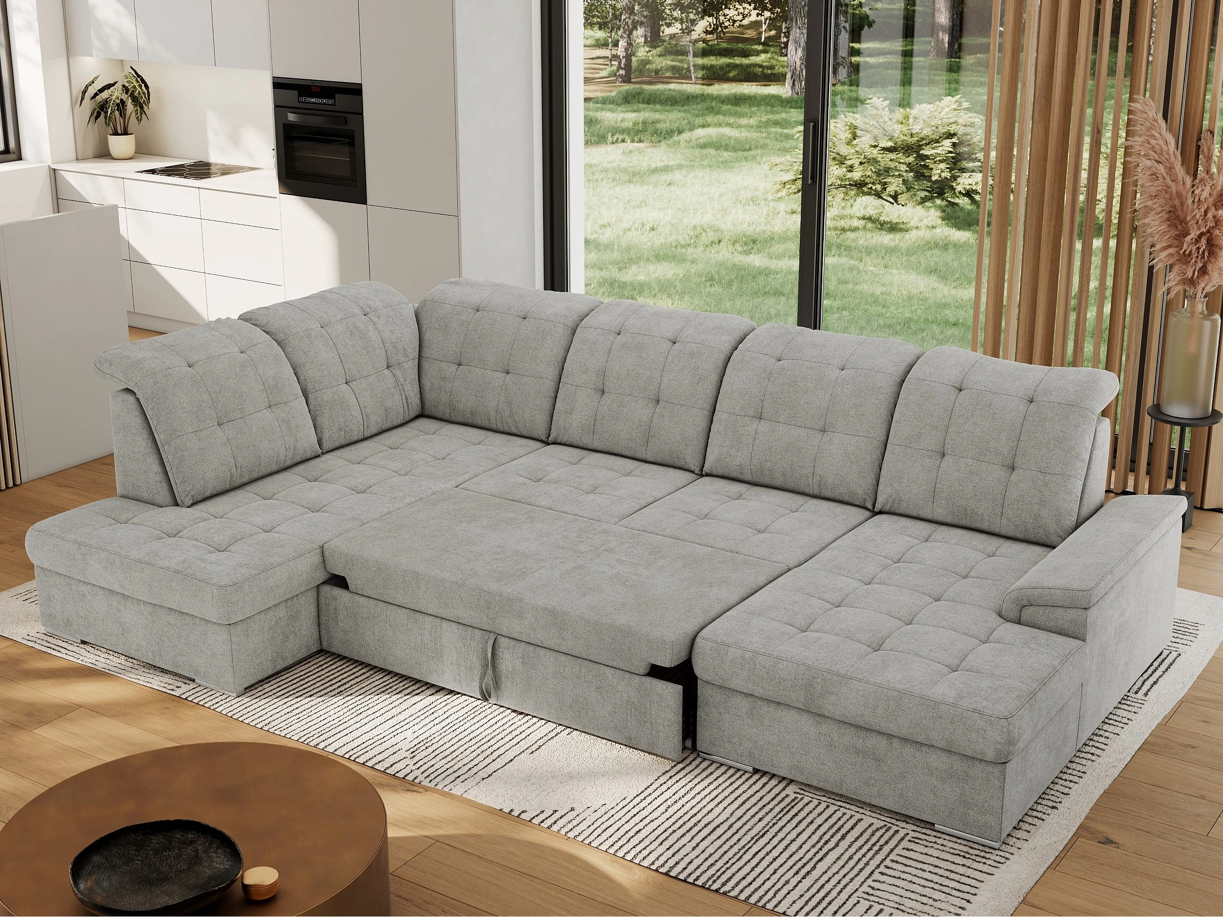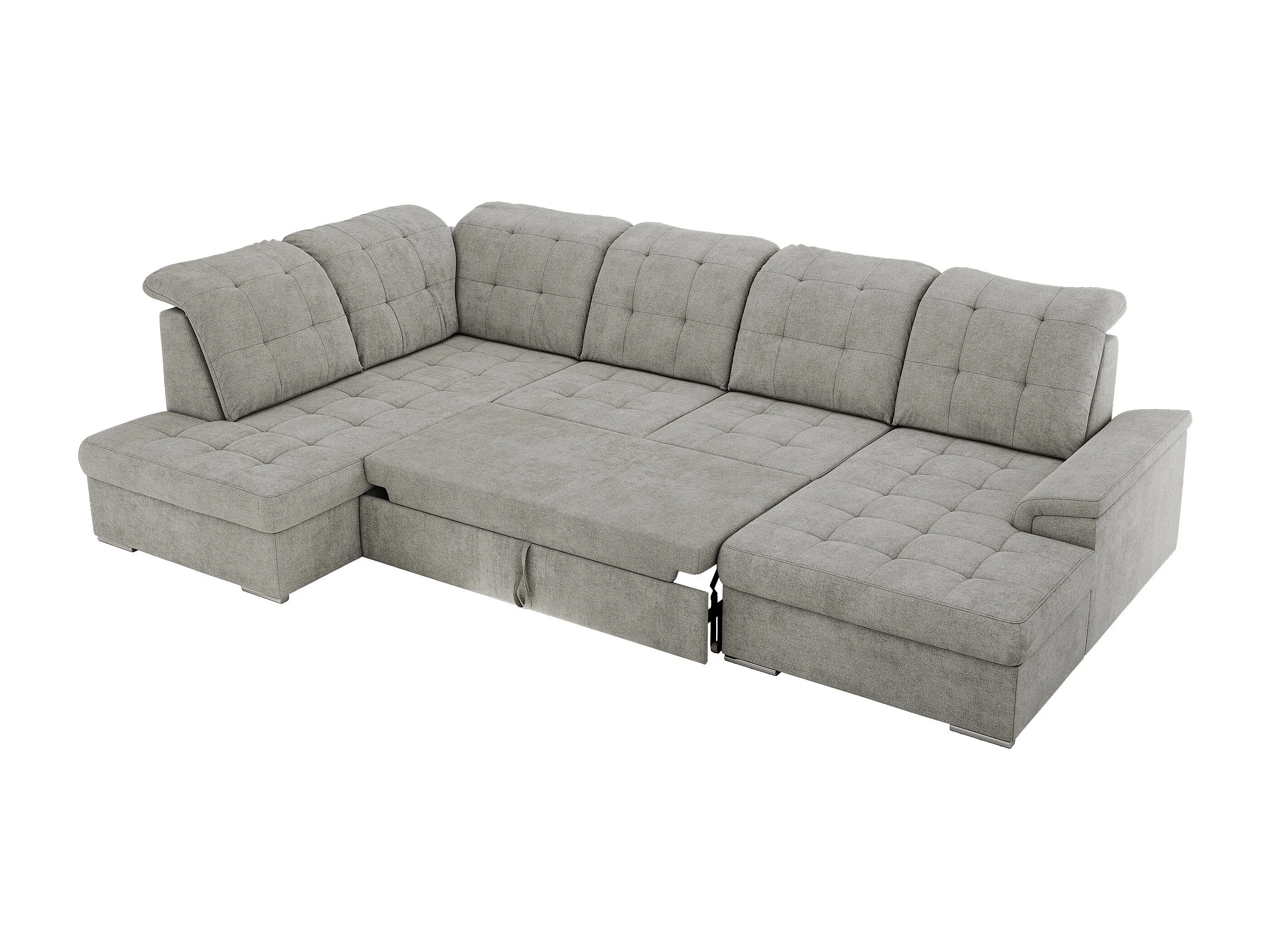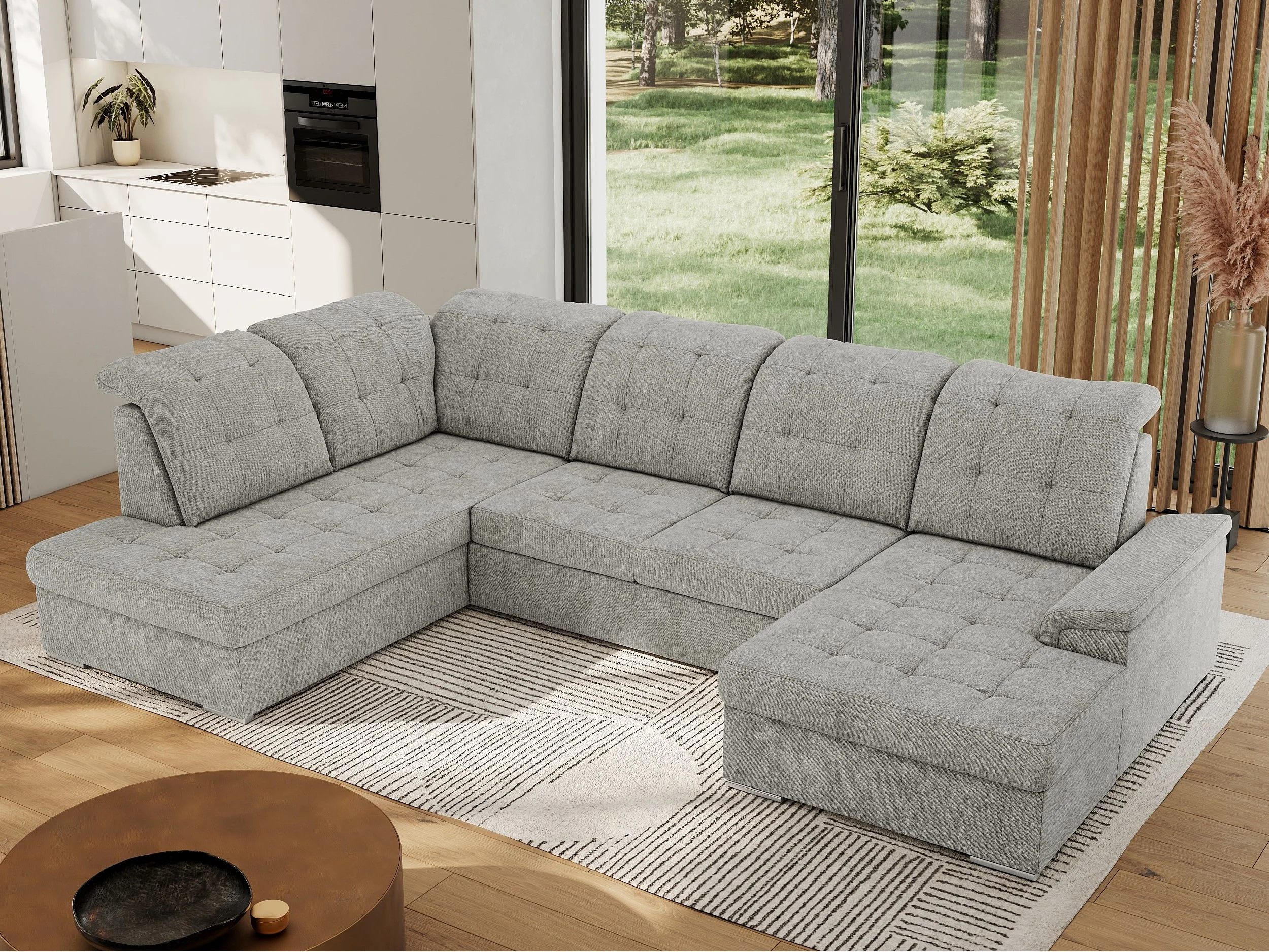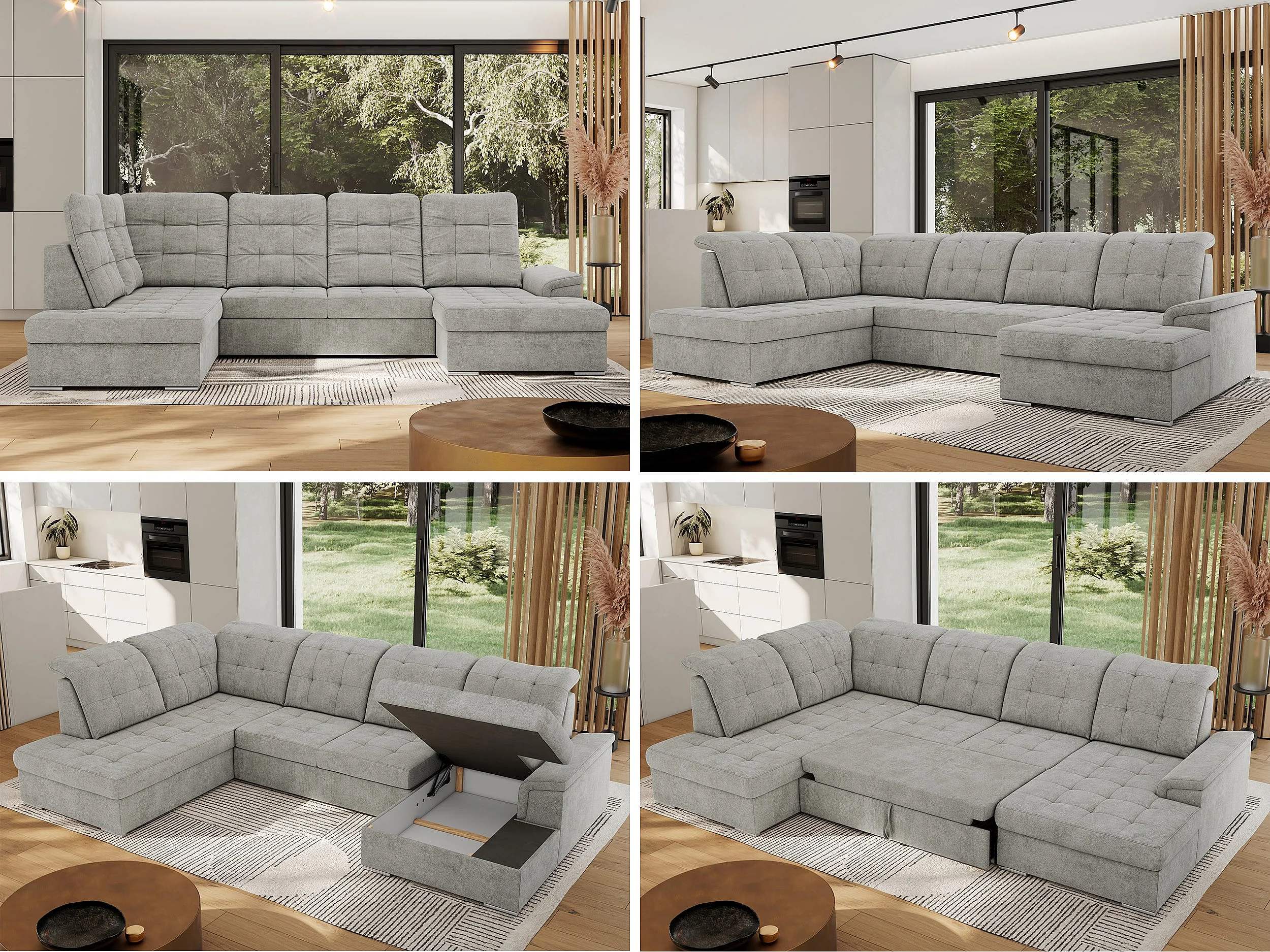 Ecksofa MADRITO U - mit verstellbarer Rückenlehne, Armlehne, L-förmige Ecke, Bettkasten - Hellgrau Struktur - Ecke Links