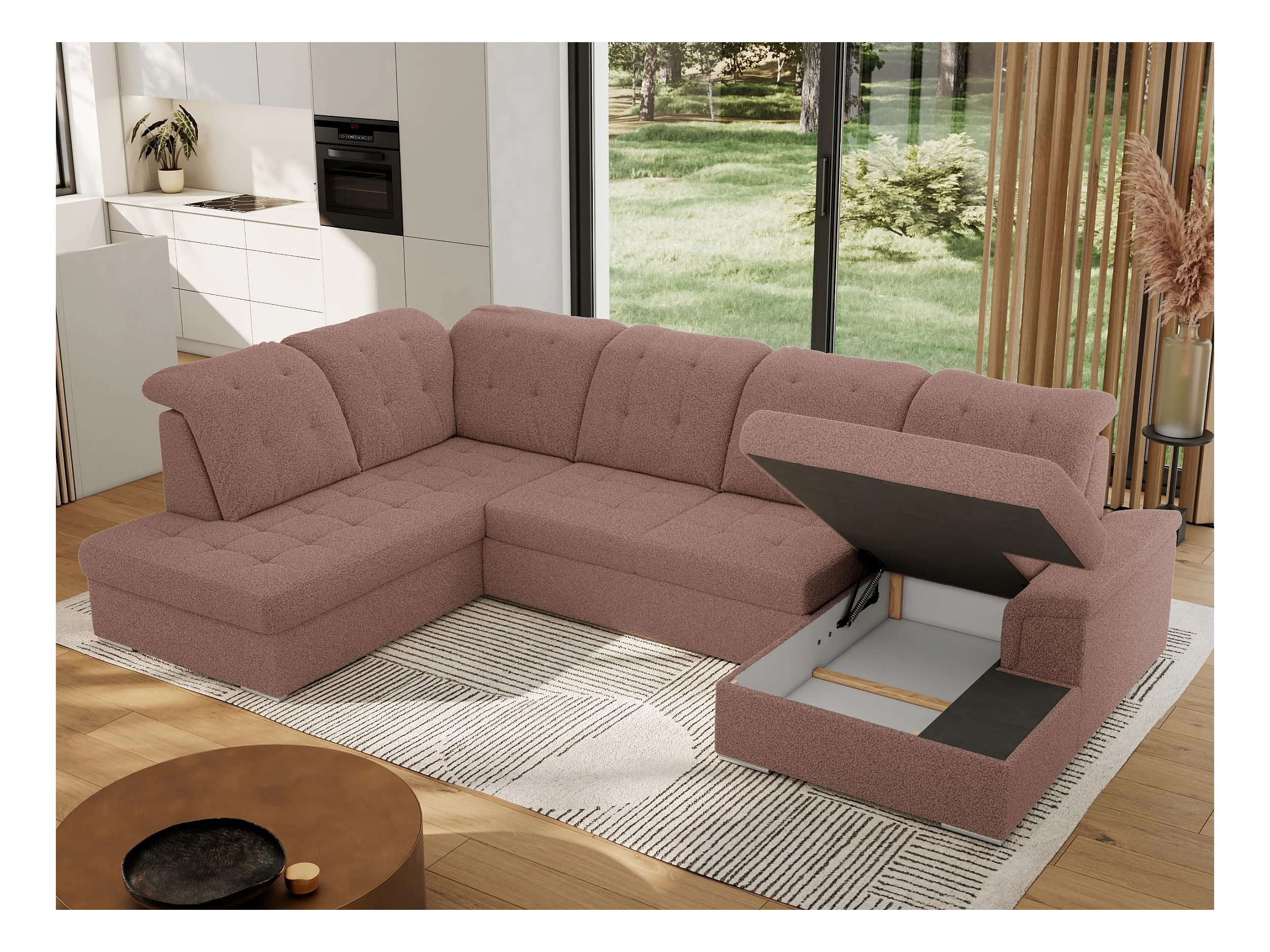 Ecksofa MADRITO U - mit verstellbarer Rückenlehne, Armlehne, L-förmige Ecke, Bettkasten - Rosa Boucle - Ecke Links