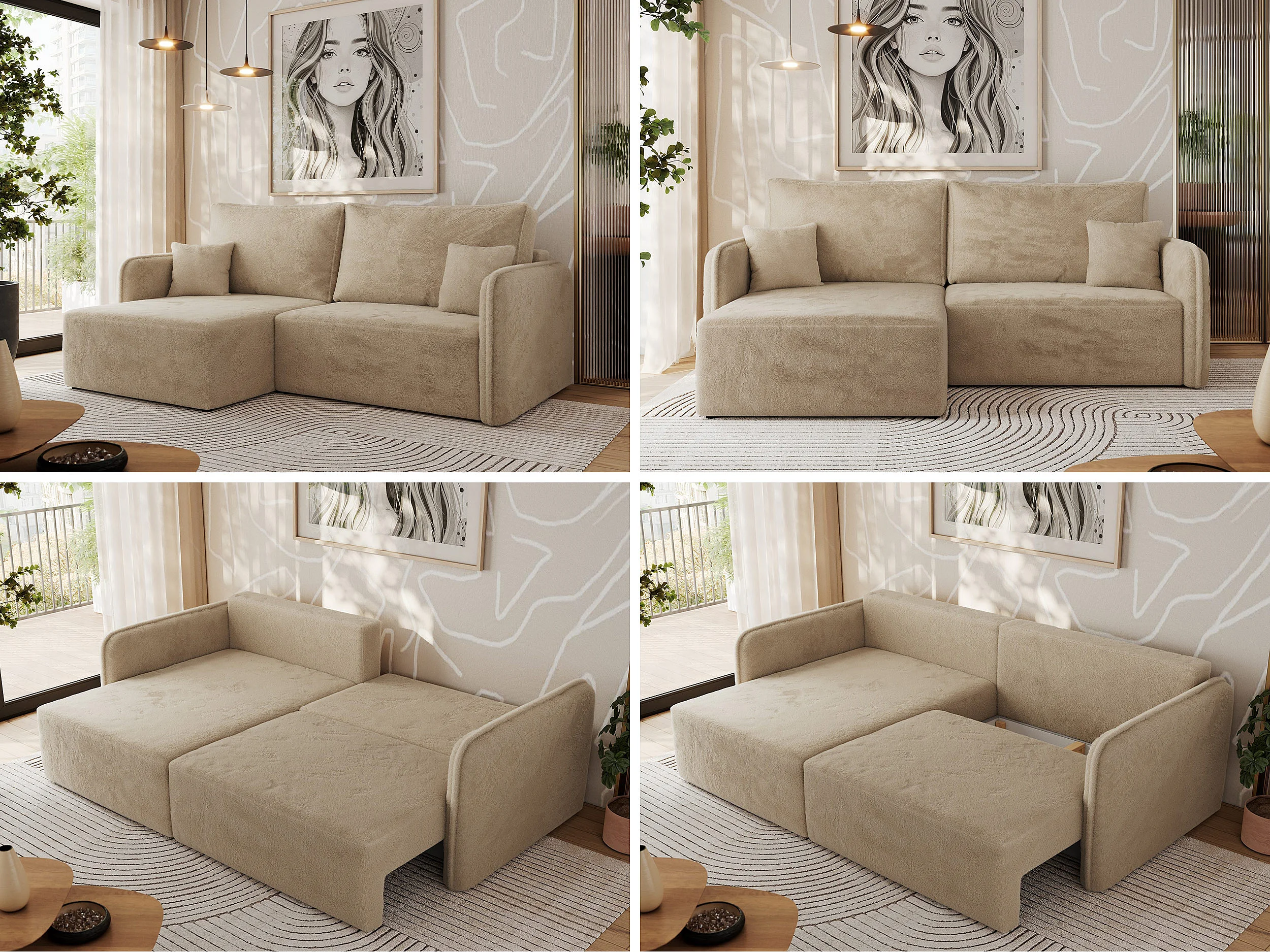 Ecksofa MESTO - Schlaffunktion und Bettkasten, L-form Couch für das Wohnzimmer, Armlehnen - Beige Plüsch - Ecke Links