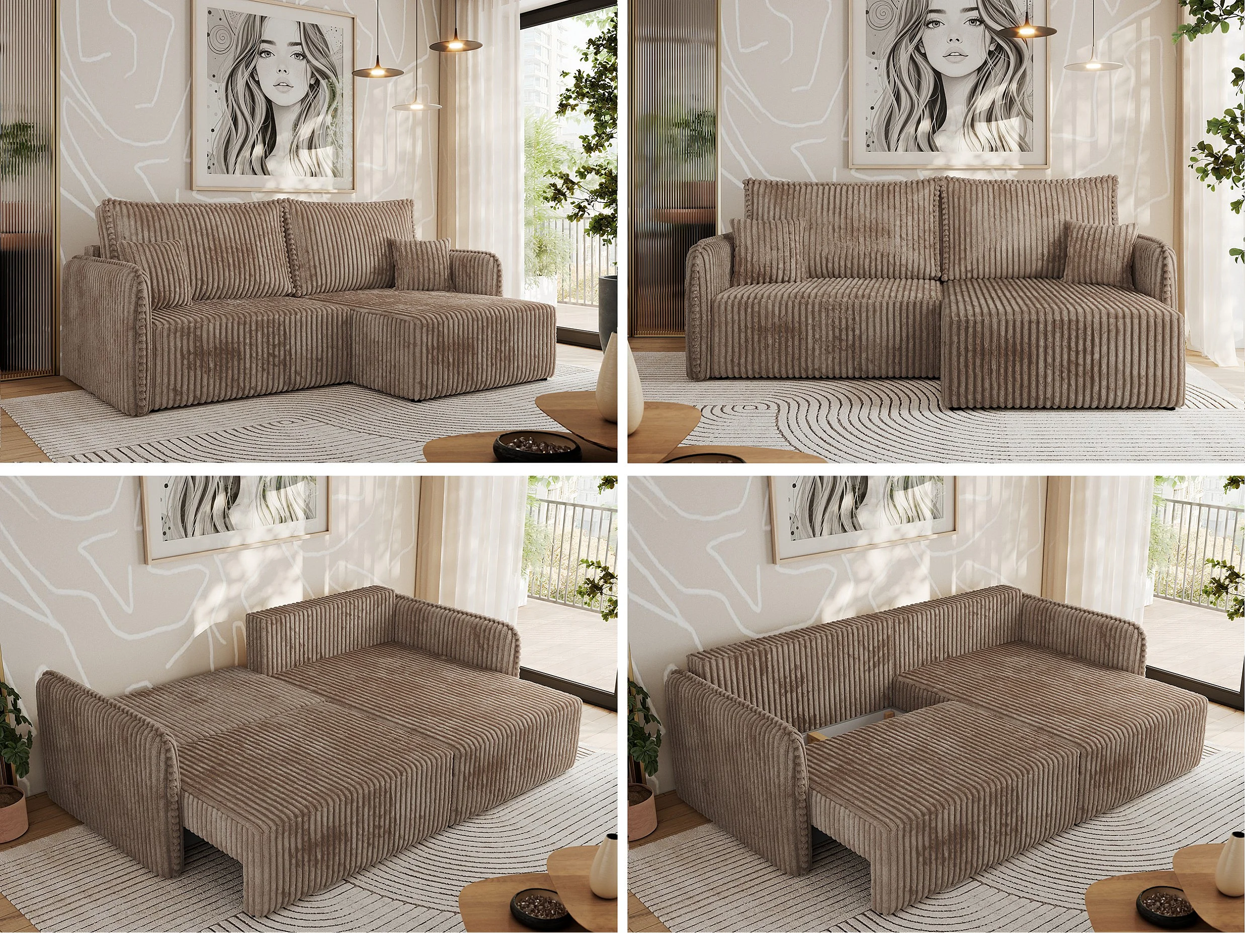 Ecksofa MESTO - Schlaffunktion und Bettkasten, L-form Couch für das Wohnzimmer, Armlehnen - Braun Cord - Ecke Rechts