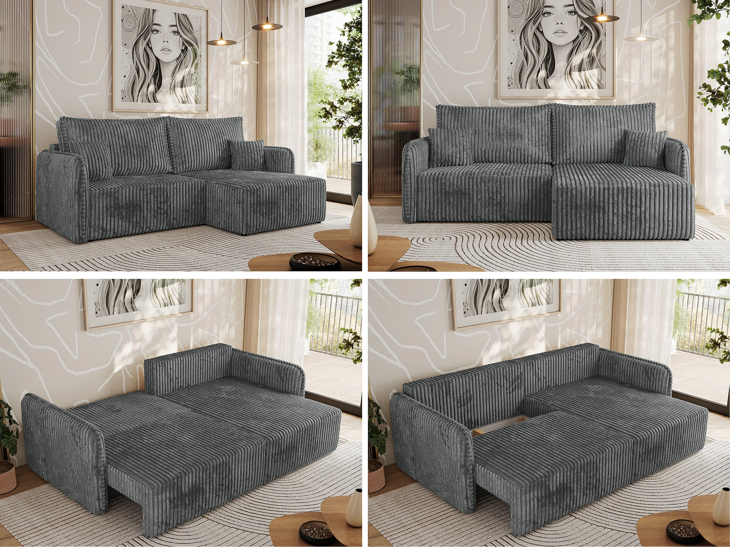 Ecksofa MESTO - Schlaffunktion und Bettkasten, L-form Couch für das Wohnzimmer, Armlehnen - Dunkelgrau Cord - Ecke Rechts
